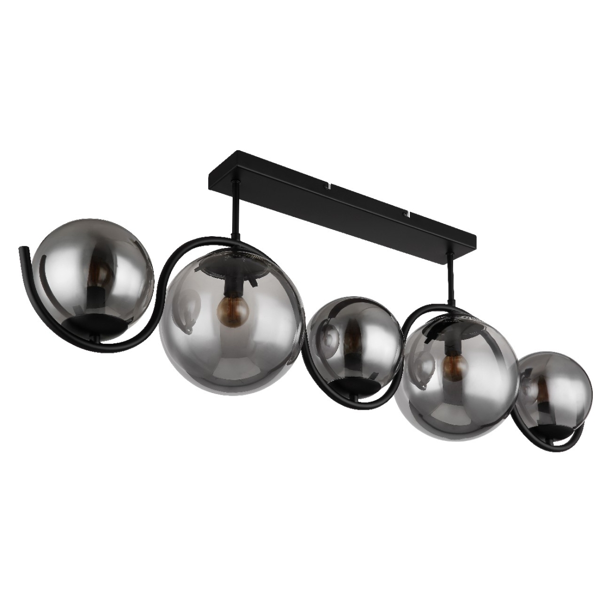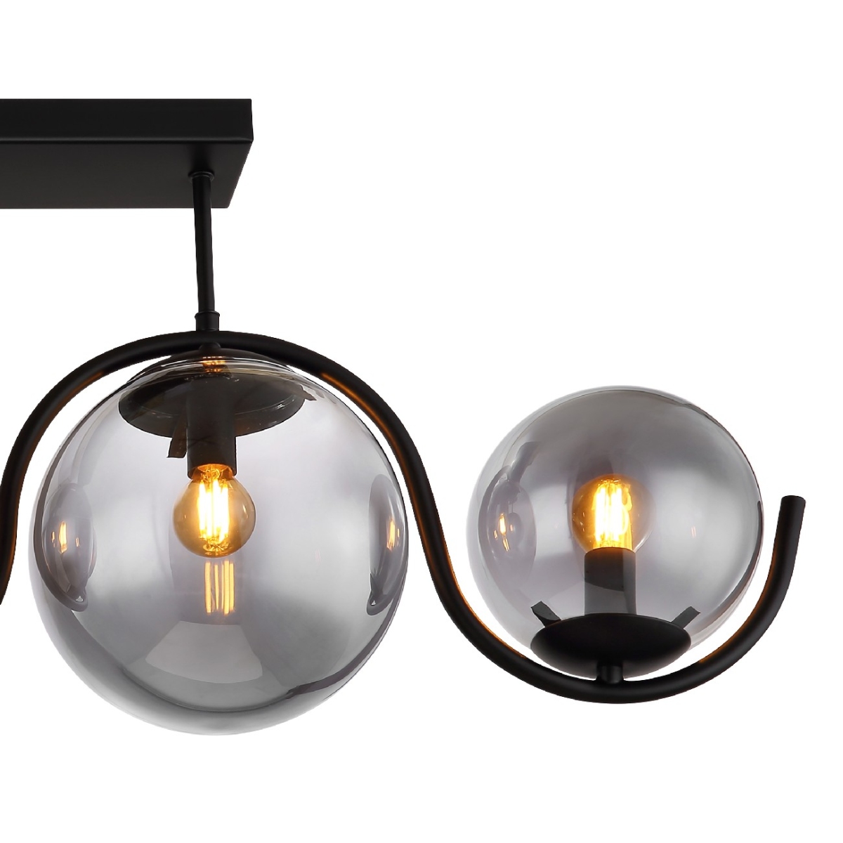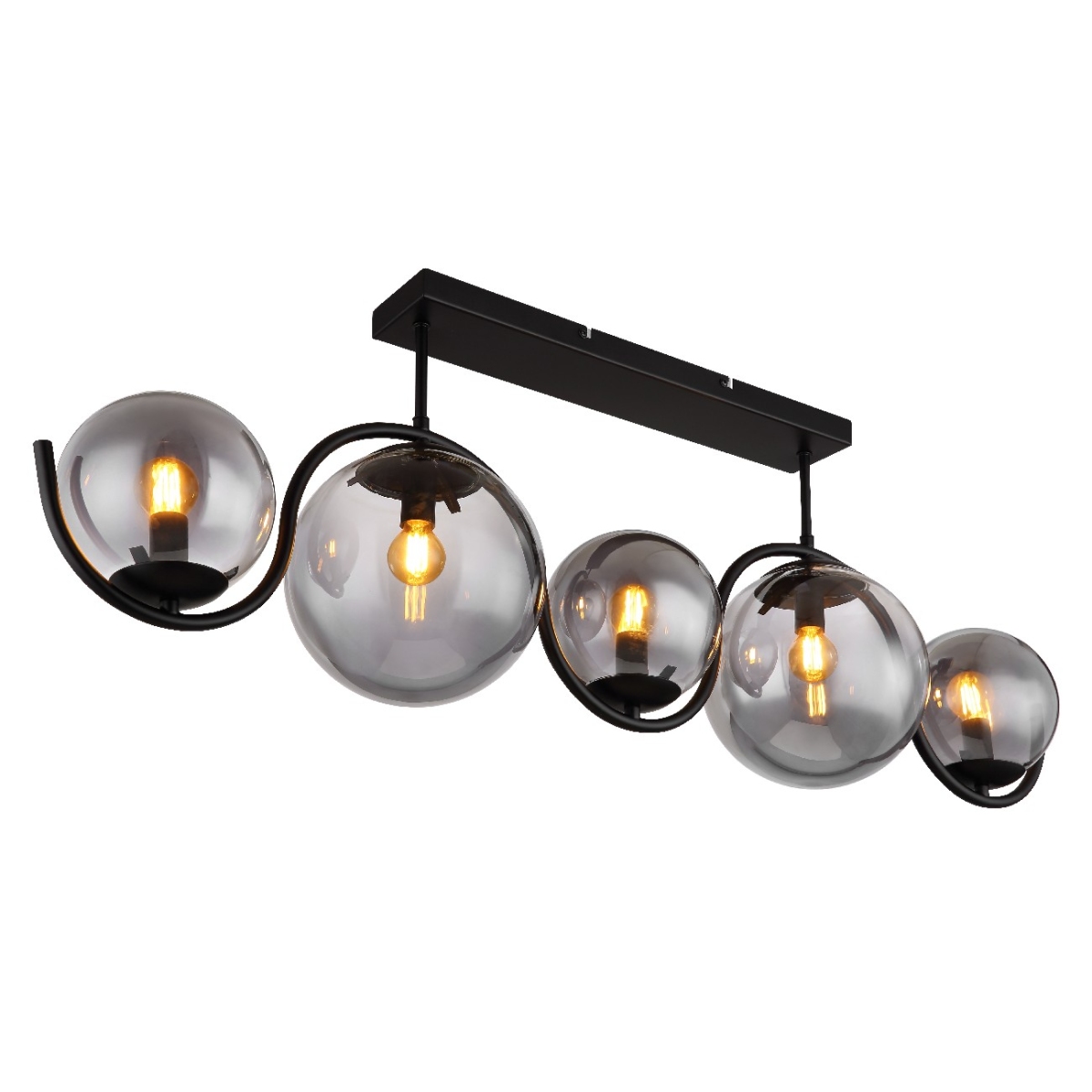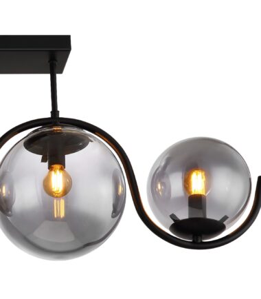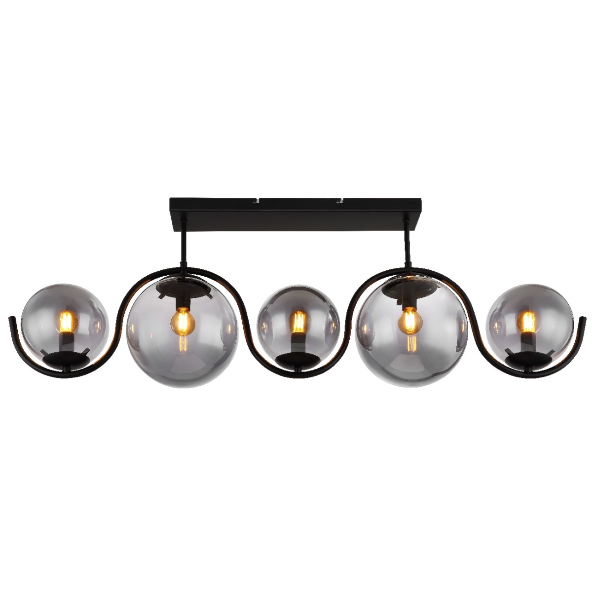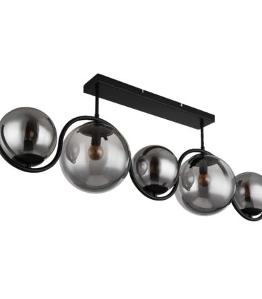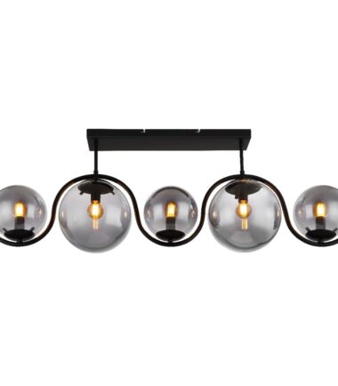 Ova plafonska lampa impresionira sjajnim dizajnom. Dva stuba u crno mat boji proističu iz uskog plafonskog nosača kako bi se formirala metalna šipka u obliku slova S, na kojoj se nalazi pet E14 grla, od kojih svako ima oblikovane staklene abažure u boji dima. E14 grla vam omogućavaju da odredite boju svetla i jačinu do maksimalnog izlaza od 25 vati. Zbog dugovečnosti i uštede energije preporučujemo LED sijalice.