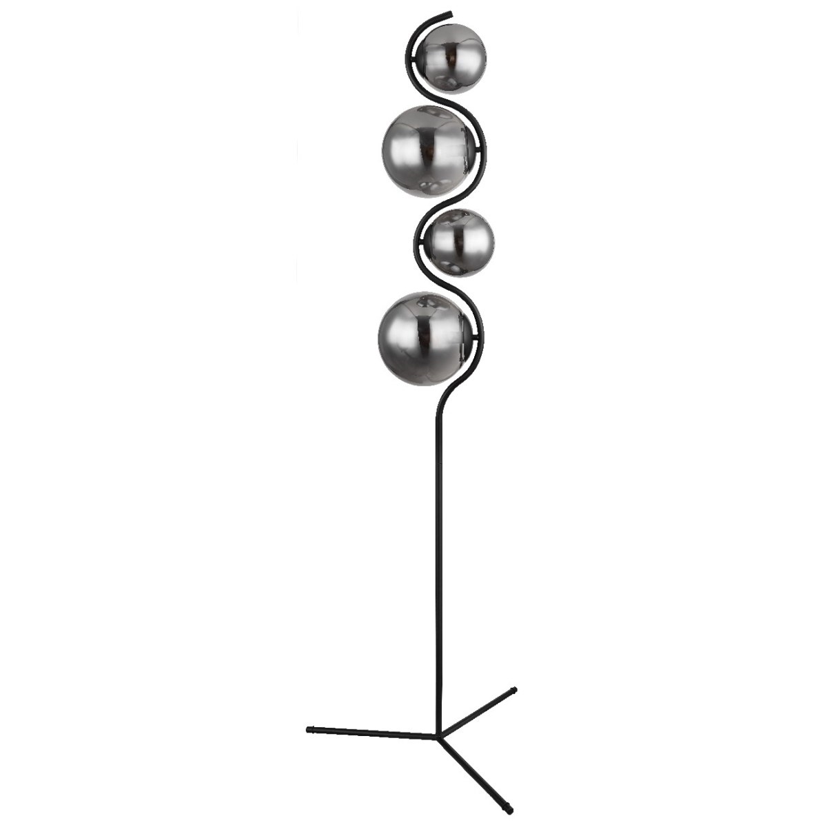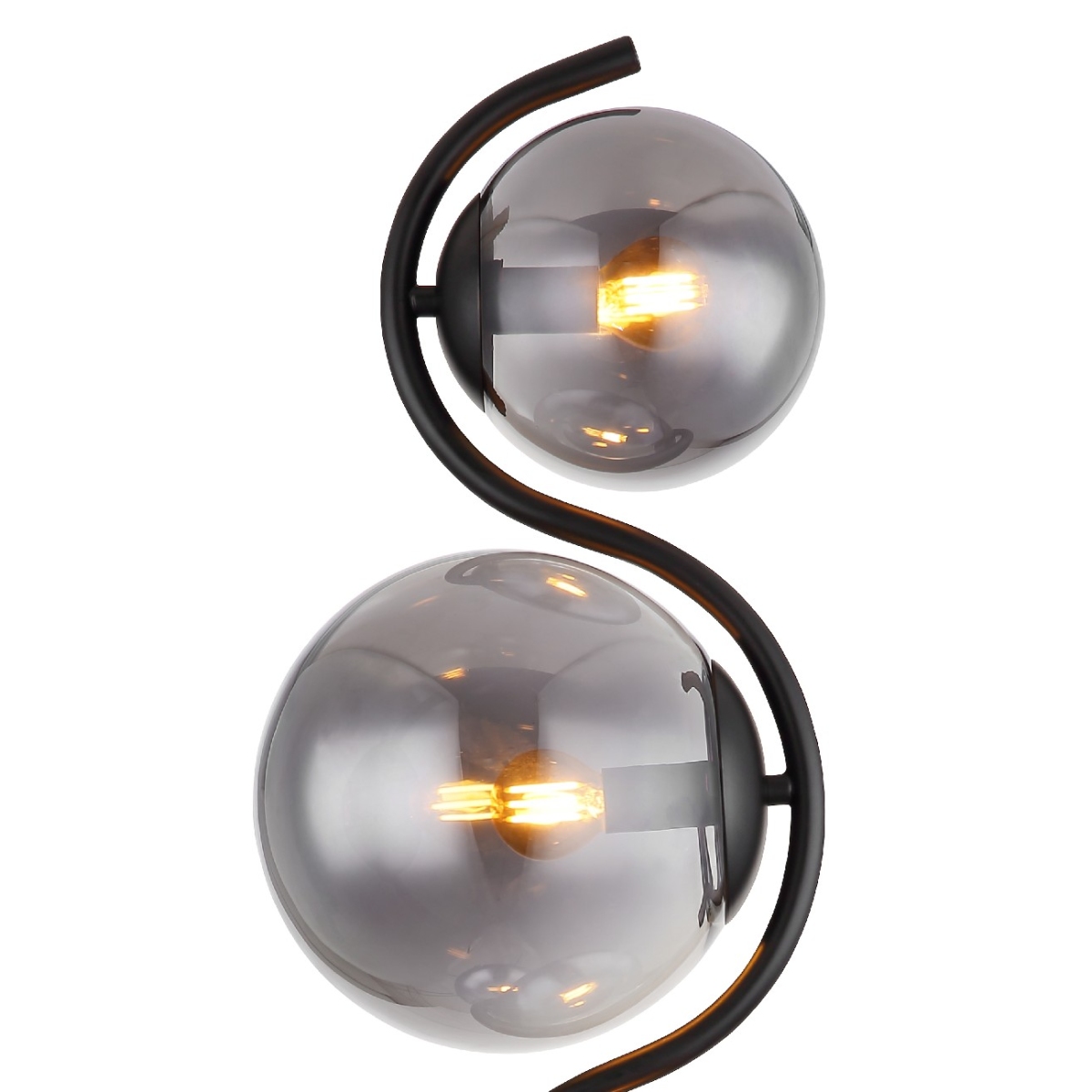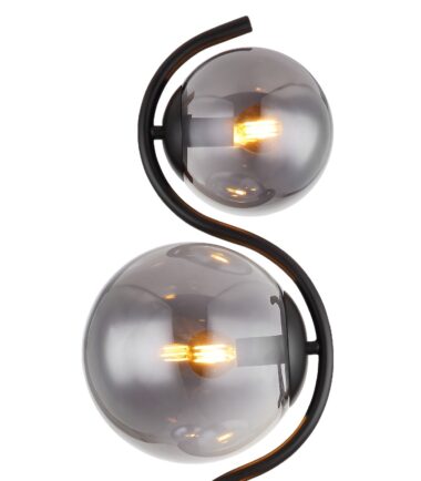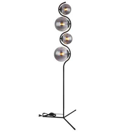 Ova moderna podna lampa impresionira sjajnim dizajnom. Dugačka 1,6 m dugačka zakrivljena metalna šipka prodire iz mat crnog tronožnog nosača, na kojem se nalazi četiri grla E14, od kojih svako ima oblikovani stakleni abažur u boji dima. E14 grla vam omogućavaju da sami odredite boju svetla i jačinu do maksimalnog izlaza od 25 vati. Zbog dugovečnosti i uštede energije preporučujemo LED sijalice.