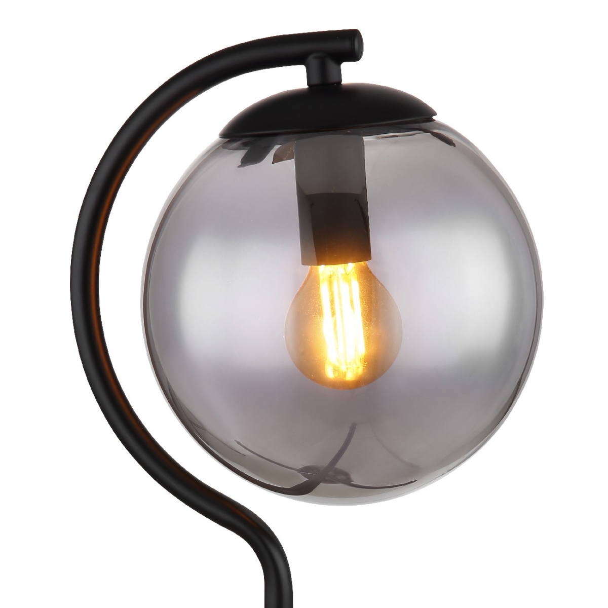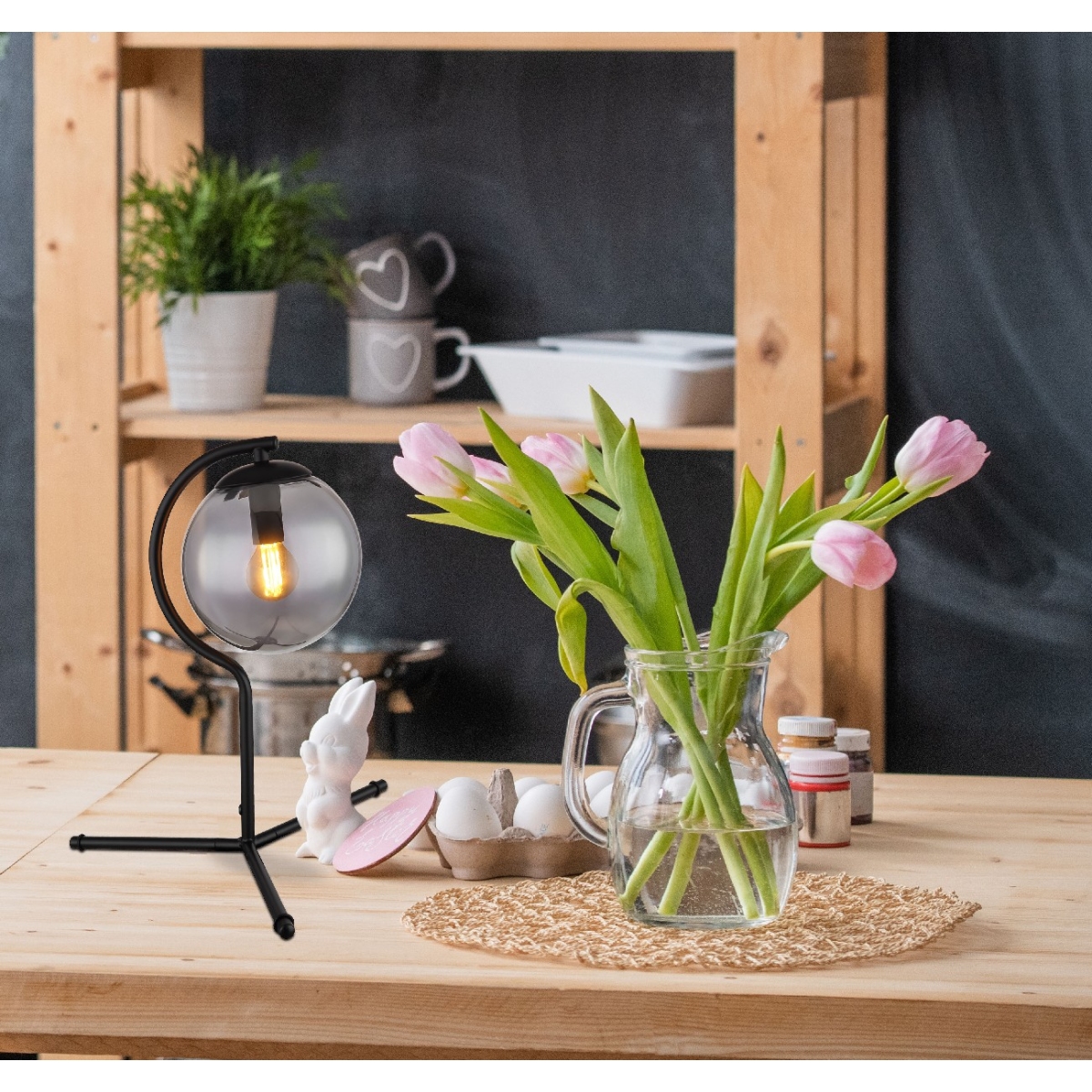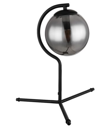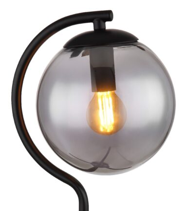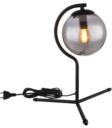 Ova jednostavna stona lampa impresionira svojim modernim dizajnom. Crno mat zakrivljena metalna šipka dugačka 35 cm prodire iz tronožaca i završava se na utičnici E14 koja je opremljena okruglim staklenim abažurom u boji dima (Ø 15cm). Grlo E14 vam omogućava da sami odredite boju svetla i jačinu do maksimalnog izlaza od 25 vati. Zbog dugovečnosti i uštede energije preporučujemo LED sijalice.