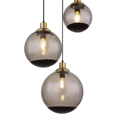Ova elegantna viseća lampa inspiriše prelepim dizajnom. Iz okruglog plafonskog nosača (Ø 30 cm) u crnoj boji, tri kabla različitih dužina do 1,2 m vire u po jedno E27 grlo, koje je opremljeno abažurima od dimljenog stakla različitih oblika i dekoracijama u crnoj i mesinganoj boji. E27 grla vam omogućavaju da sami odredite boju svetlosti i osvetljenost do maksimalne snage od 40 vati. Zbog dugotrajnosti i uštede energije, preporučujemo LED sijalice.
