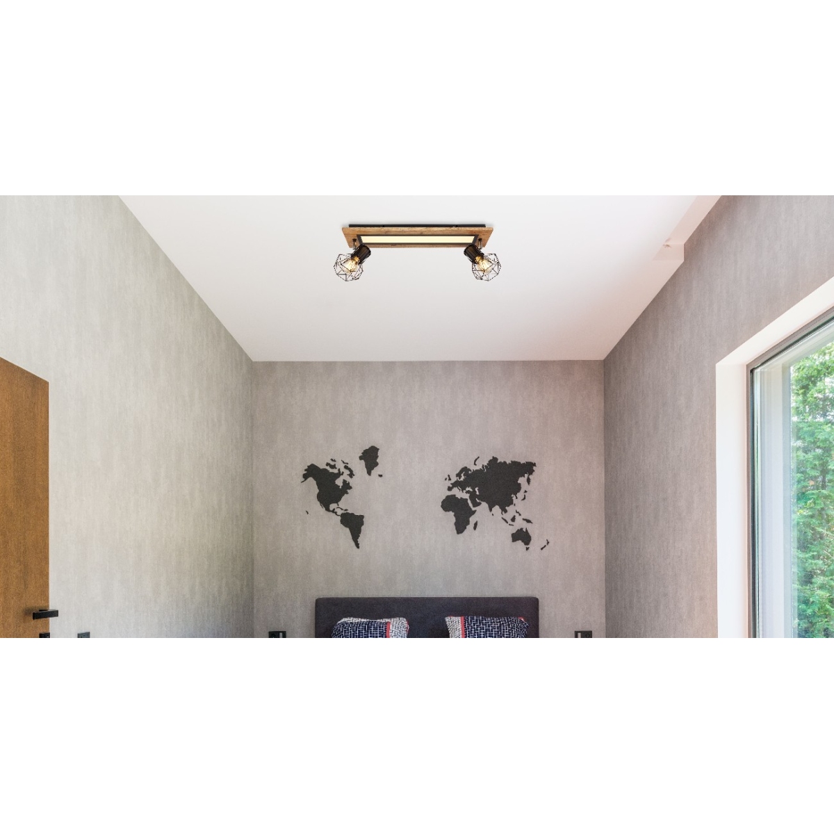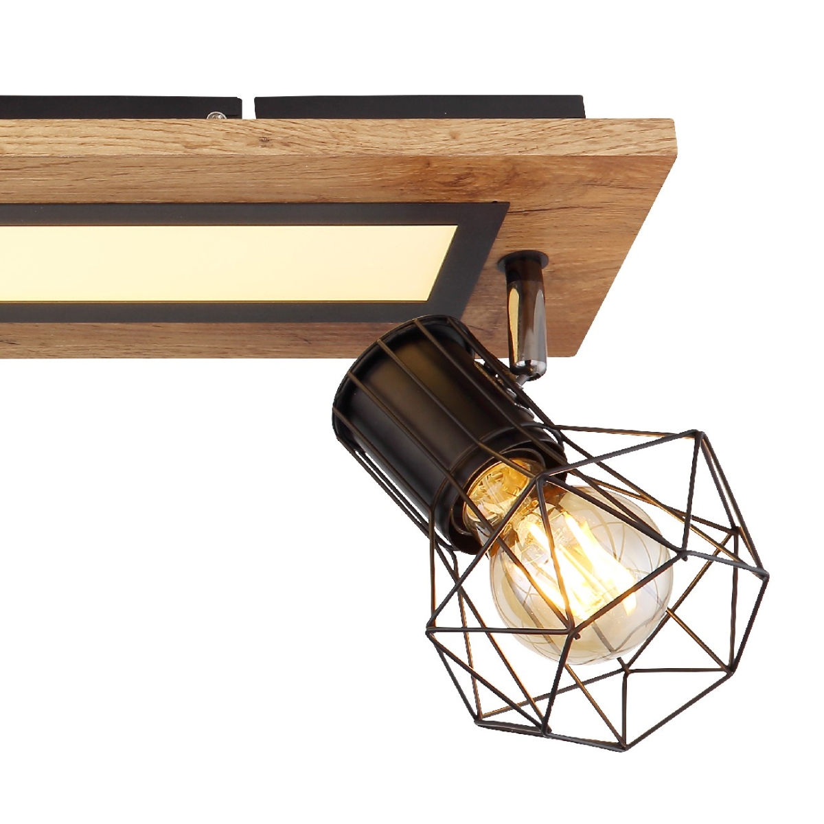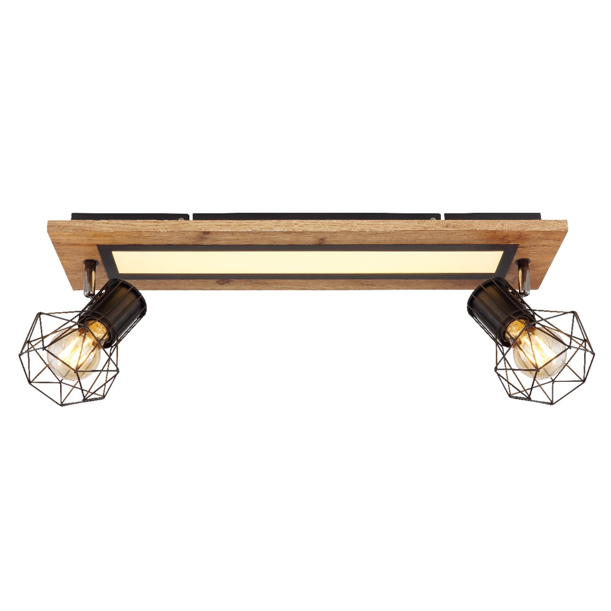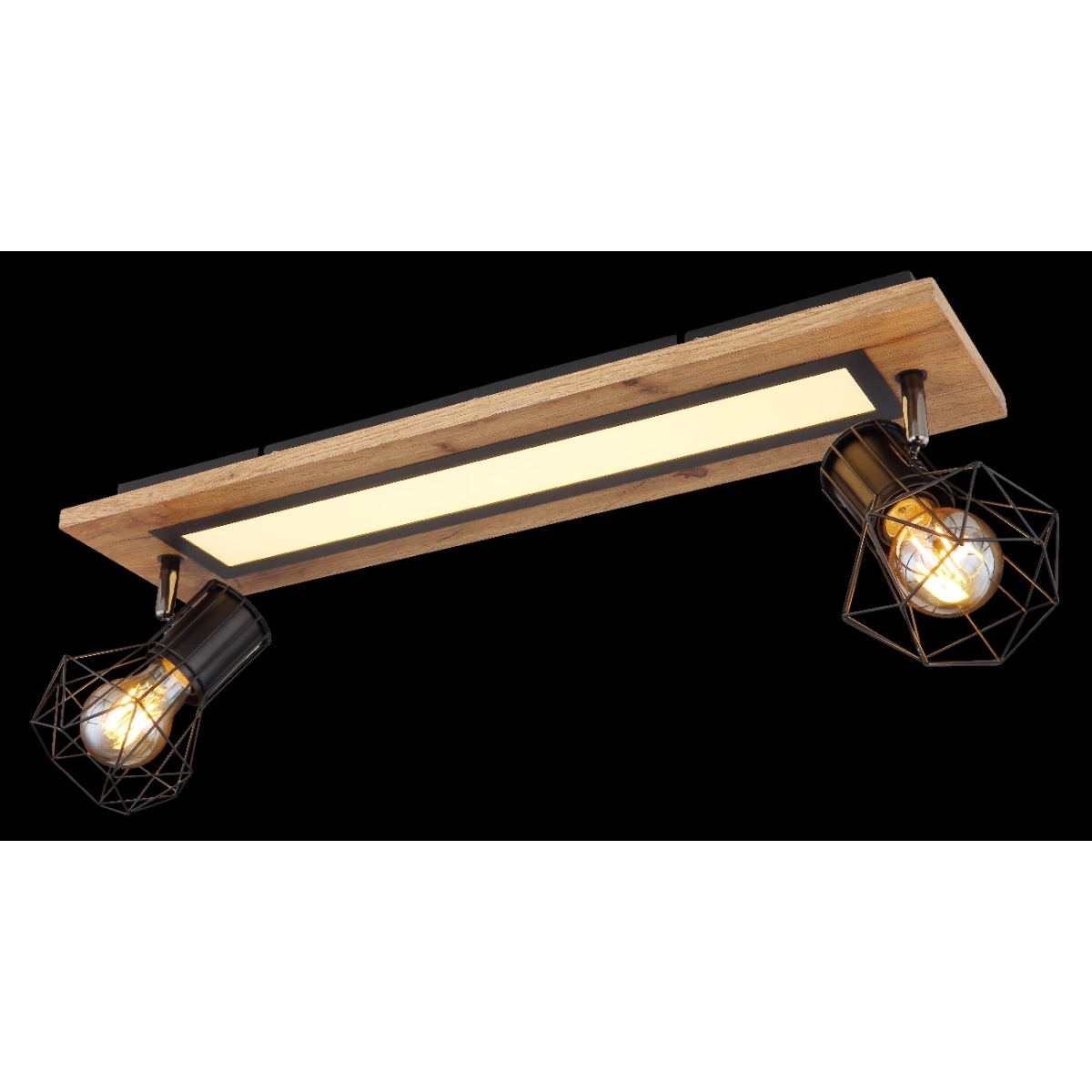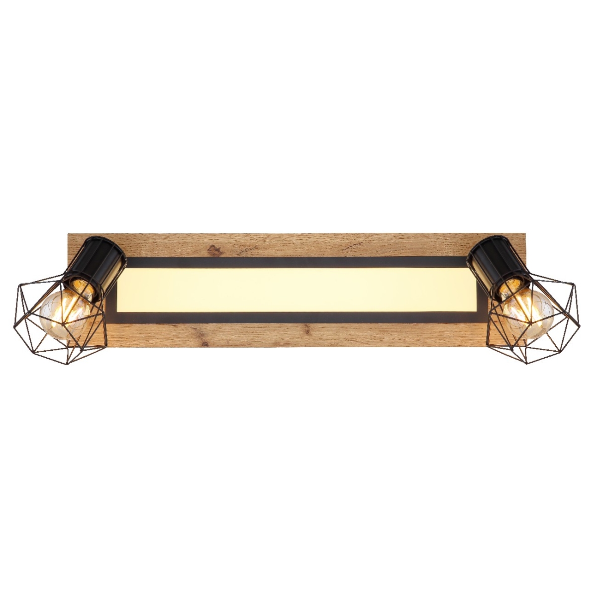 Ova pravougaona plafonska lampa impresionira svojim sjajnim izgledom. Pravougaoni LED panel nalazi se na sredini drvene ploče (15x60cm) sa dva E27 grla sa oblikovanim metalnim mrežastim abažurima. Panel obezbeđuje prijatno 3000 Kelvina toplo belo svetlo i ima snagu od 18W. Funkcija memorije vam omogućava da zadržite poslednje korišćene postavke.