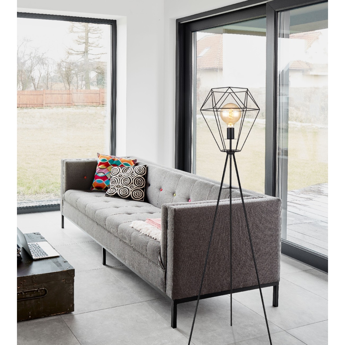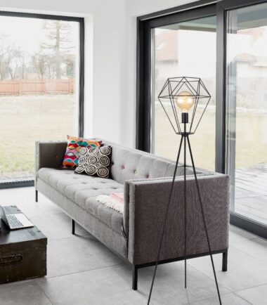 Ova moderna podna lampa PRISKA serije ubeđuje svojim diskretnim dizajnom. Lampa se sastoji od tronožaca napravljenog od crnog metala koji se završava na grlu E27 i obložena je abažurom (Ø35cm) u obliku metalne mreže. Grlo E27 vam daje mogućnost da sami odredite sijalicu do maksimalne snage od 60 vati.
