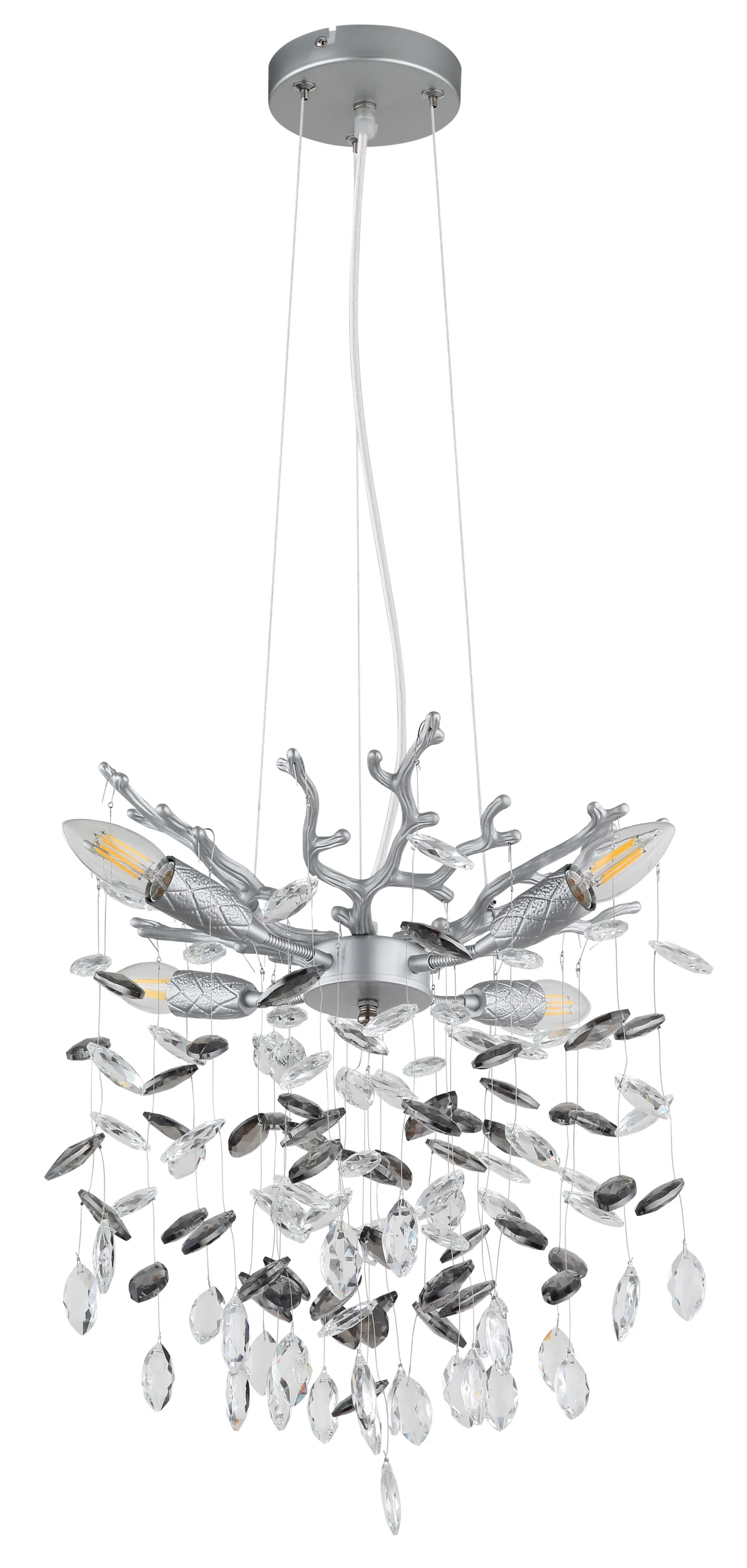 QUEENA – Okrugli luster sa privescima od dimljenog kristala. Okrugli luster QUEENA impresionira svojim elegantnim dizajnom i visokokvalitetnim materijalima. Umetnički razgranato telo napravljeno od mat srebrnog metala podseća na stilizovane grane i daje lampi neobičan, gotovo skulpturalni izgled. Dizajn je poboljšan elegantnim staklenim kristalima u dimljeno sivoj i providnoj boji, koji atmosferski prelamaju svetlost i stvaraju blistave refleksije. Flekso elementi na E14 grlima omogućavaju individualno podešavanje izvora svetlosti, omogućavajući i ciljano osvetljenje i dekorativne akcente. QUEENA je idealna za dnevne i trpezarijske prostore ili formalne prostore, gde služi kao stilska fokusna tačka. Sofisticirana kombinacija hladnog metala i blistavog kristala stvara modernu, elegantnu atmosferu sa dodatkom luksuza. E14 sijalice nisu uključene.