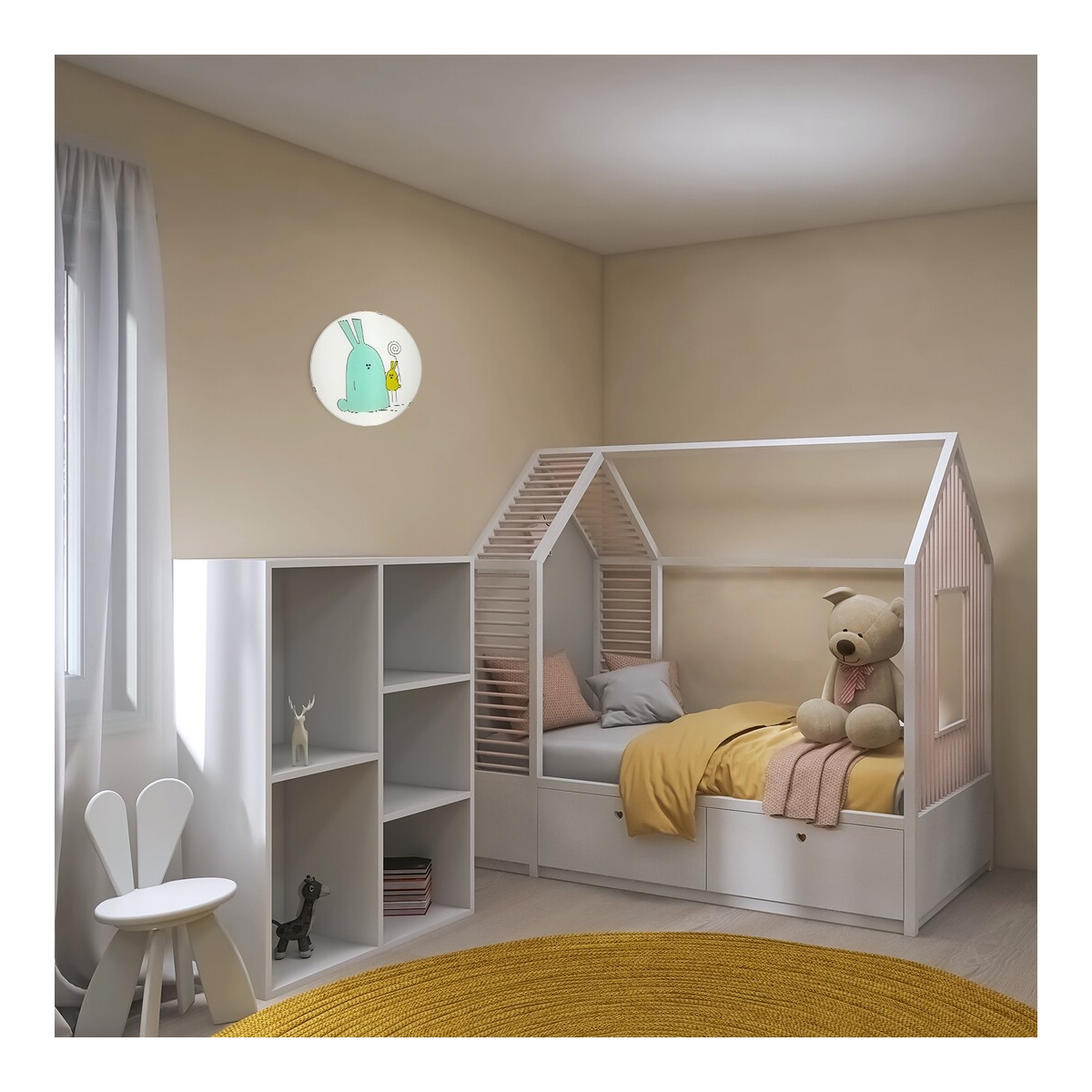 Rabalux Flappy dečija plafonska lampa je model koji je samostalno dizajnirao Rabalux. Idealna je za one koji žele da učine dečiju sobu još prijatnijom uz slatke, dirljive motive. Lampa je izrađena u beloj boji sa okruglim metalnim postoljem i staklenim senzorom. Senzor je ukrašen šarmantnim, stilizovanim motivom zeca kojem je nemoguće odoleti. Dominantne boje šare su vesele, sveže nijanse zelene. Dečija lampa može se koristiti sa dve sijalice, svaka snage do 60 W. Tip grla je E27. Ako želite da pojačate prijatnu, intimnu atmosferu, odaberite izvore svetlosti koji emituju toplo belo svetlo. Dečija plafonska lampa se isporučuje bez izvora svetlosti.