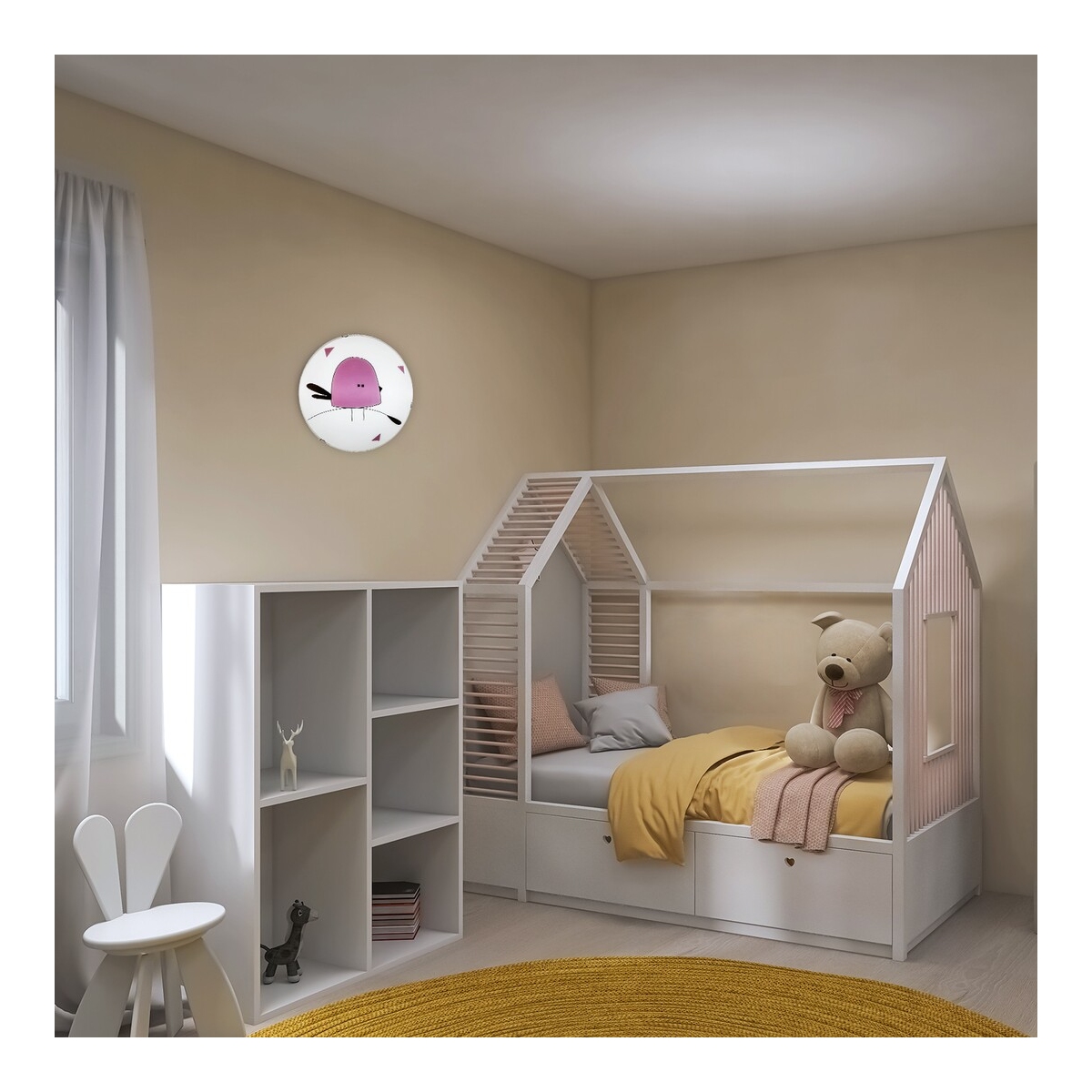 Rabalux Fowly dečija plafonska lampa je model koji je samostalno dizajnirao Rabalux. Idealna je za one koji žele da učine dečiju sobu još prijatnijom uz slatke, vesele motive. Lampa je izrađena u beloj boji sa okruglim metalnim postoljem i staklenim senzorom. Ukrašena je šarmantnim stilizovanim motivom ptice u ljubičastoj boji, koji će odmah osvojiti srca i mladih i starih. Dečija lampa može se koristiti sa dve sijalice, svaka snage do 60 W. Tip grla je E27. Ako želite da pojačate prijatnu, intimnu atmosferu, odaberite izvore svetlosti koji emituju toplo belo svetlo. Dečija plafonska lampa se isporučuje bez izvora svetlosti.