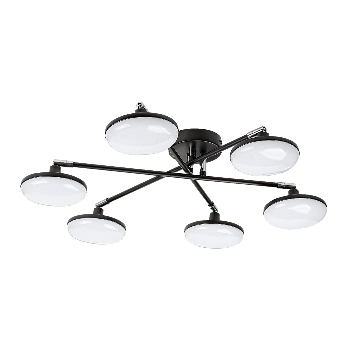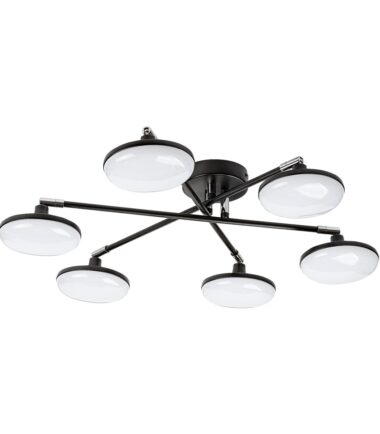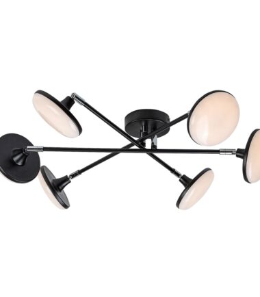 Sa svojim značajnim svetlosnim tokom i estetskim izgledom, moderna plafonska lampa Madi sa 6 sijalica je odličan izbor za prostraniji dnevni boravak, spavaću sobu ili radnu sobu. Mat crni metalni pribor upotpunjen je belim plastičnim abažurima, a lampa se može pričvrstiti na plafon uz pomoć malog, okruglog ukrasnog postolja. Šest fleksibilnih glava lampi postavljeno je na krajeve horizontalnih potpornih šipki koje se ukrštaju koje su pričvršćene za dekorativnu osnovu. Plafonska lampa u celini ima oblik cveta. Madi ima ugrađeni LED izvor svetlosti energetske klase F sa snagom od 24 V, svetlosnim fluksom od 2.350 lumena sa senkom i 3.000 lumena bez senke, i životnim vekom od 30.000 sati. Izvori svetlosti imaju temperaturu boje od 3000 K i zrače toplo belo svetlo koje vam pomaže da stvorite prijatnu, intimnu atmosferu koja opušta vaše oči. Dimenzije plafonske lampe Madi su sledeće: prečnik 570 mm, rastojanje od plafona 140 mm, prečnik svakog abažura 120 mm, prečnik ugradnje svetiljke 100 mm.
