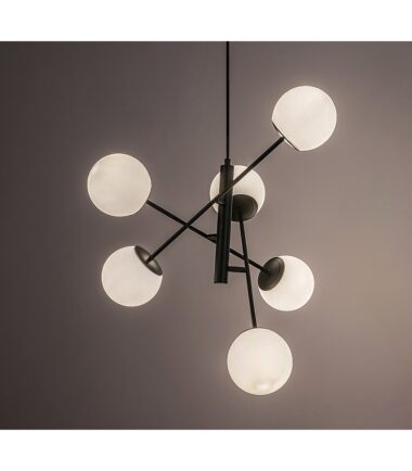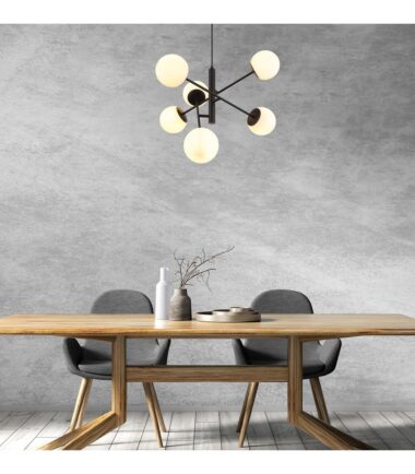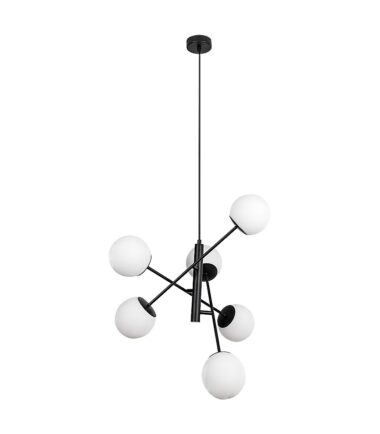 Viseća lampa Rabaluk Meduza može biti omiljena za ljubitelje nordijskog stila. Metalna armatura je izrađena u elegantnoj mat crnoj boji, dok su okrugle staklene nijanse bele. Privezak – kao što ime kaže – zaista podseća na meduzu, jer je šest glava lampi postavljeno na krajeve potpornih šipki koje se granaju od centra. Klasična kombinacija boja i zanimljiv oblik daju lampi atraktivan i privlačan izgled. Ovaj model može biti dobar izbor za dnevni boravak, trpezariju ili spavaću sobu – za ove prostorije pre svega preporučujemo toplu ili prirodno belo svetlo. Privezak ima šest E14 grla u koje možete postaviti G45 sijalice, svaka snage do 20 V. Proizvod se isporučuje bez izvora svetlosti.