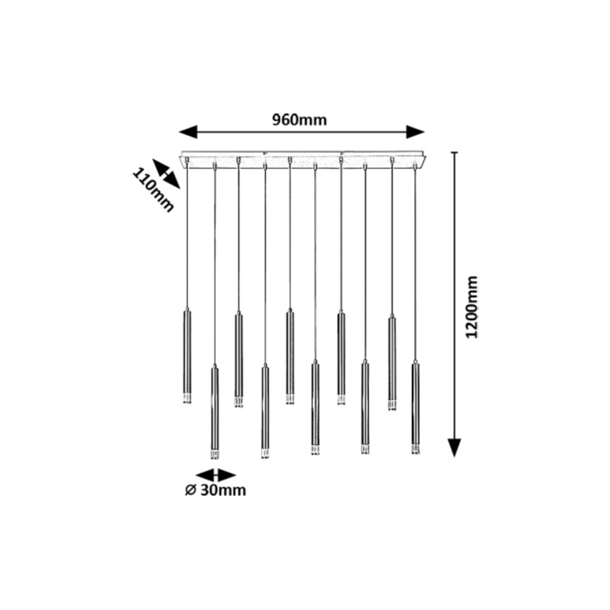 Rabalux Ramira 10-sijalica viseća lampa se prvenstveno preporučuje onima koji traže viseću lampu minimalističkog stila, ali sa impresivnim dimenzijama i svetlosnim intenzitetom. Lampa je izrađena od metala u elegantnoj crnoj boji i dopunjena je prozirnim akrilnim senkama i dugim kvadratnim dekorativnim postoljem u istoj boji kao glave lampe. Lampe malog prečnika su izrađene u tubularnom, cilindričnom obliku i postavljene su u red, jedna pored druge. Glave lampe vise na različitim visinama, što ovom modelu daje jedinstven izgled. Viseća lampa je idealna ne samo za dnevnu sobu, već i za kuhinju, trpezariju ili spavaću sobu. Može se koristiti sa deset sijalica, svaka snage do 5 W. Tip grla je G9. Lampa se isporučuje bez izvora svetlosti.