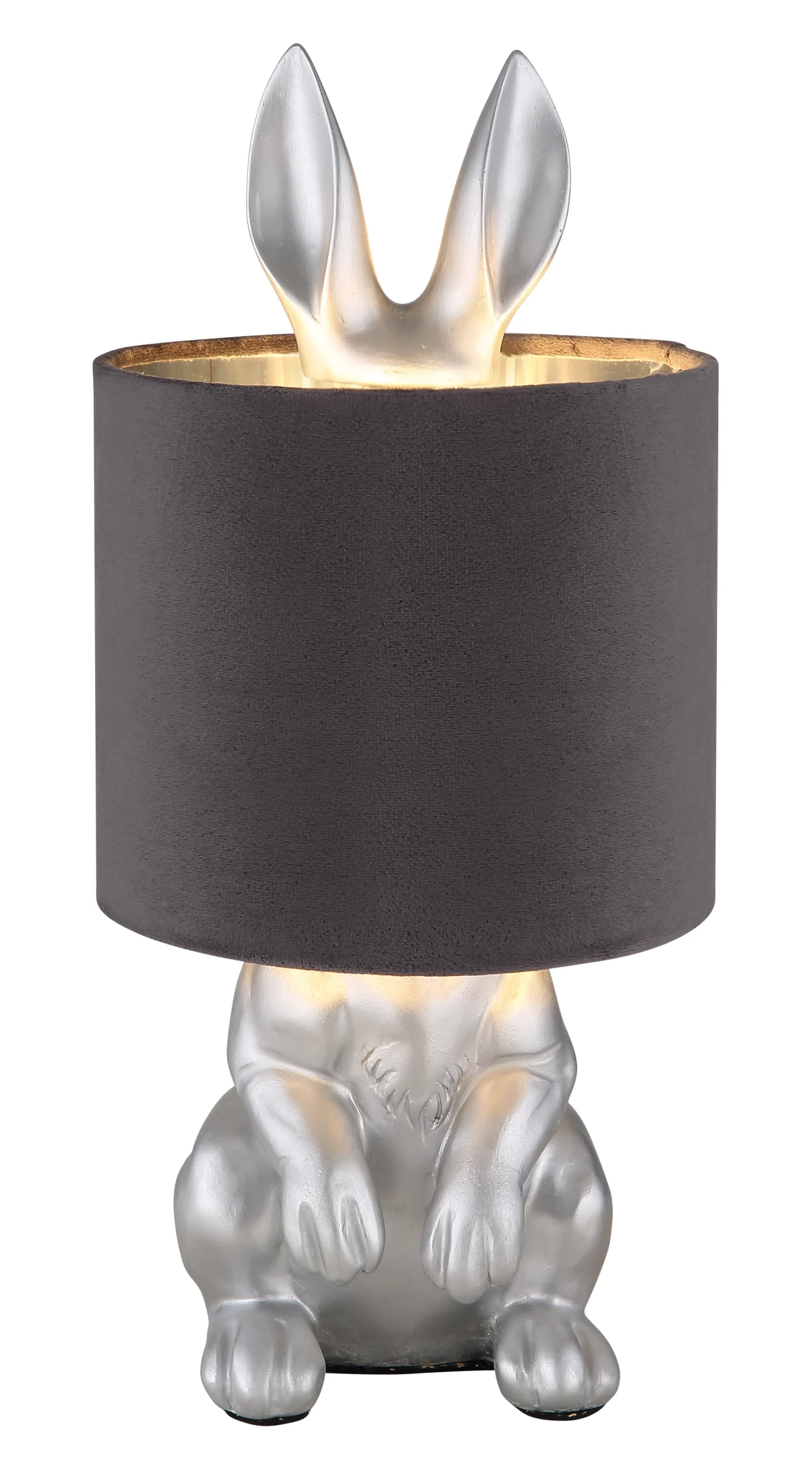 Stona lampa RABBIT sa srebrnim zekom i sivim somotskim abažurom je dekorativni element. Savršena je za moderne i kreativne životne prostore. Pogodna je za sijalice tipa E27 (ekskluzivno).