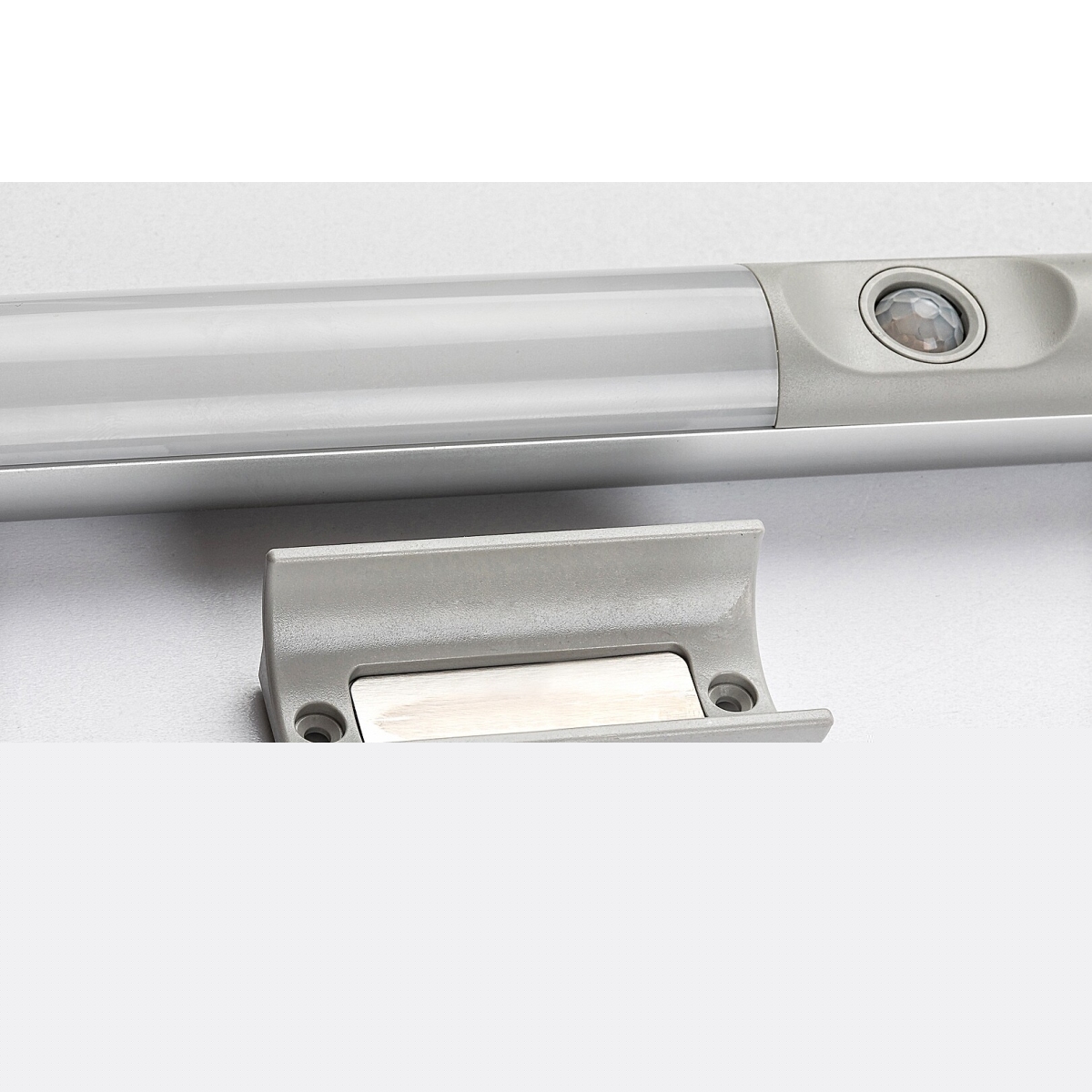 Jednostavan dizajn modernog Rakar svetla za kuhinjski ormarić je kombinovan sa nekoliko dodatnih karakteristika: ima senzor pokreta i bateriju i može se puniti pomoću USB kabla. Ovaj model srebrne boje koji je u potpunosti napravljen od plastike, podržava vas svojom svetlošću dok pripremate obroke ili perete veš. Lampa je dopunjena belim plastičnim abažurom i ima ugrađen LED izvor svetlosti energetske klase G. Izvor svetlosti ima snagu od 3W, svetlosni fluks od 180 lumena i životni vek od 25.000 sati. Sa temperaturom boje od 4000 K, izvor svetlosti zrači prirodno belo svetlo koje stvara čist, moderan efekat i idealno je za obavljanje aktivnosti u kuhinji. Rakarov senzor detektuje kretanje sa udaljenosti od 2-5 metara pod uglom gledanja od 100°, a osvetljenost lampe se prilagođava okolnostima. Baterija ima napon od 3,7 V i kapacitet od 1.800 mAh. Ovo svetlo za ormarić ima prekidač i ima širinu od 310 mm i prečnik od 25 mm.