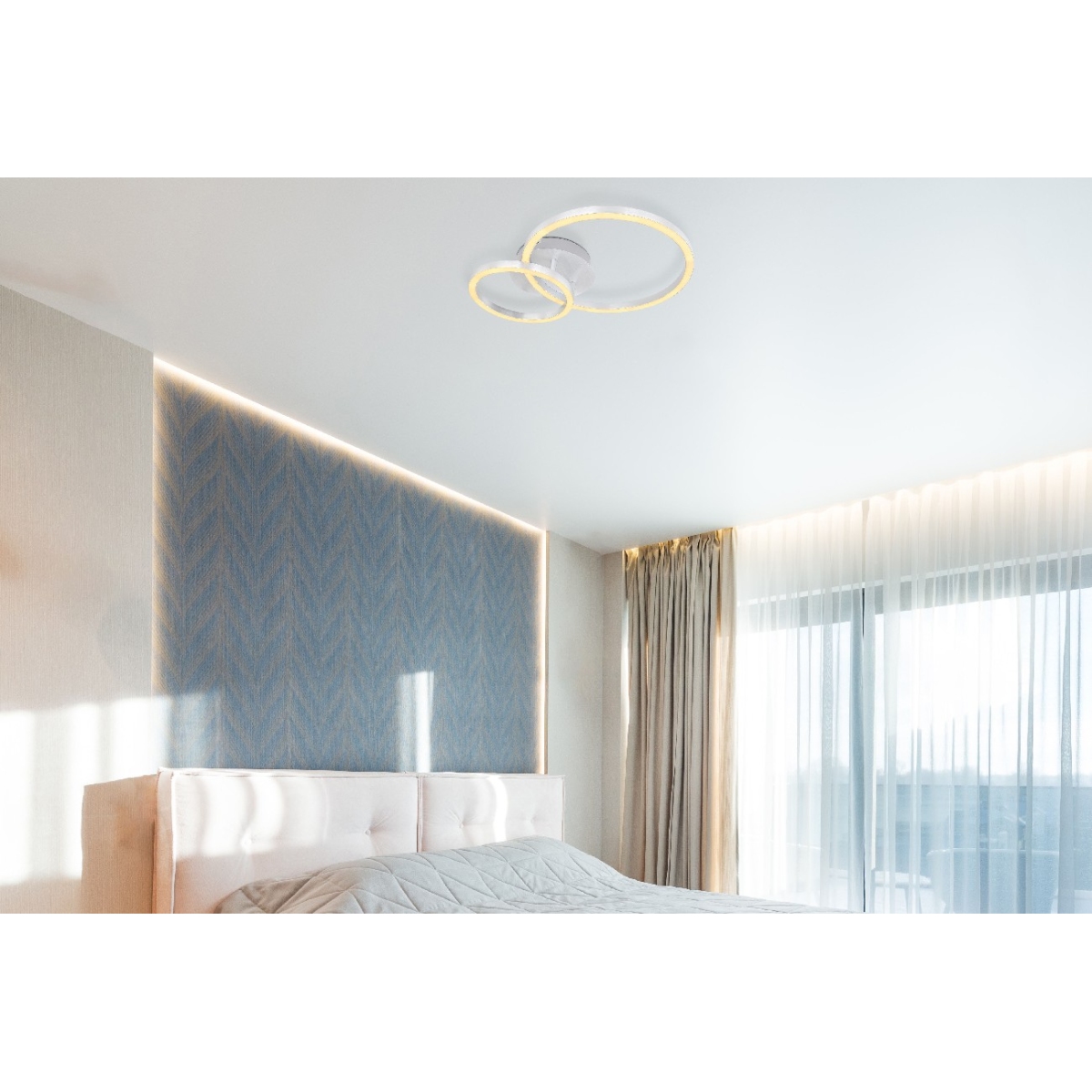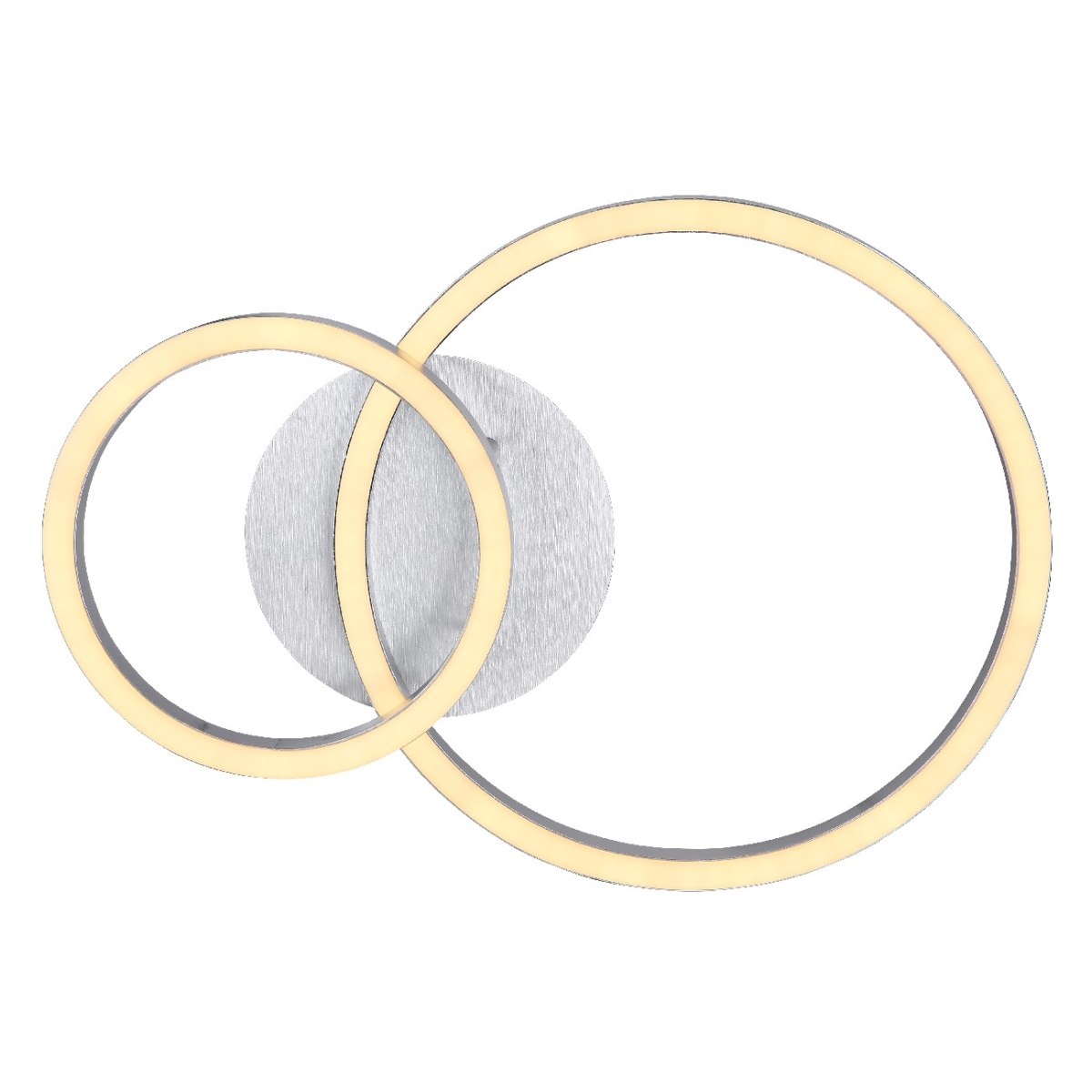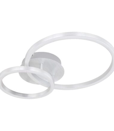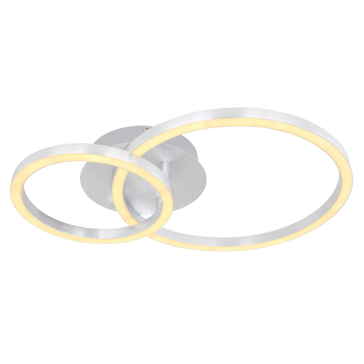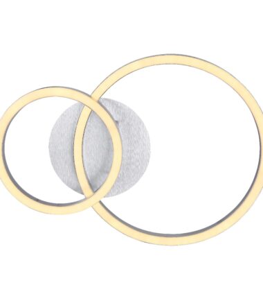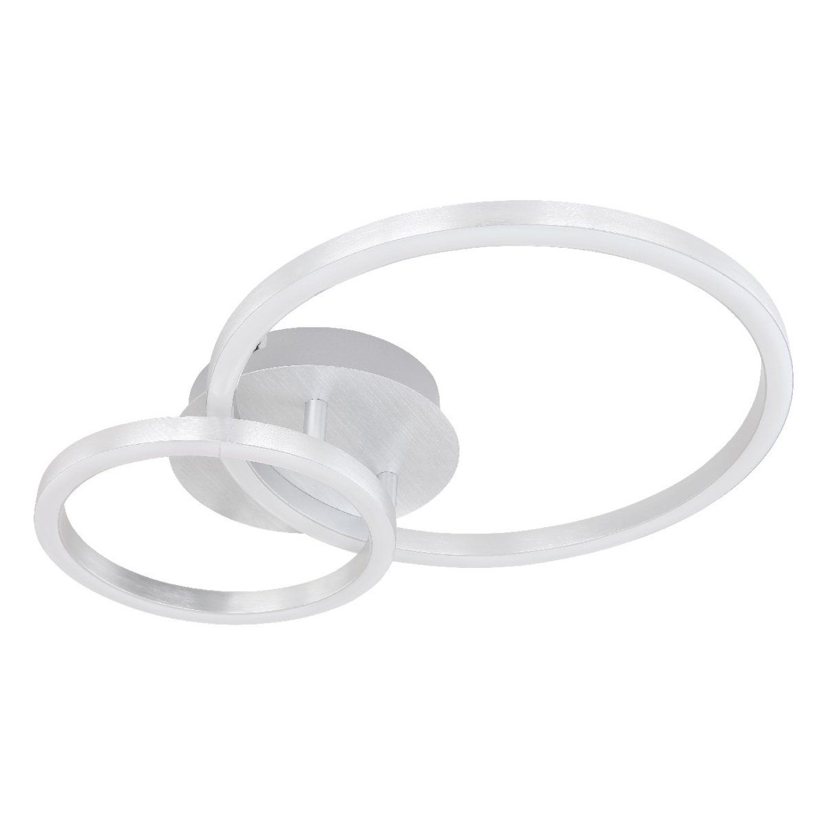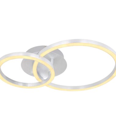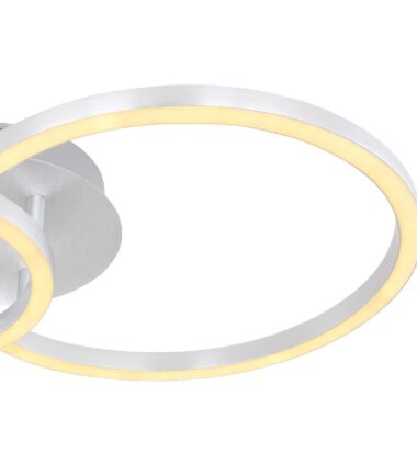 Ova plafonska lampa iz serije REGGY (42×30 cm) impresionira svojim elegantnim dizajnom napravljenim od brušenog aluminijuma i opalnog akrila. Na aluminijumsku ploču su pričvršćeni veći i manji aluminijumski prsten, koji se divno preklapaju i opremljeni su opalnim akrilom. Oni pokrivaju uključene LED sijalice, sa kojima plafonska lampa obezbeđuje 950 lumena jako svetlo boje od 3000 Kelvina (topla bela). Sa ostalim modelima iste serije možete upotpuniti celokupnu sliku u svom enterijeru i stvoriti elegantan ambijent.