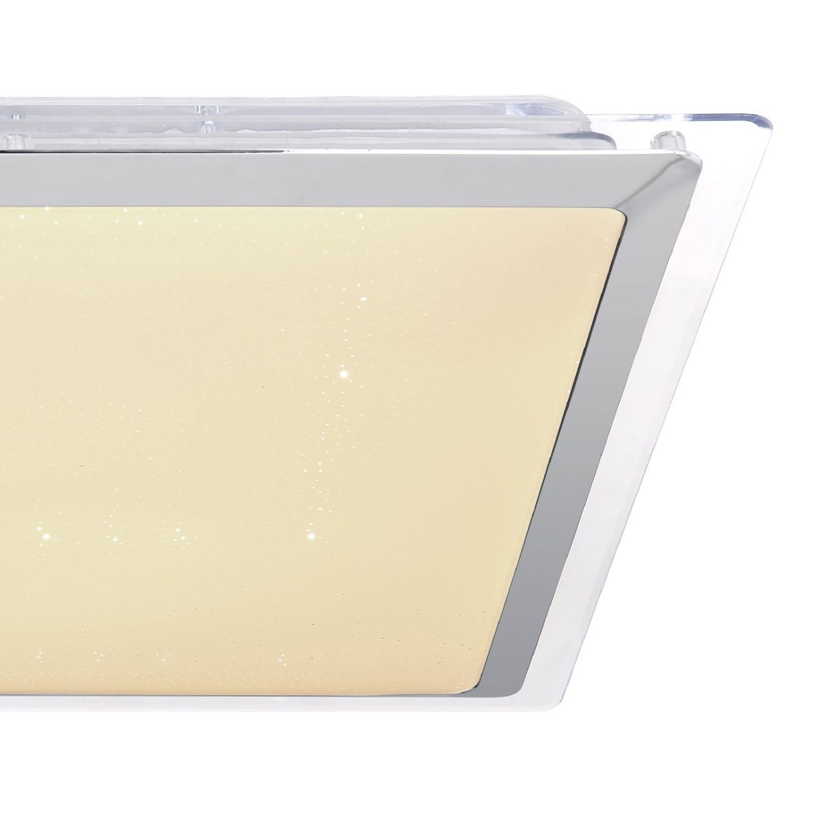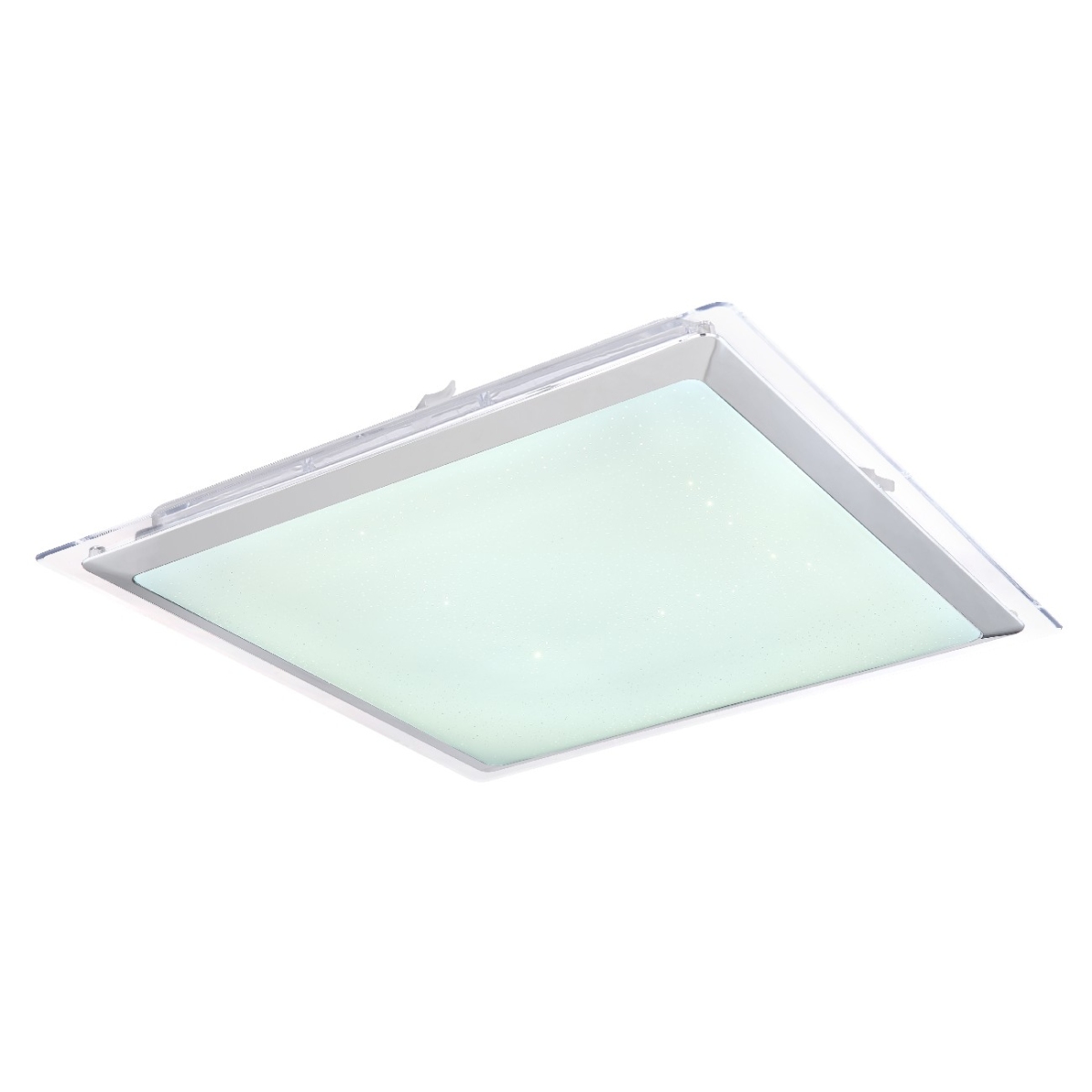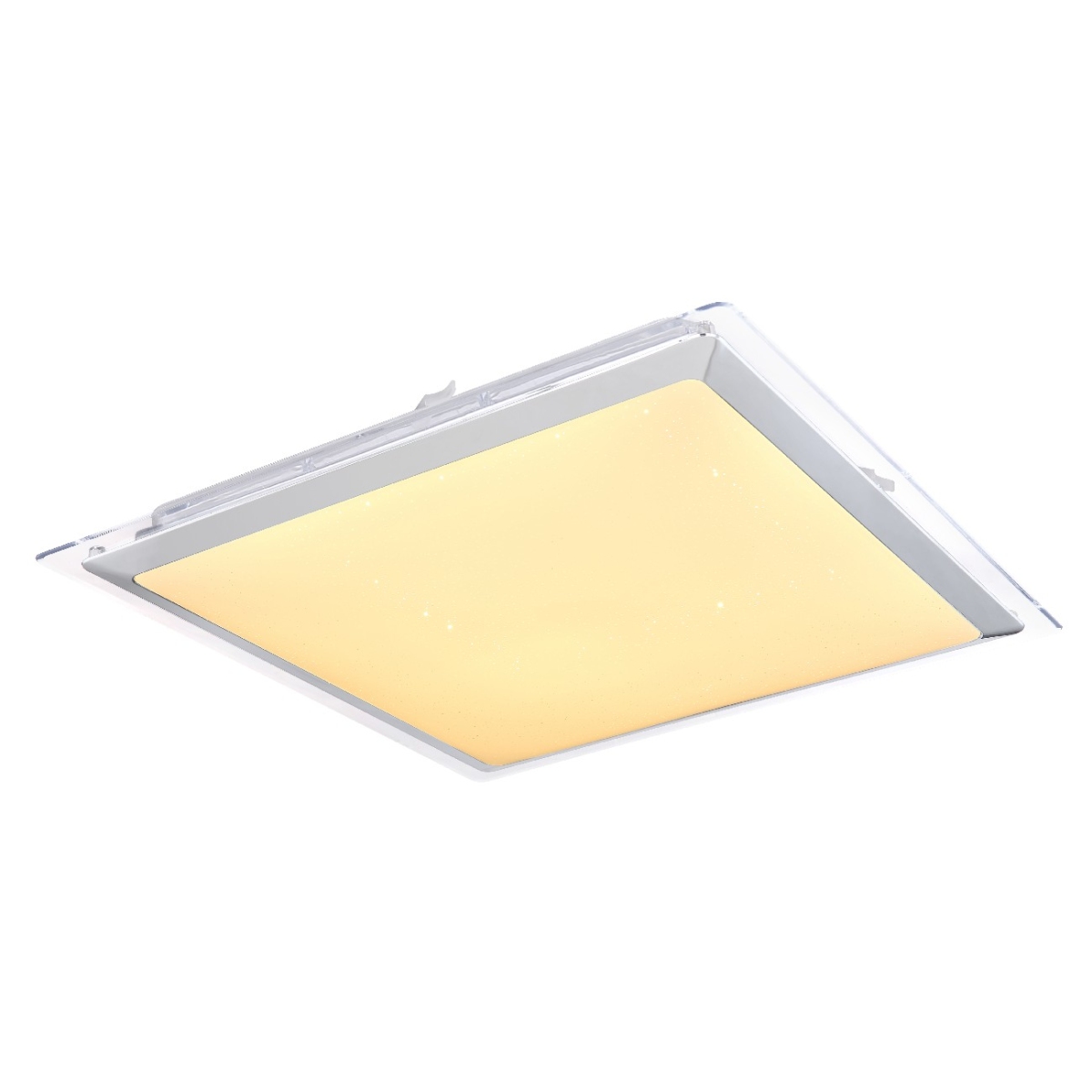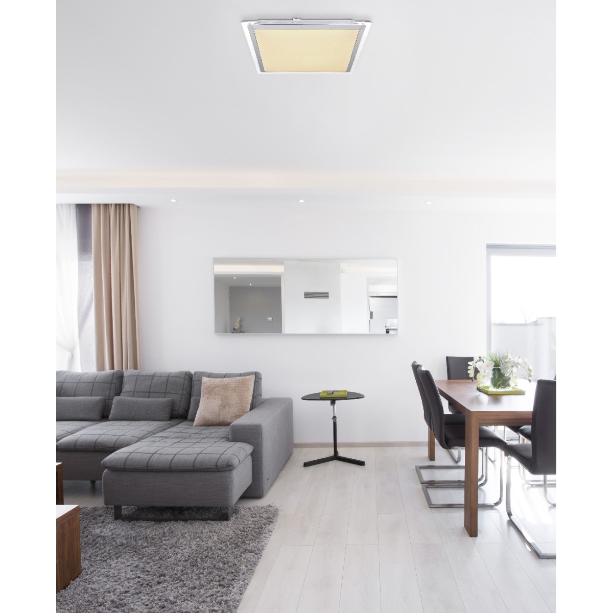 Ova pravougaona plafonska lampa, 55×55 cm, iz serije RENA, moderna je lampa koja se savršeno može integrisati u sve prostorije. Napravljena od belog metala i opalne plastike, ova unutrašnja lampa izgleda veoma elegantno. Pored toga, beloj plastici je dat kristalni efekat. Standardni 48W LED emituje 3200 lumena jake svetlosti. Svetlosna boja je zatamnjiva i zato se može podesiti od 3000K (topla bela) do 6000K (hladno bela svetlost). Ovim modelom se takođe može upravljati pomoću uključenog daljinskog upravljača.