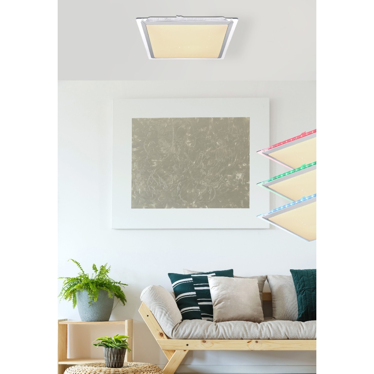 RENA je kvadratna ultra ravna LED plafonska lampa napravljena od aluminijuma i akrila sa RGB funkcijom (445x445x75mm). Rena je opremljena sparkle dekorom, ima noćno svetlo i funkciju memorije, zatamnjuje se, ima daljinski upravljač, menjač boja, njene boje su fiksne, savršeno se uklapa u bilo koju prostoriju sa visokim zahtevima osvetljenja, pri tome je svetlo ravnomerno raspoređeno i sija u toplo beloj boji. Funkcije kao što su RGB, fiksacija svetlosne boje, dimabilnost i noćno svetlo pogodno se kontrolišu daljinskim upravljačem. Dizajn je elegantan i neutralan.