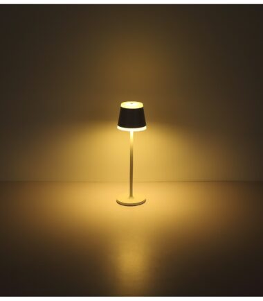 Ova moderna stona lampa ističe se prelepim dizajnom. Iz sive okrugle baze isturena je metalna šipka dugačka skoro 39 cm sa oblikovanim abažurom, dva LED panela koji emituju toplu belu svetlost od 3000 Kelvina. Pored toga, ova lampa ima funkciju zatamnjivanja, ON/OFF prekidač i USB kablovsku vezu za punjenje.