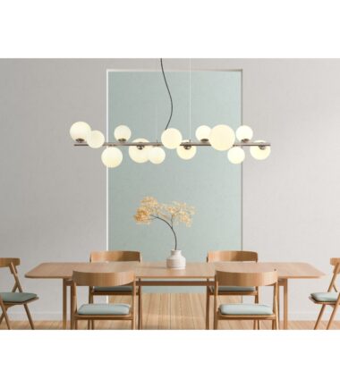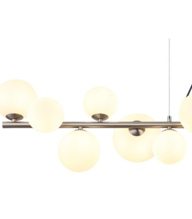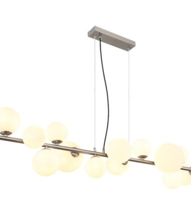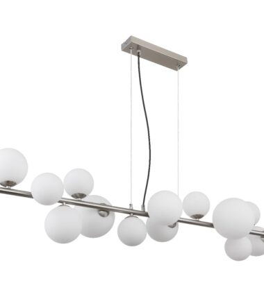 Otkrijte impresivnu RIHA visilicu, koja uranja u vaše sobe prijatan ambijent svojim modernim dizajnom i nežnim svetlom. Mat nikl i opalno staklo stvaraju harmoničnu kombinaciju. Providni PVC kabl je fleksibilan i omogućava vam da prilagodite visinu lampe. Sa različitim prečnikom stakla (6×10 cm, 5×12 cm, 2×15 cm), RIHA stvara fascinantnu igru svetlosti. Visilica dolazi sa 13 G9 LED sijalica (3,5W, 230V, 350lm izvor, izlaz od 310lm, 3000K), koje obezbeđuju energetski efikasno osvetljenje toplom belom svetlošću. Dimenzijama od 1200 x 345 x 1200 mm, RIHA se savršeno uklapa u vaš dom i postavlja elegantne akcente. Doživite savremeni dizajn i atmosfersko osvetljenje proizvodima serije RIHA!