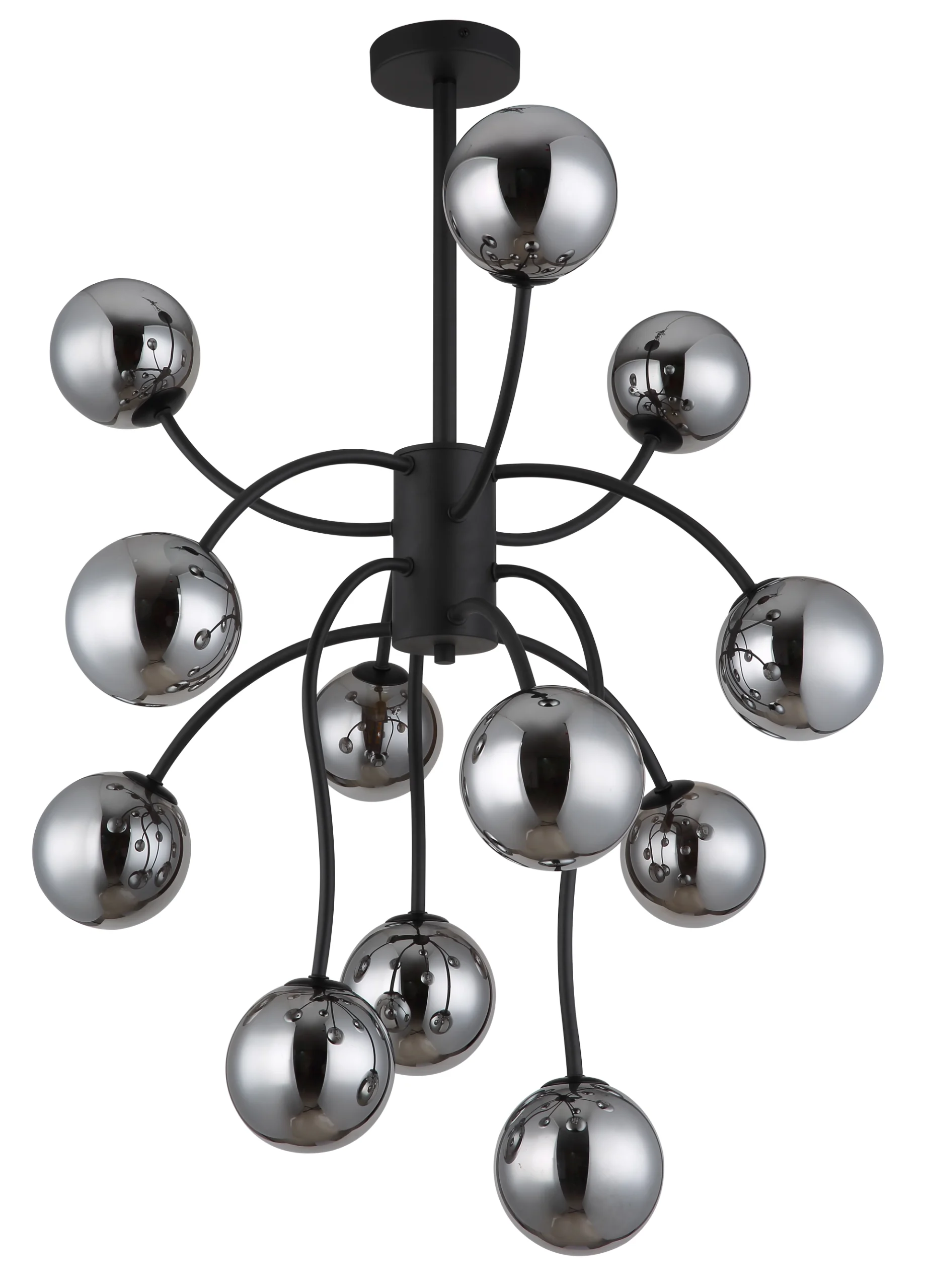 Plafonska lampa RIHA predstavlja se okruglim oblikom koji stvara elegantan i minimalistički izgled. Posebna atrakcija ove lampe je 12 zakrivljenih krakova, od kojih svaki nosi staklenu kuglu. Staklene sfere su dimljene boje i daju lampi jedinstven dizajn. Telo lampe je napravljeno od crnog lakiranog metala, koji ima mat površinu. Dimenzije plafonske lampe RIHA su ø 700 mm, što znači da se može uklopiti i u male prostorije. Svetiljka ima efektivnu svetlosnu snagu od 130 lumena na temperaturi boje od 3000 K. Ova kombinacija dizajna i kvaliteta svetlosti čini plafonsku lampu RIHA odličnim dodatkom za uređenje enterijera.