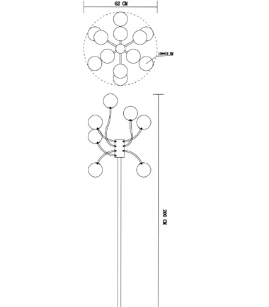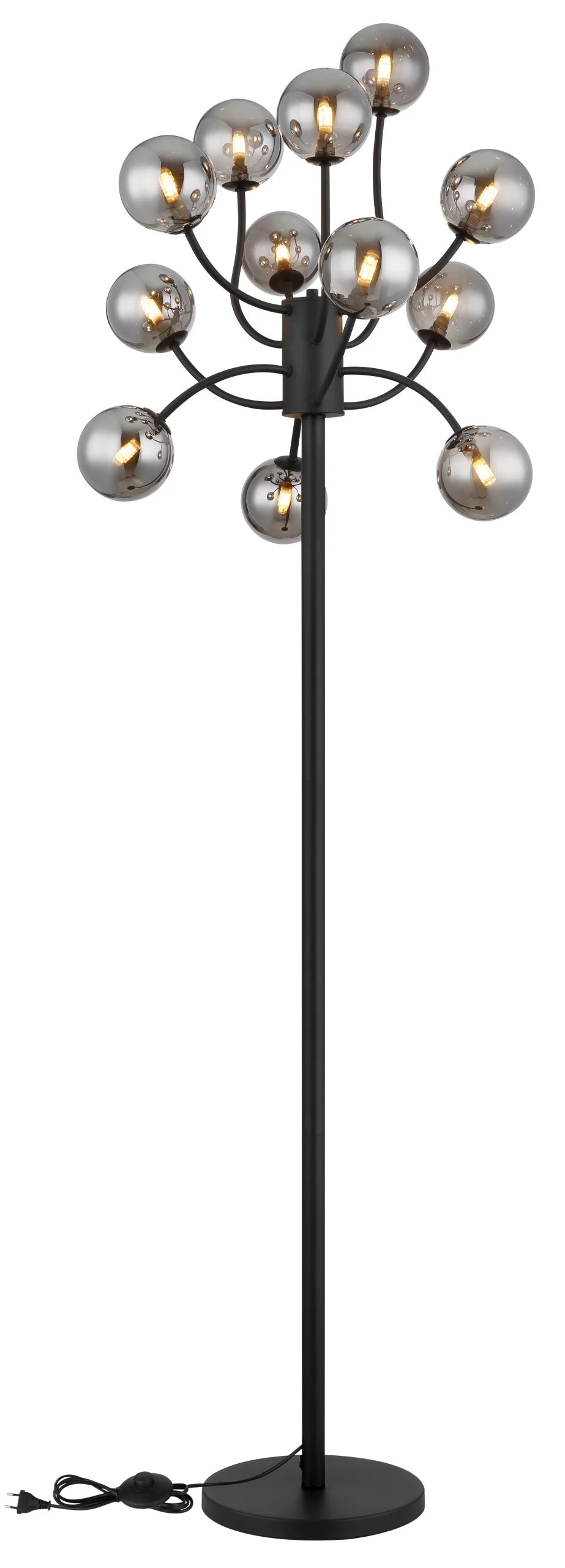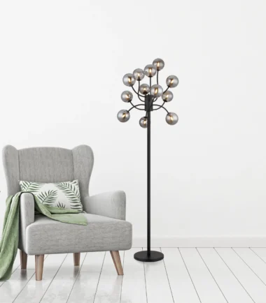 RIHA podna lampa impresionira svojim dizajnom i 12 zakrivljenih krakova ukrašenih kuglicama od dimljenog stakla. Crno metalno kućište i nožni prekidač na kablu nude funkcionalnost i eleganciju. Sa svetlosnim izlazom od 130 lumena i svetlosnom temperaturom od 3000 K, ova svetiljka pruža meko i privlačno osvetljenje. Idealna je za moderne dnevne sobe ili kutke za čitanje kojima je potreban stilski izvor svetlosti.