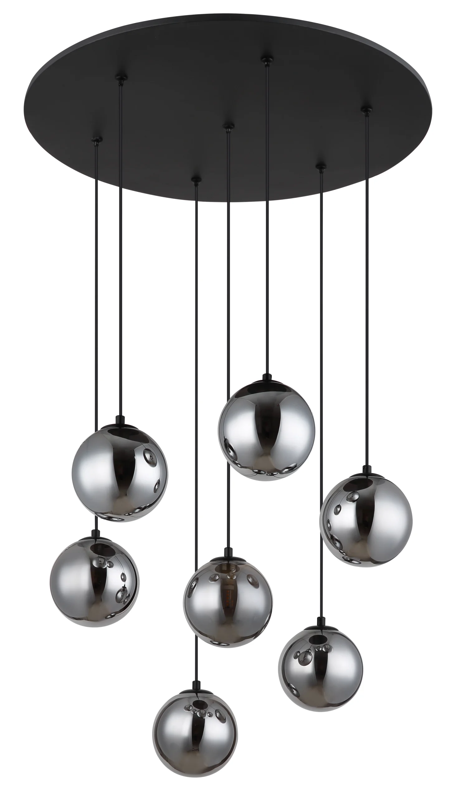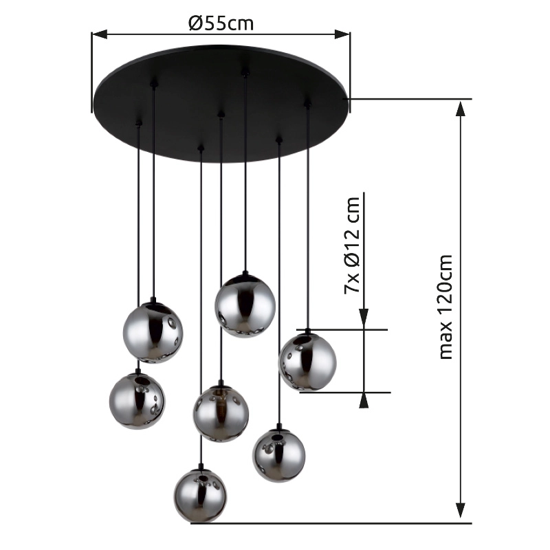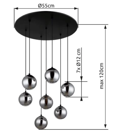 RIHA viseća lampa je jedinstveni svetlosni objekat koji se odlikuje okruglim dizajnom i 7 vešalica sa dimljenim staklenim sferama. Telo lampe je napravljeno od crnog lakiranog metala, koji ima mat površinu. Dimljene staklene sfere stvaraju posebnu atmosferu i pružaju jedinstveno osvetljenje. Dimenzije RIHA viseće lampe su ø 550 mm, što je čini idealnim rešenjem za prostorije srednje veličine. Sa efektivnim svetlosnim izlazom od 130 lumena na temperaturi boje od 3000 K, RIHA viseća lampa nudi prijatno osvetljenje. Sa svojim minimalističkim dizajnom i elegantnim staklenim kuglicama, RIHA viseća lampa postaje stilski dodatak za svaki dizajn prostorije.