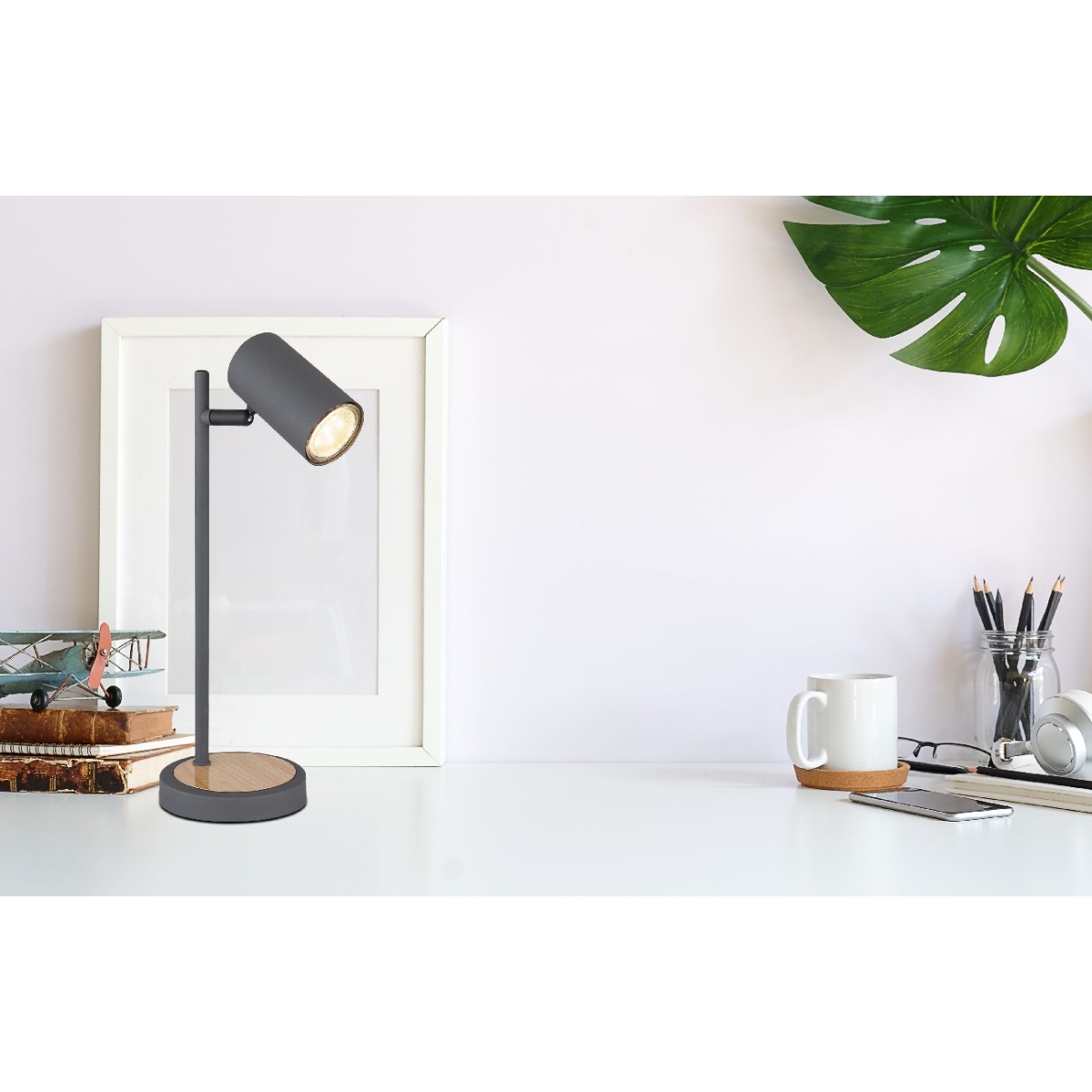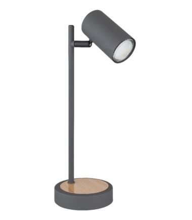 Ova stona lampa od 35 cm iz serije Robi (ø 12 cm) je divan dodatak vašem enterijeru. Napravljena od metala boje grafita, stona lampa se sastoji od okruglog metalnog postolja u izgledu drveta, na koje je pričvršćena šipka sa okretnim GU10 grlom obloženim metalom. Mogu biti opremljene LED sijalicom po vašem izboru, što vam daje mogućnost da individualno odaberete boju svetlosti i osvetljenost. Pored toga, ima uključeni prekidač pomoću kojeg se svetiljka može praktično uključiti i isključiti. Sa drugim modelima iste serije možete upotpuniti celokupnu sliku u svoja četiri zida.