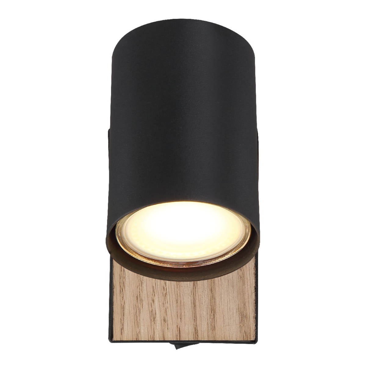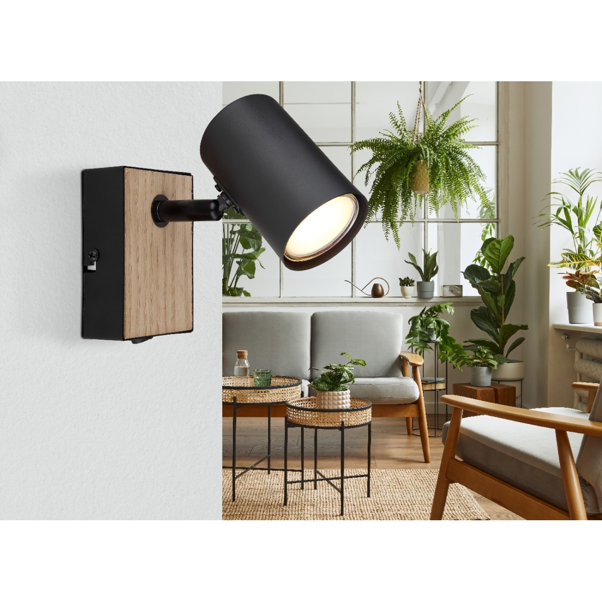 Ovaj jednostavan zidni reflektor serije ROBBY inspiriše dizajnom i bojom. Grlo GU10 prodire iz pravougaonog zidnog nosača napravljenog od crnog mat metala i MDF-a nalik drvetu, prekriveno oblikovanim cilindričnim abažurom. Grlo GU10 vam omogućava slobodan izbor izvora svetlosti, do maksimalne snage od 35 vati.