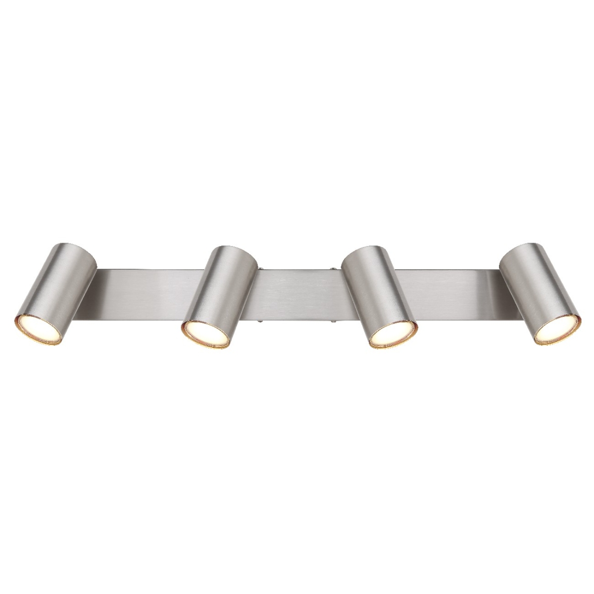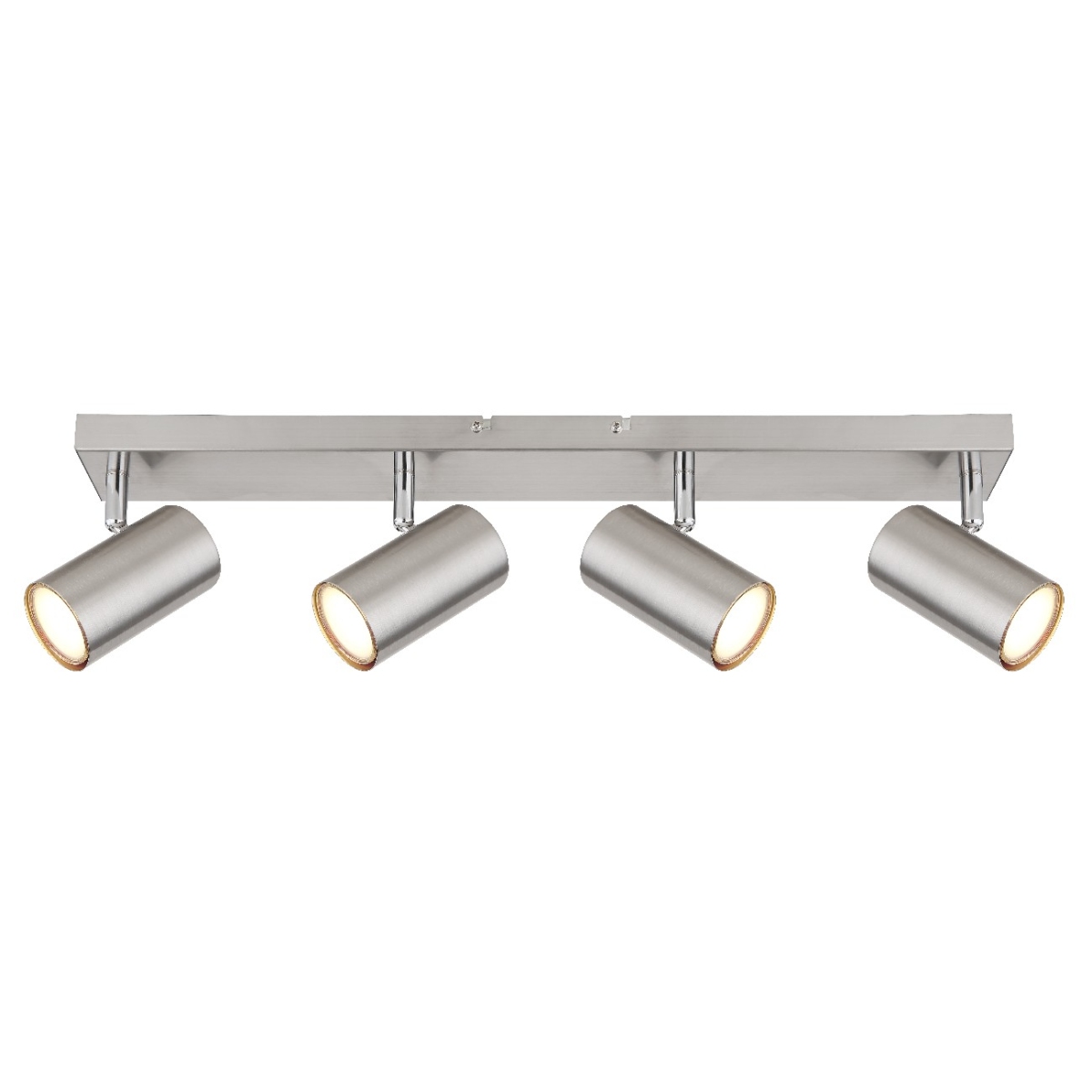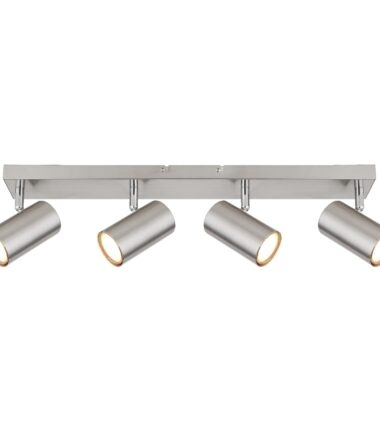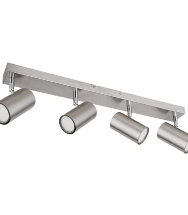 Ovaj jednostavni reflektor iz serije Robi inspiriše dizajnom i bojom. Na pravougaonom plafonskom nosaču u niklovanoj boji (56×6 cm) nalaze se četiri GU10 grla, svako prekriveno cilindričnim abažurom. GU10 grlo vam omogućava da slobodno birate sijalice, do maksimalne snage od 35 vati.