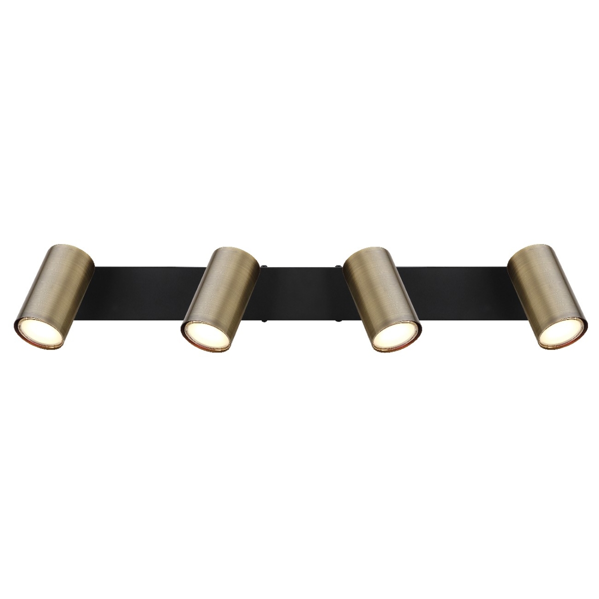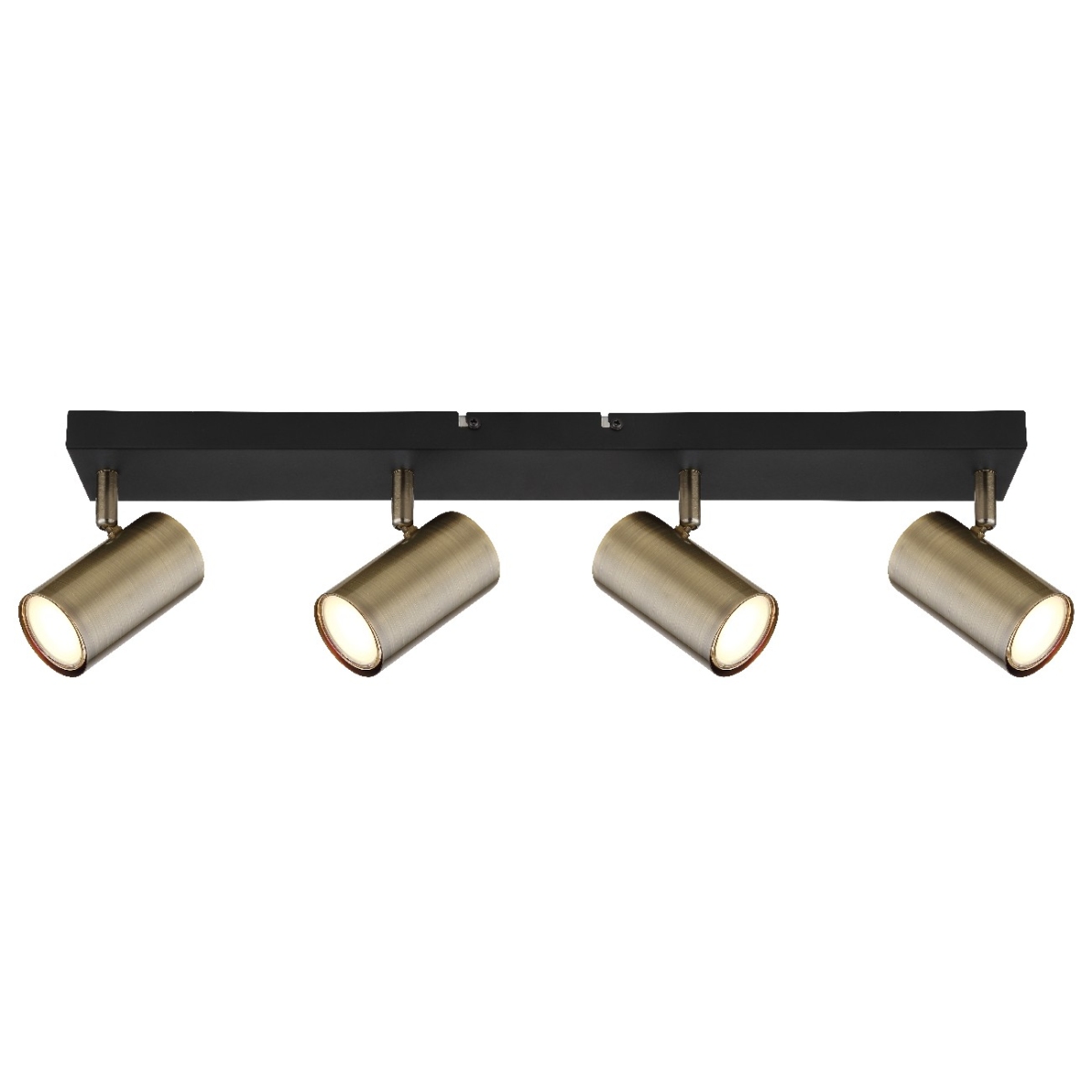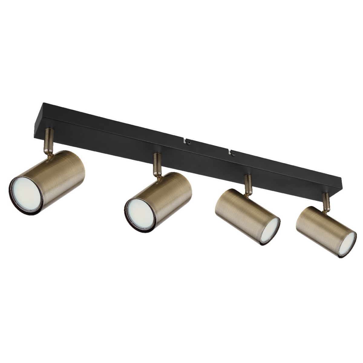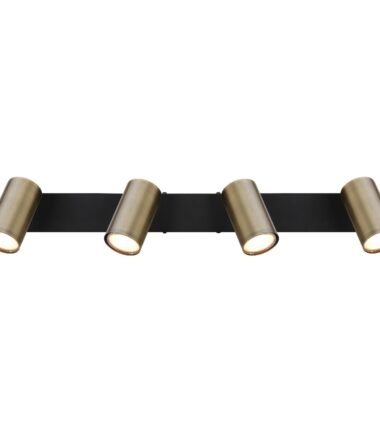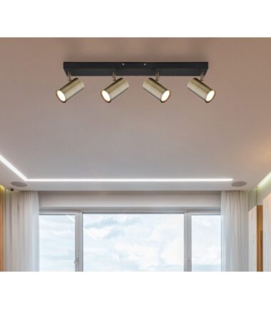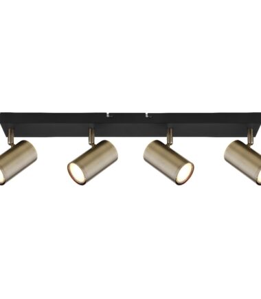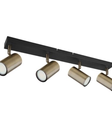 Ovaj jednostavan reflektor serije ROBBY inspiriše dizajnom i bojom. Na pravougaonoj plafonskoj osnovi (56x6cm) u mat crnoj boji postoje četiri GU10 grla, od kojih je svako prekriveno cilindričnim abažurom u boji starog mesinga. Grlo GU10 vam omogućava slobodan izbor izvora svetlosti, do maksimalne snage od 35 vati.