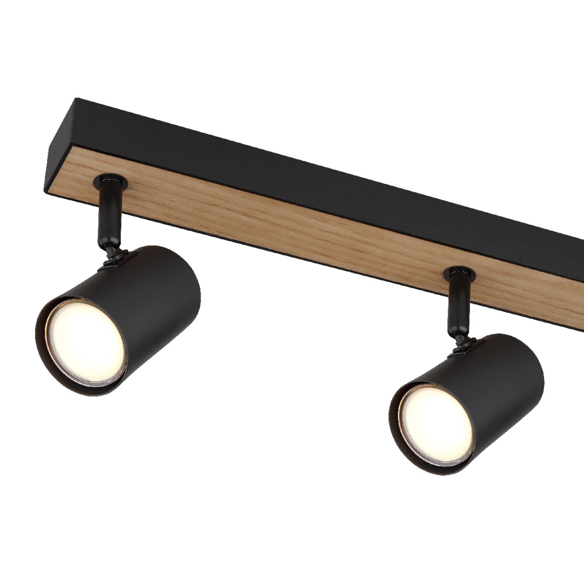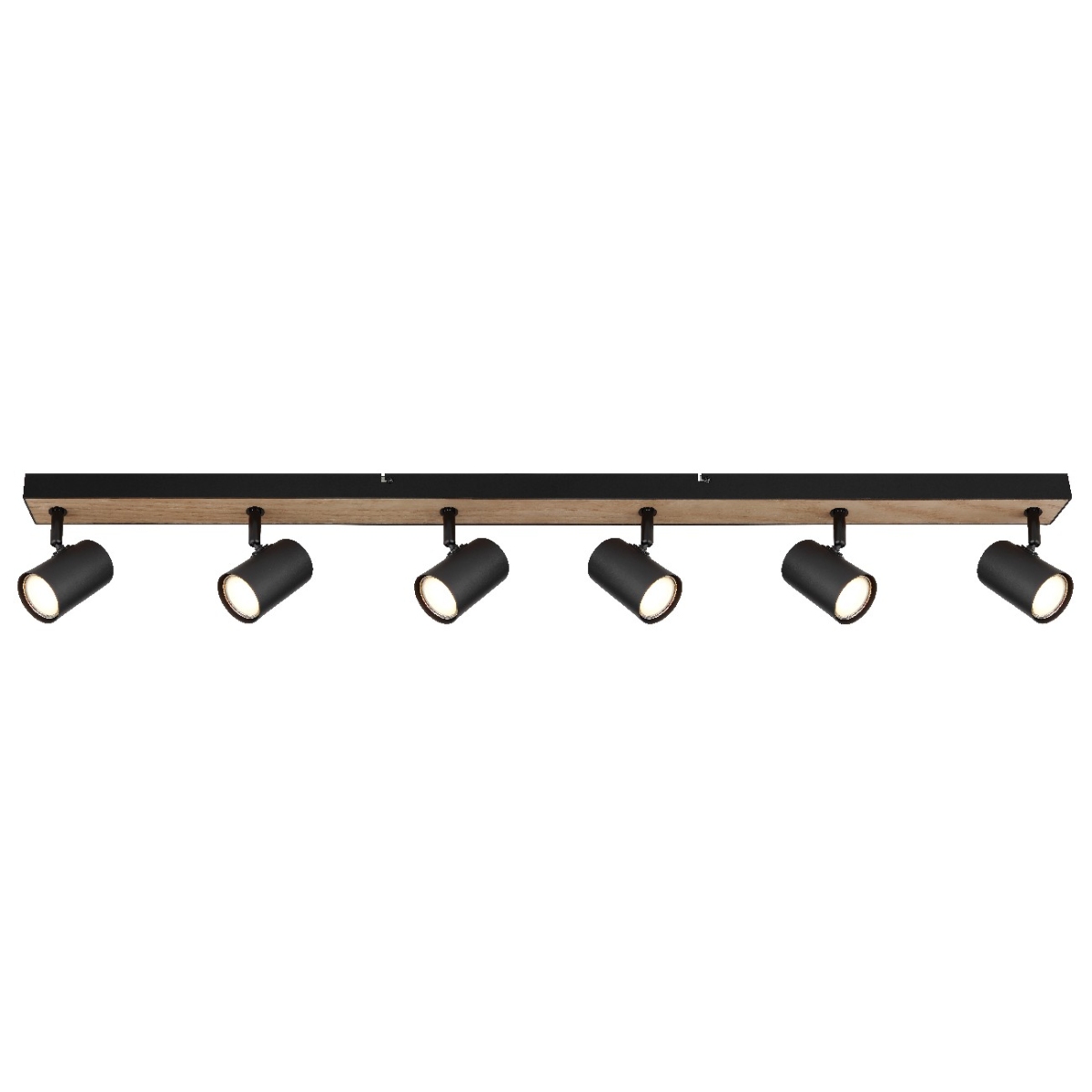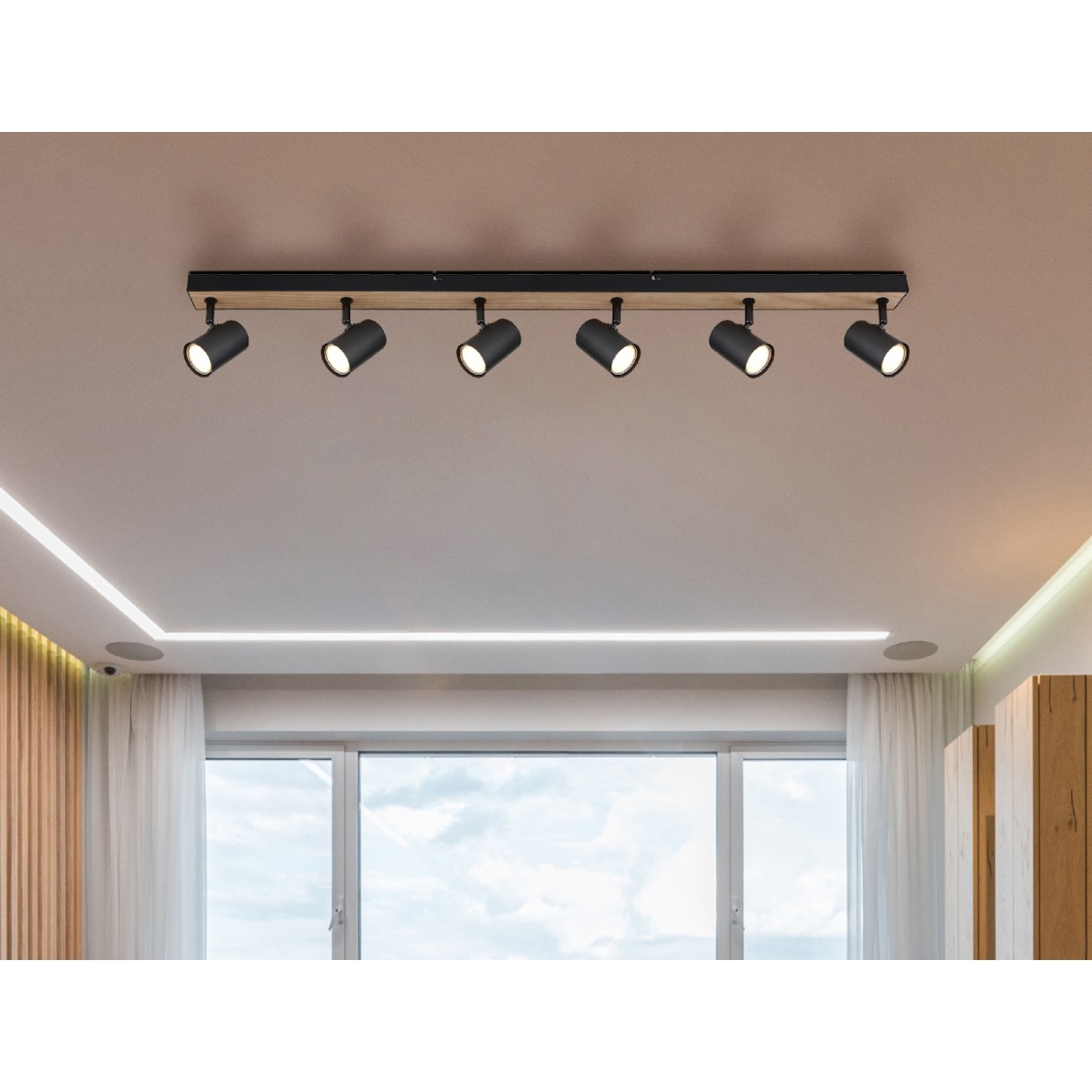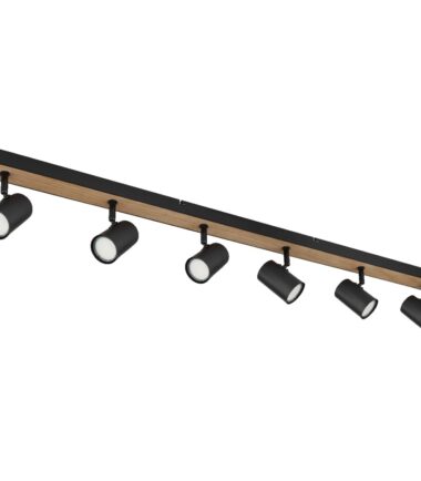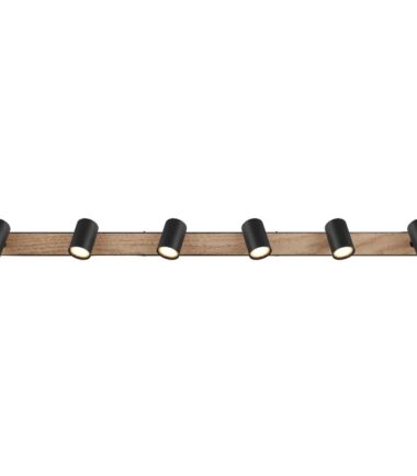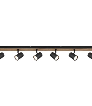 Ovaj jednostavan plafonski reflektor napravljen od crnog mat metala i MDF-a nalik drvetu, serije ROBBY, impresionira svojim neprekidnim dizajnom. Reflektor dugačak skoro 1,2 metara opremljen je sa šest pokretnih GU10 grla. Zbog slobodnog izbora izvora svetlosti, možete sami odrediti boju svetla i jačinu, do maksimalnog izlaza od 35 vati. Zbog njihove uštede energije i dugovečnosti preporučujemo LED sijalice.