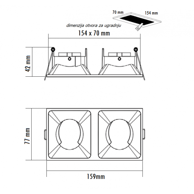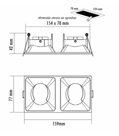 Rozetna pravougaonog oblika, bele boje, koja poseduje dva sijalična mesta za sijalicu tip GU10. Pogodna za osvetljavanje i naglašavanje određenog dela u prostoru.