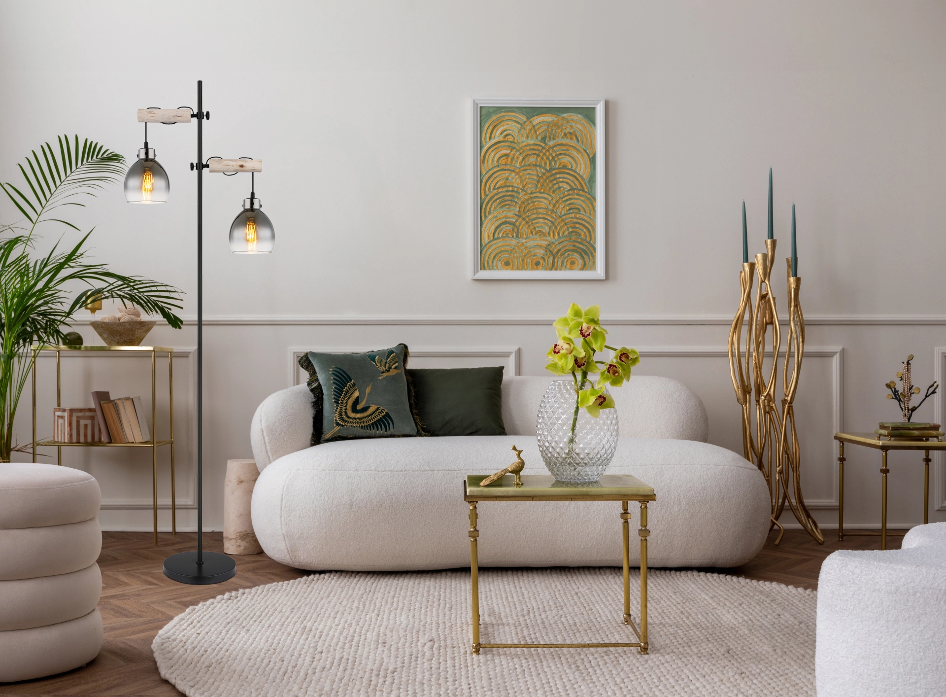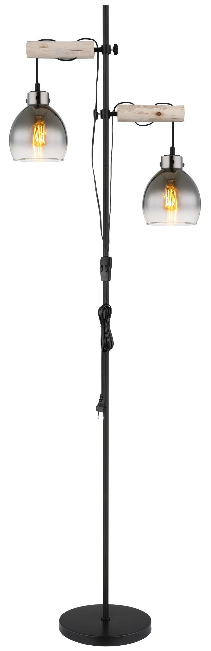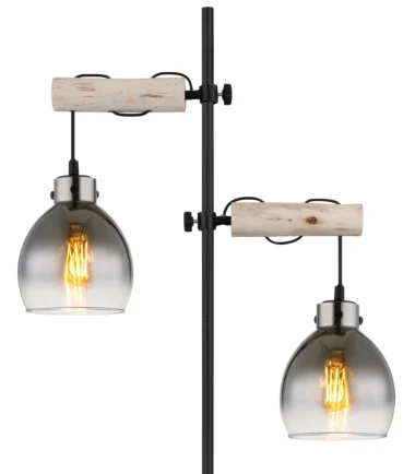 Podna lampa RYAN je pravi klasik koji se ističe svojom vintage estetikom i jednostavnim dizajnom. Telo je napravljeno od crnog, mat lakiranog metala, što daje plemenit utisak. Okrugla stakla u obliku lukovice postavljena su na drvene grede koje podsećaju na vešala, što daje romantičan dodir. Cev je ravna i obezbeđuje stabilno poravnanje svetiljke. Nožni prekidač u kablu omogućava lako i bezbrižno regulisanje osvetljenja. Podna lampa RYAN je savršena za prostorije koje imaju vintage karakter ili žele da stvore takav ambijent. Takođe je pogodna za modernije prostorije gde tražite bezvremenski dizajn.