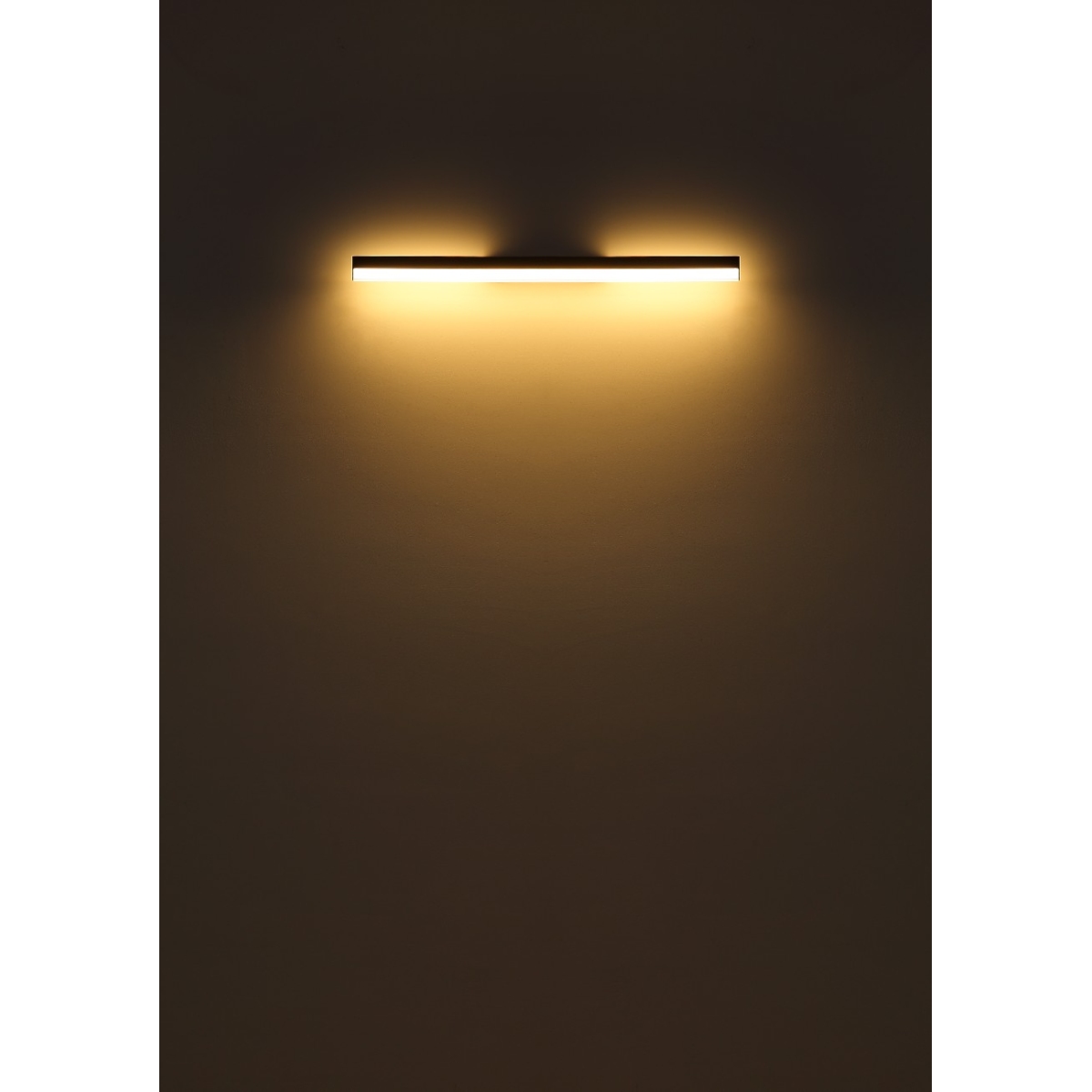 Zidna lampa izrađena od crnog mat metala i crnog mat aluminijuma kao i opal akrila, koji je raspoređen u prečniku od 800x40x65 mm (DxŠ,V). Lampa se dobija sa LED sijalicom snage od 18W. Privlačiće poglede i predviđena je za moderan stil opremanja. Sa LED sijalicom štedite energiju i štitite životnu sredinu. Na sebi ima preklopni prekidač za pojedinačno podešavanje osvetljenja. Boje se mogu menjati i fiksirati između toplo bele 3000K i hladno bele 6000K.