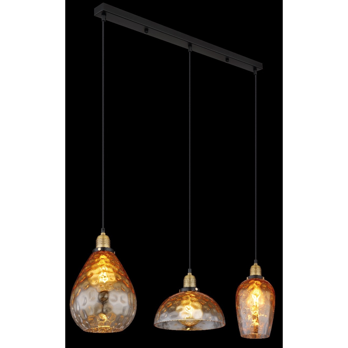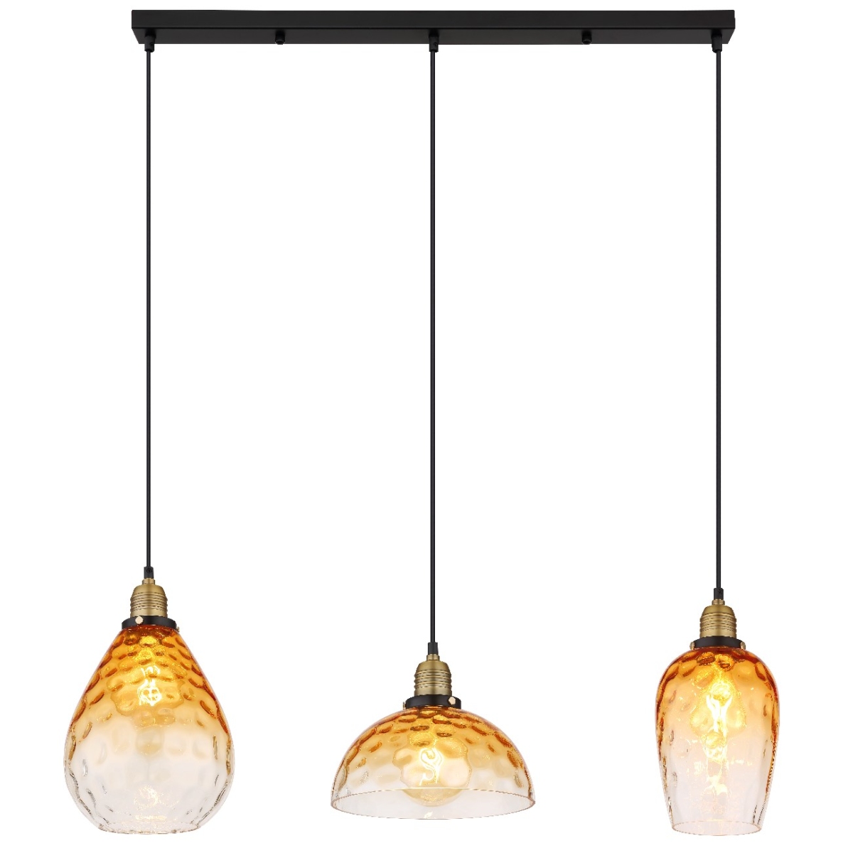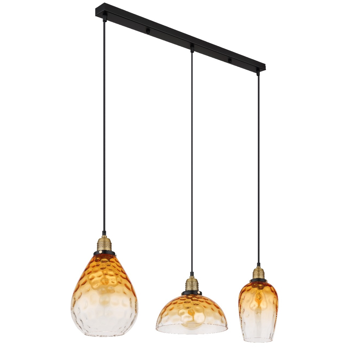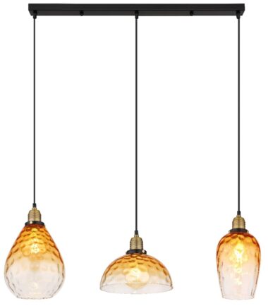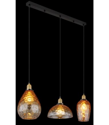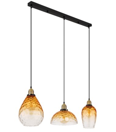 Otkrijte impresivnu visilicu sa 3XE27 grlom. Kombincija crnog mat metala sa providnim ćilibarom, ova lampa će vašem prostoru dodati mestimičnu atmosferu. Mesingani mat akcenat metala podvlači elegantan dizajn. Sa dimenzijama 910x250x1200mm, ova visilica postaje detalj koji će privlačiti pažnju u svakoj sobi. Različiti prečnici stakala od 15 cm, 21 cm i 25 cm stvaraju dinamičan izgled. E27 grla vam omogućavaju da sami odredite boju svetla i jačinu do maksimalne snage od 60 vati. Stvorite toplu i gostoljubivu atmosferu.