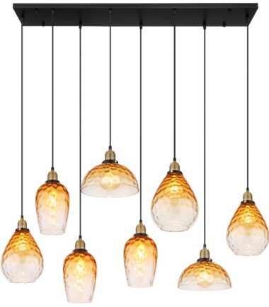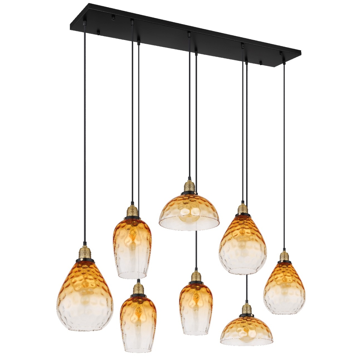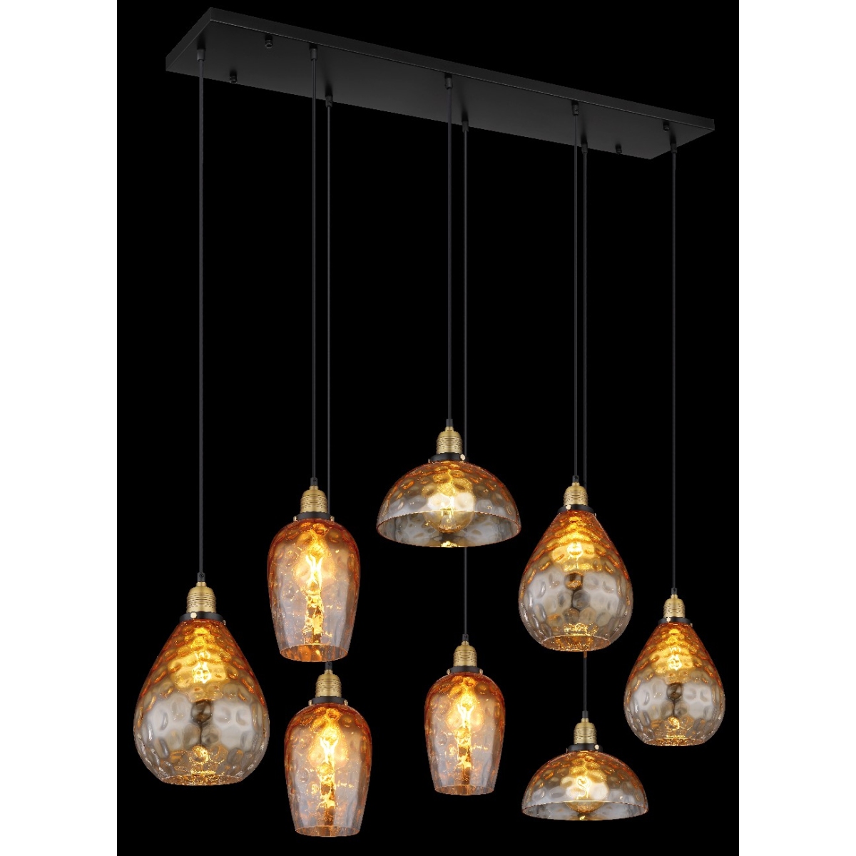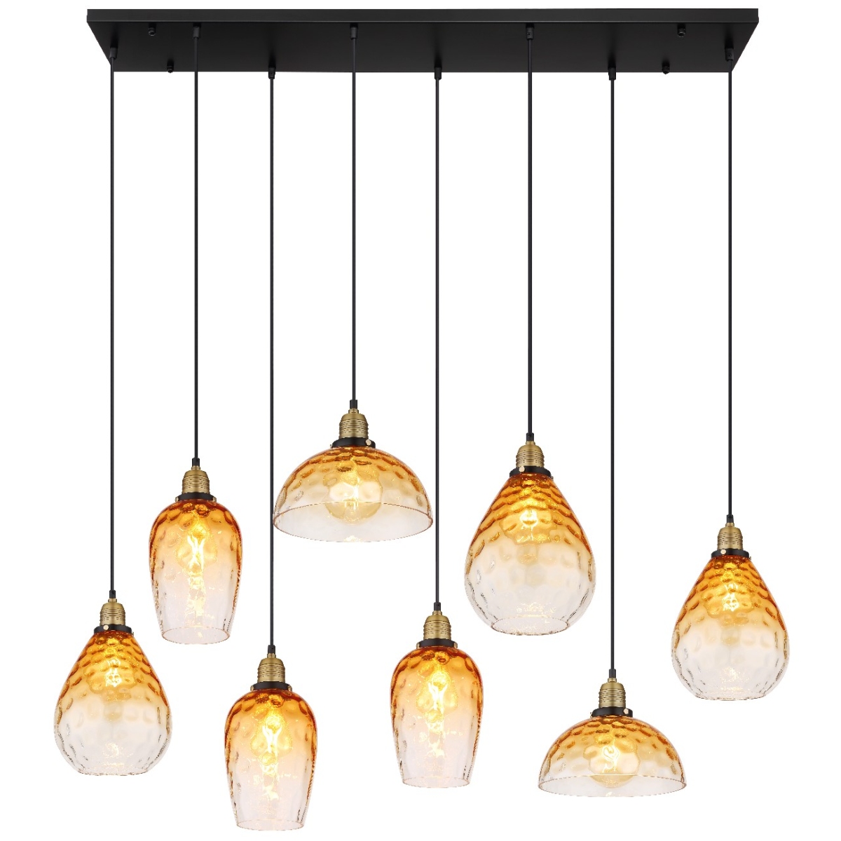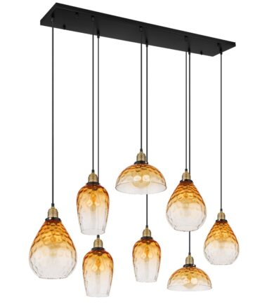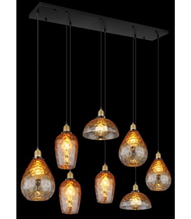 Neka vaše sobe sijaju impresivnim svetlom sa visilicom i njenim 8XE27 grlima. Mat crni metal u kombinaciji sa fascinantnim providnim staklom od ćilibara čini ovu lampu pravim umetničkim delom. Mesingano mat naglašavanje metala daje lampi prefinjen dodir. Crni PVC kabl savršeno upotpunjuje elegantan izgled. Dimenzijama 1250x410x1300mm, ova visilica privlači svačiju pažnju. Različiti prečnici stakla od 15 cm, 21 cm i 25 cm obezbeđuju skladan balans. E27 grla vam omogućavaju da sami odredite boju svetla i jačinu do maksimalne snage od 60 vati. Unesite svoje prostore u život.