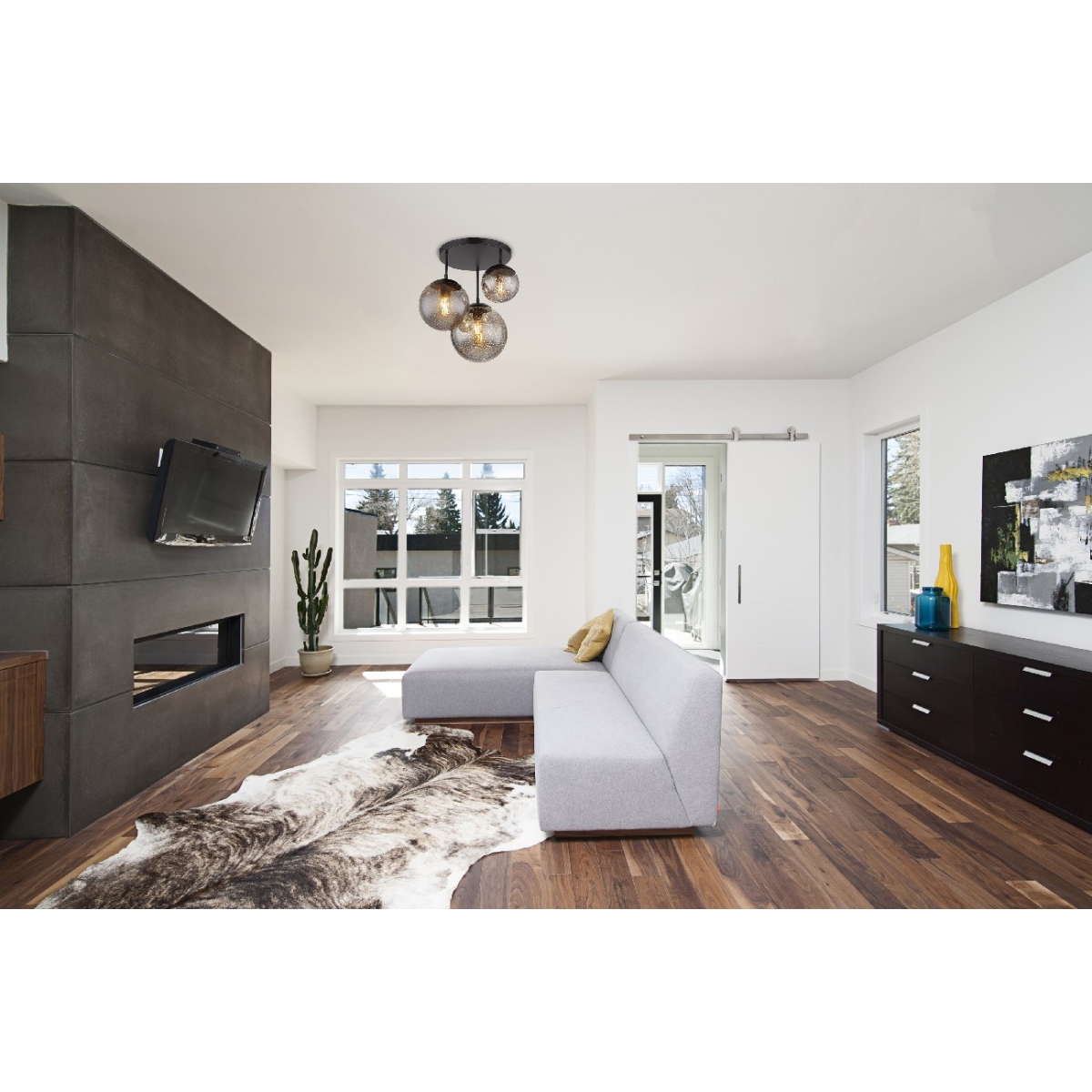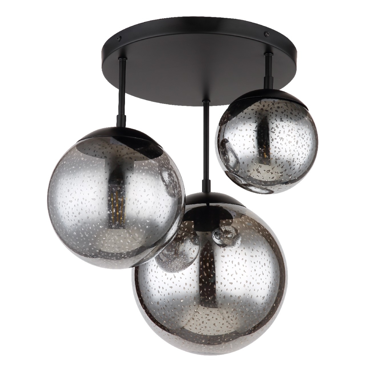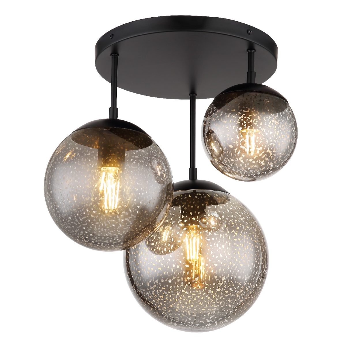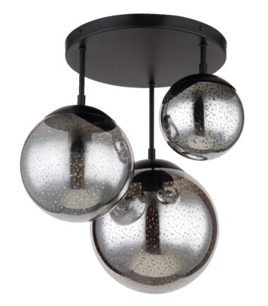 Ova prelepa plafonska lampa impresionira sjajnim dizajnom. Tri crne metalne šipke dužine do 44 cm nastavljaju se na okruglu plafonsku osnovu i svaka se završava na E27 grlom. Staklene kugle u tri različite veličine sa zvezdanim efektom upotpunjava sjajnu celokupnu sliku. Grla E27 vam omogućavaju da sami odredite boju svetla i jačinu do maksimalnog izlaza od 9 vati. Zbog dugovečnosti i uštede energije preporučujemo LED sijalice.