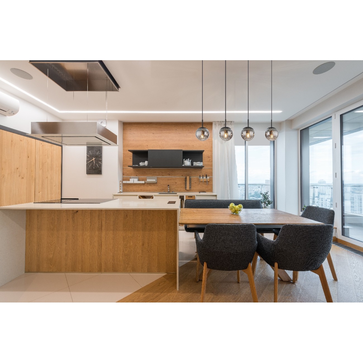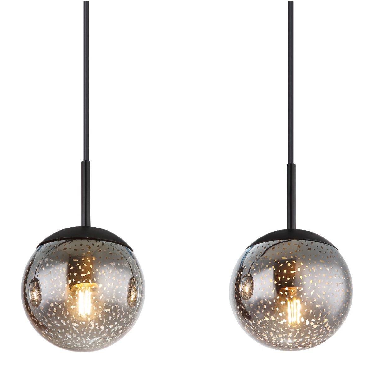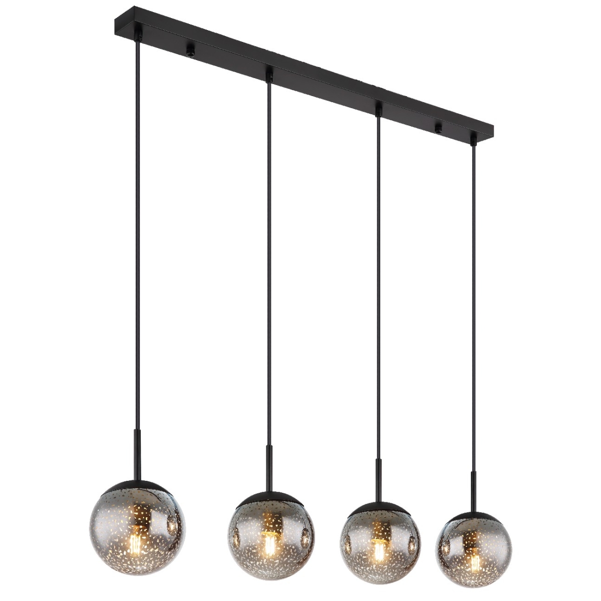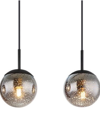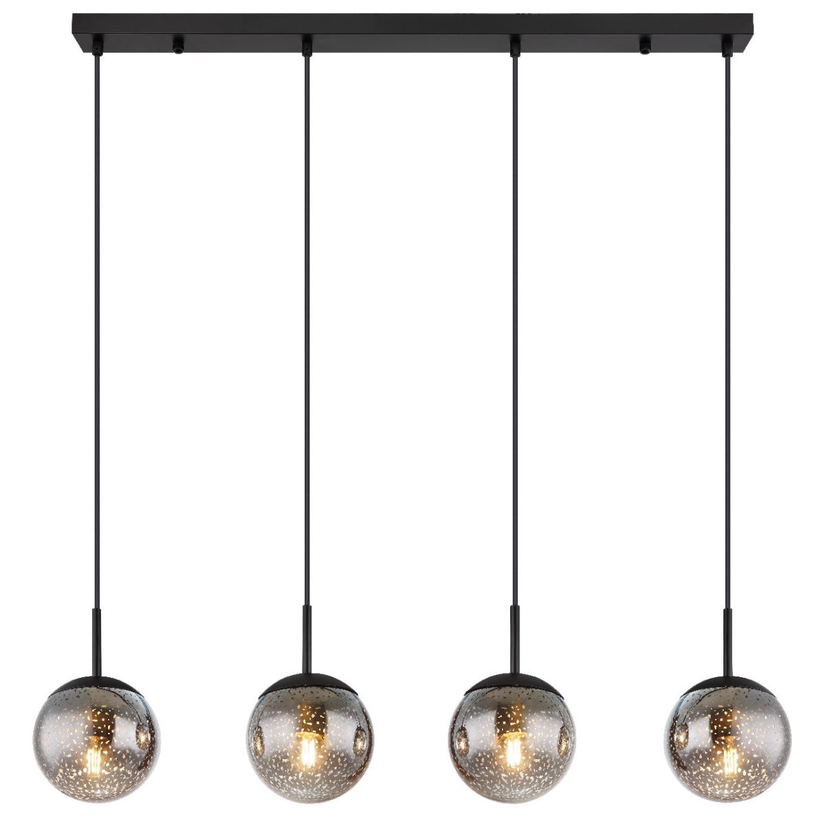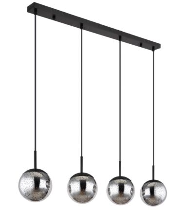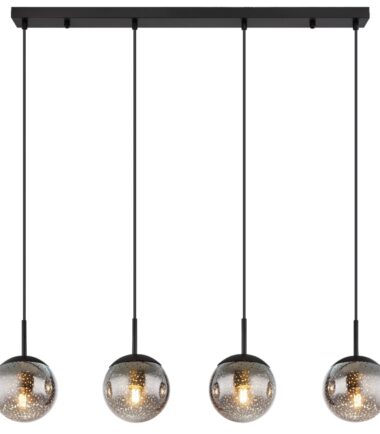 Ova prelepa visilica impresionira sjajnim dizajnom. Četiri kabla dugačka 1,2 m nastavljaju se crni metalni plafonski nosač dužine 90 cm, od kojih svaki ima E27 grlo. Stakleni abažuri sa prelepim zvezdanim efektom upotpunjuju celokupnu sliku ove visilice. Grla E27 vam omogućavaju da sami odredite boju svetla i jačinu do maksimalnog izlaza od 9 vati. Zbog dugovečnosti i uštede energije preporučujemo LED sijalice.