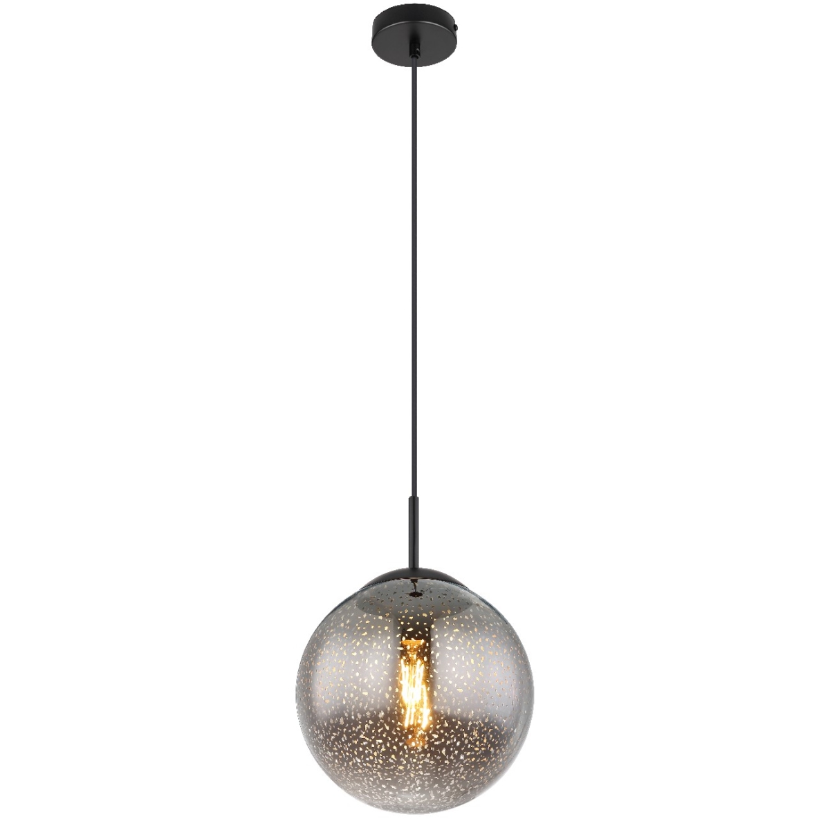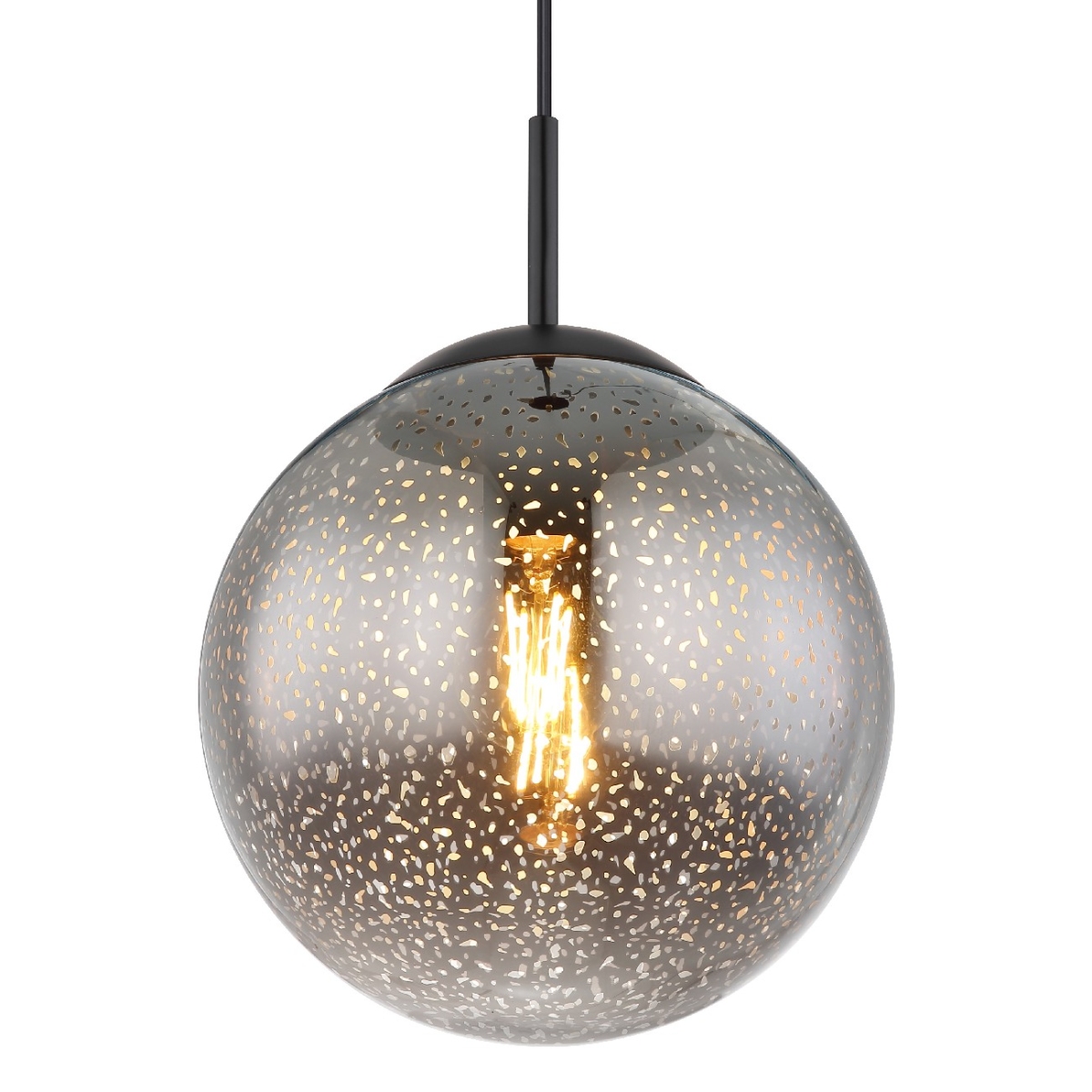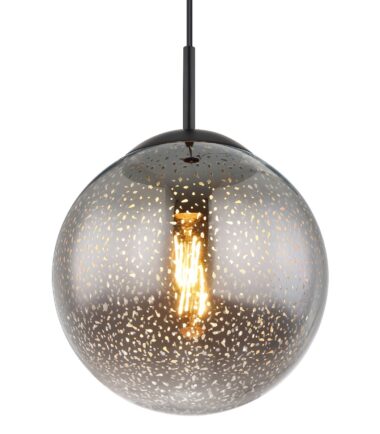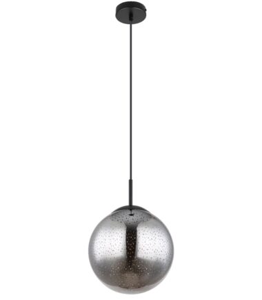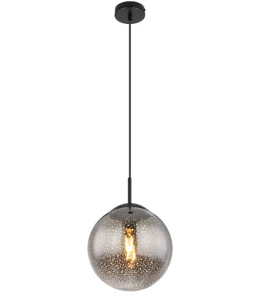 Ova prelepa visilica impresionira sjajnim dizajnom. Crni kabl dugačak 1,2 m ide od okrugle plafonske osnove do grla E27, koje je opremljeno oblikovanim staklenim abažurom sa zvezdanim efektom (Ø 25 cm). E27 grlo vam omogućava da sami odredite boju svetla i jačinu do maksimalne snage od 9 vati. Zbog dugovečnosti i uštede energije preporučujemo LED sijalice.