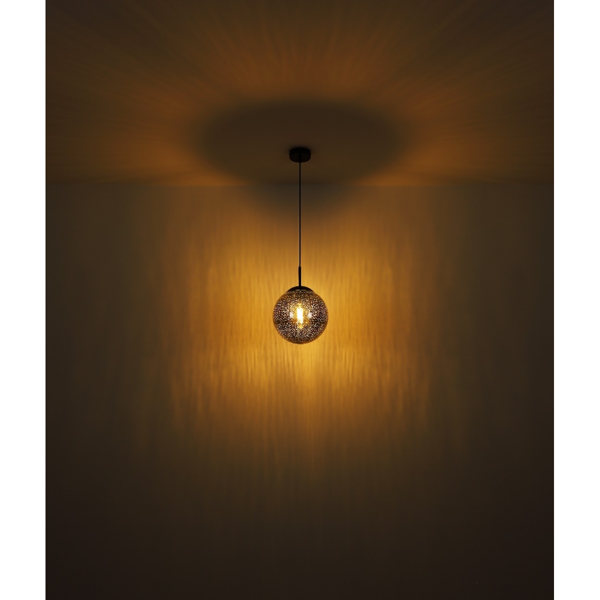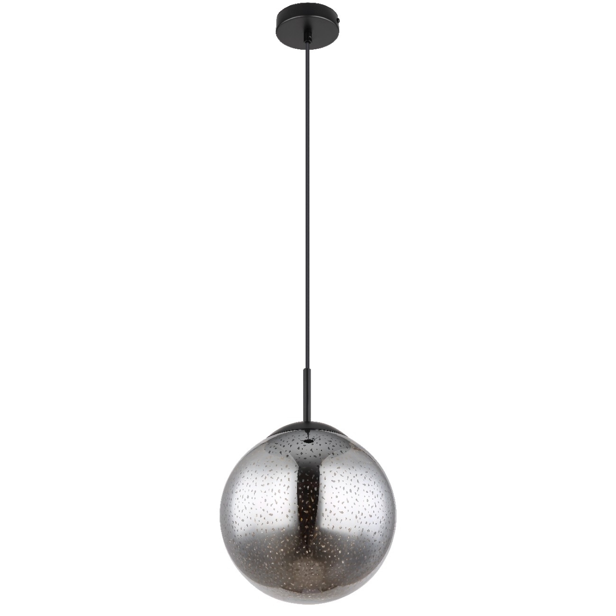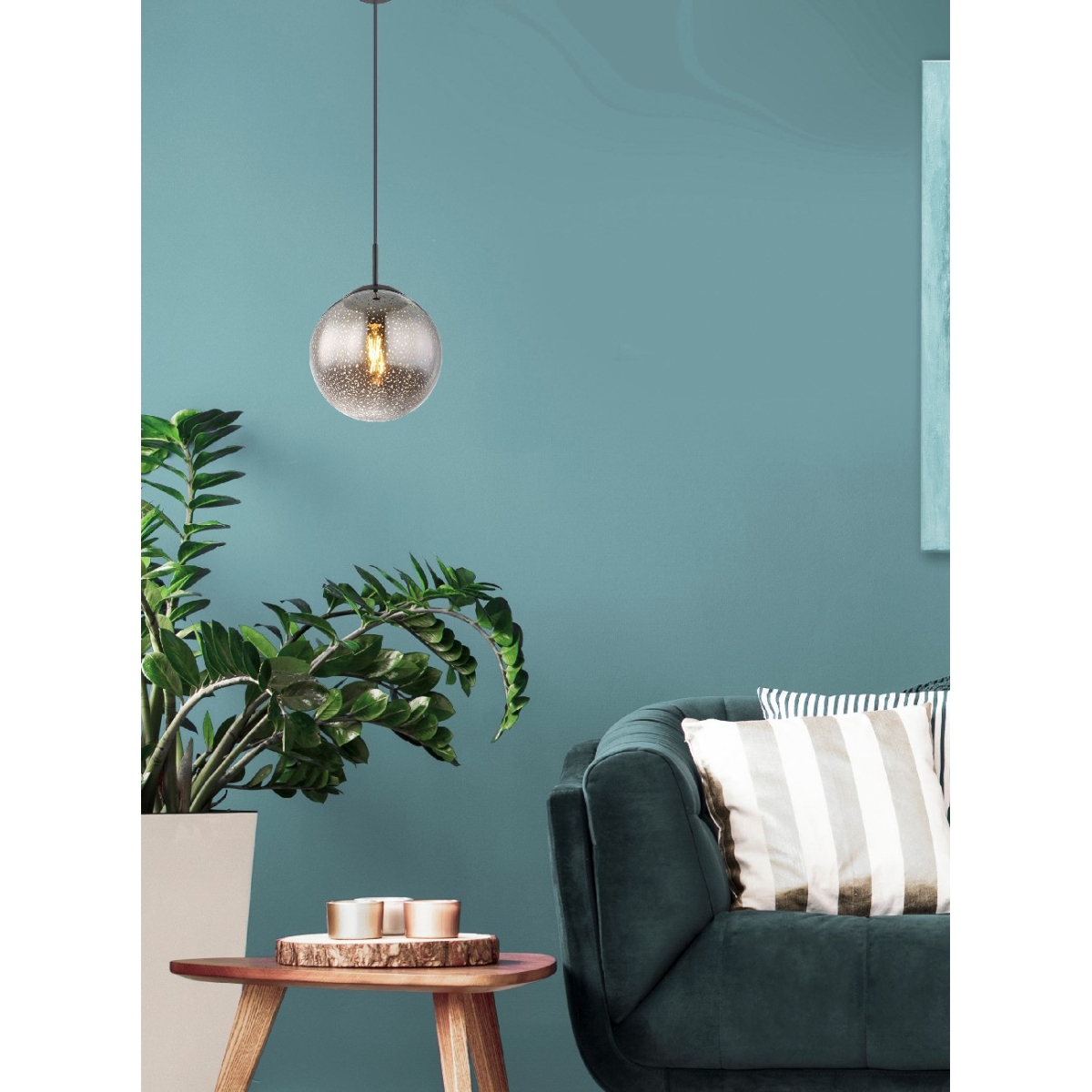 Ova prelepa visilica impresionira sjajnim dizajnom. Crni kabl dugačak 1,2 m ide od okrugle plafonske osnove do grla E27, koje je opremljeno oblikovanim staklenim abažurom sa zvezdanim efektom (Ø 25 cm). E27 grlo vam omogućava da sami odredite boju svetla i jačinu do maksimalne snage od 9 vati. Zbog dugovečnosti i uštede energije preporučujemo LED sijalice.