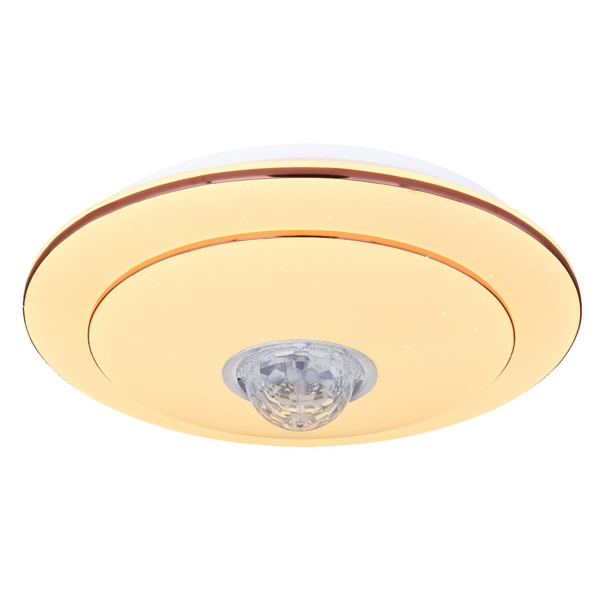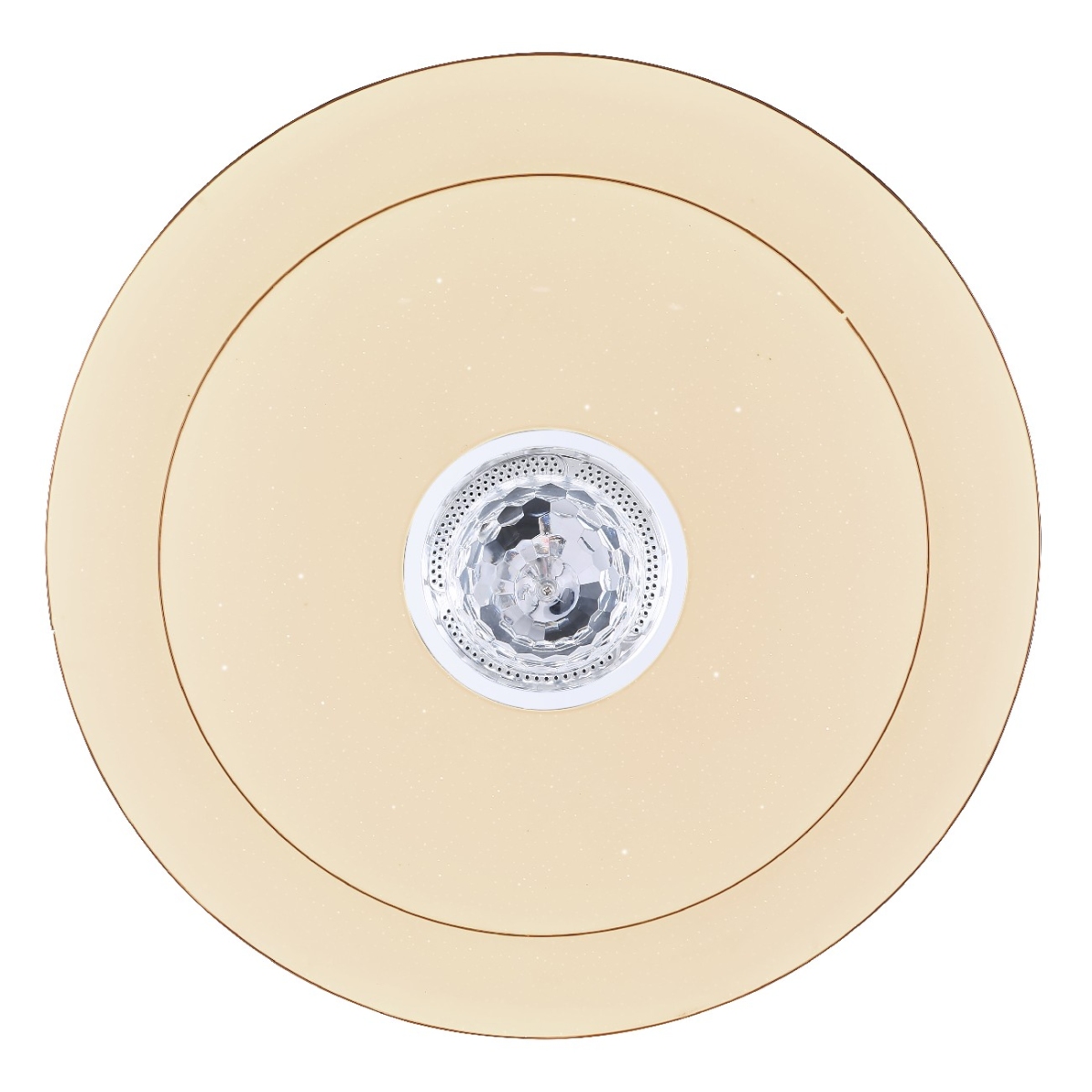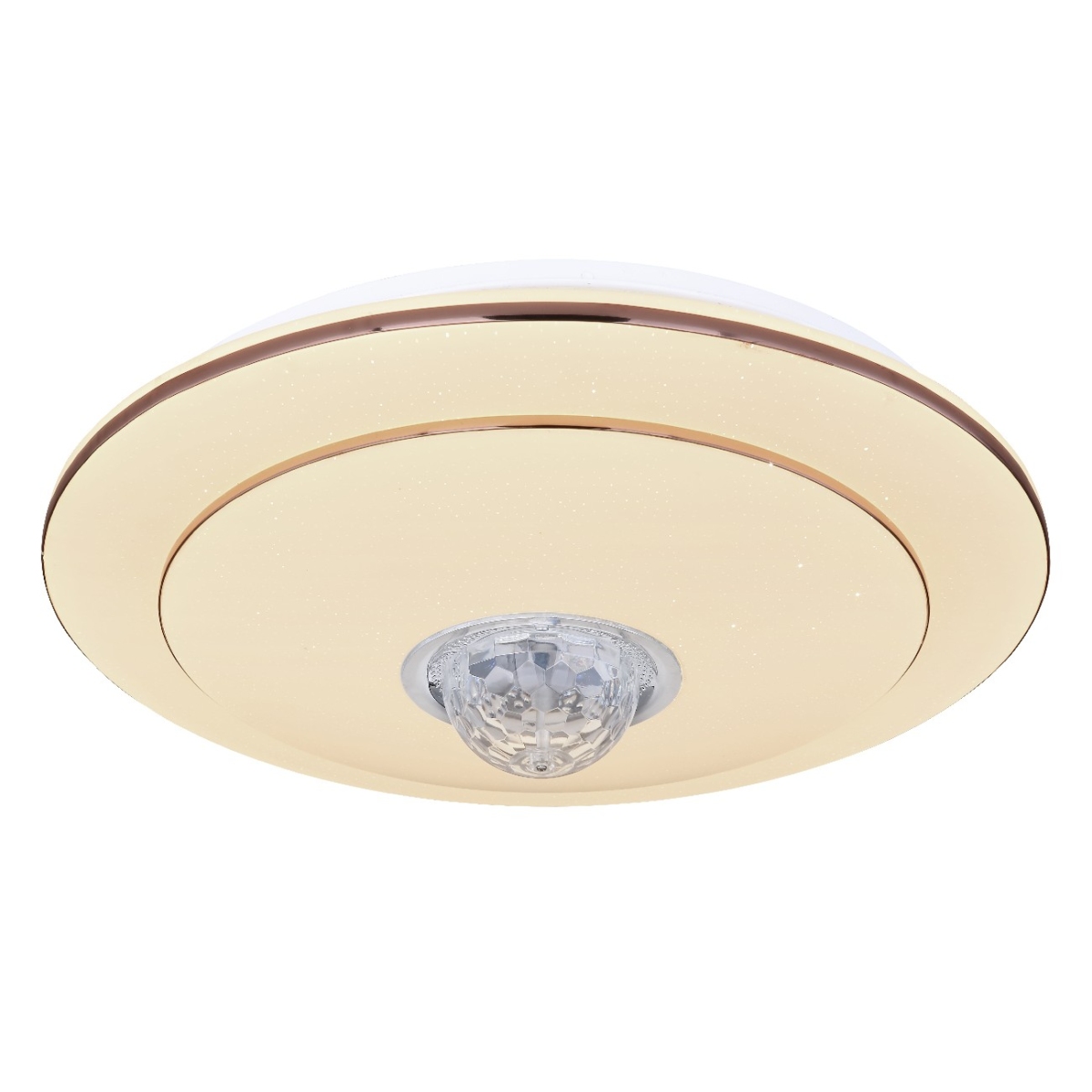 Model SANTINA je univerzalni model klasičnog dizajna. Dok okrugli sparkle dekor plastični abažur (Ø50cm) ove plafonske lampe sa mogućnošću zatamnjivanja izgleda prilično klasično, skoro svaku želju možete ispuniti uz pomoć uključenog daljinskog upravljača ove plafonske lampe. Dok možete stalno da podešavate temperaturu svetlosti između toplo bele 3000 K i hladno bele. Možete podesiti i boju svetla (crvenu, zelenu, plavu) sa RGB funkcijom i na taj način prilagoditi svetlo na odgovarajuće situacije i raspoloženje. Paket performansi ove lepotice je zaokružen funkcijom zvučnika. Pomoću Bluetooth veze možete da povežete telefon sa 5W jakim zvučnikom i reprodukujete omiljenu muziku.