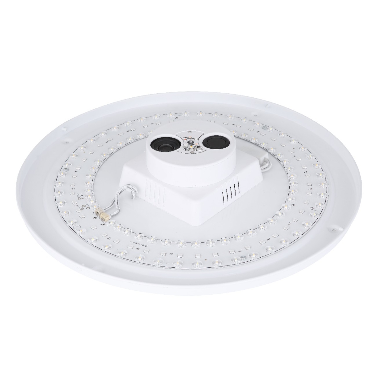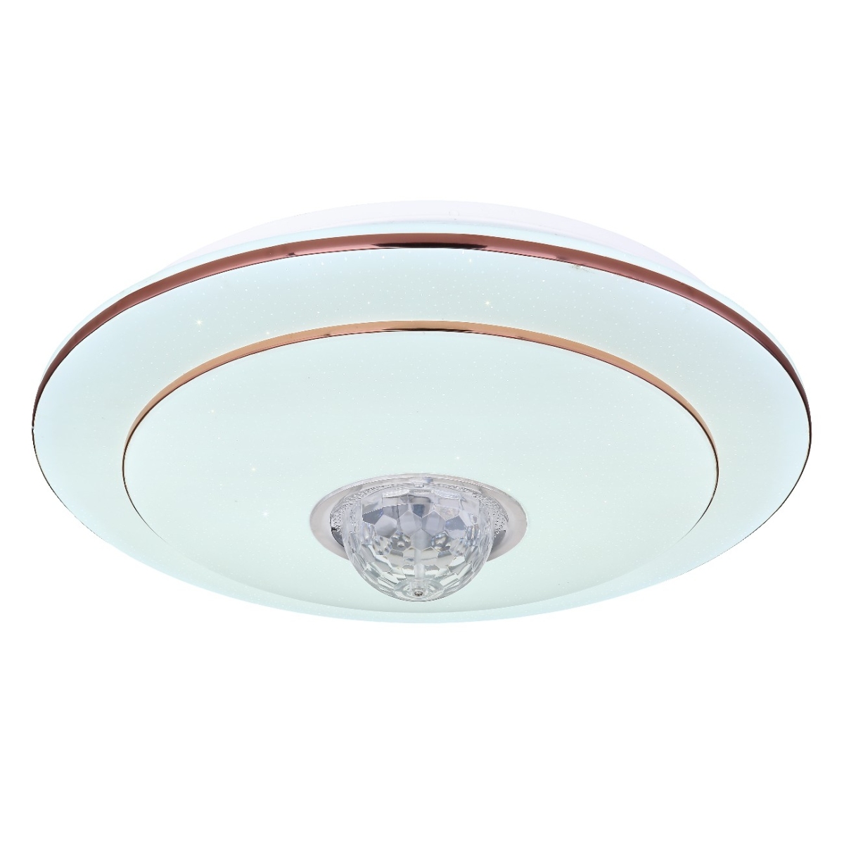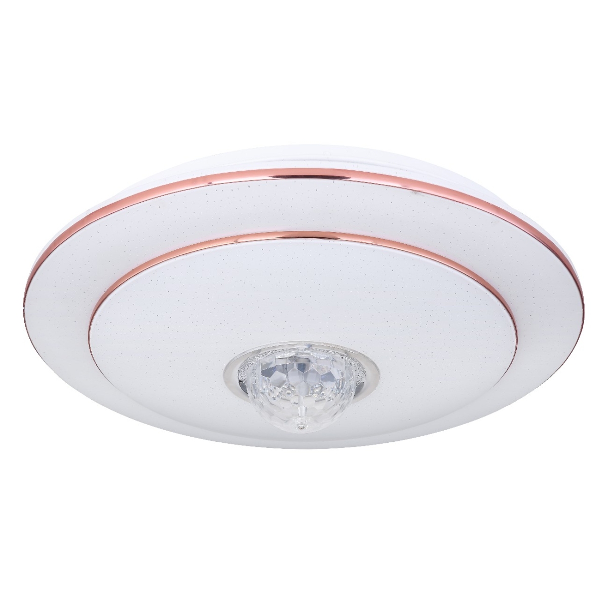 Model SANTINA je univerzalni model klasičnog dizajna. Dok okrugli sparkle dekor plastični abažur (Ø50cm) ove plafonske lampe sa mogućnošću zatamnjivanja izgleda prilično klasično, skoro svaku želju možete ispuniti uz pomoć uključenog daljinskog upravljača ove plafonske lampe. Dok možete stalno da podešavate temperaturu svetlosti između toplo bele 3000 K i hladno bele. Možete podesiti i boju svetla (crvenu, zelenu, plavu) sa RGB funkcijom i na taj način prilagoditi svetlo na odgovarajuće situacije i raspoloženje. Paket performansi ove lepotice je zaokružen funkcijom zvučnika. Pomoću Bluetooth veze možete da povežete telefon sa 5W jakim zvučnikom i reprodukujete omiljenu muziku.