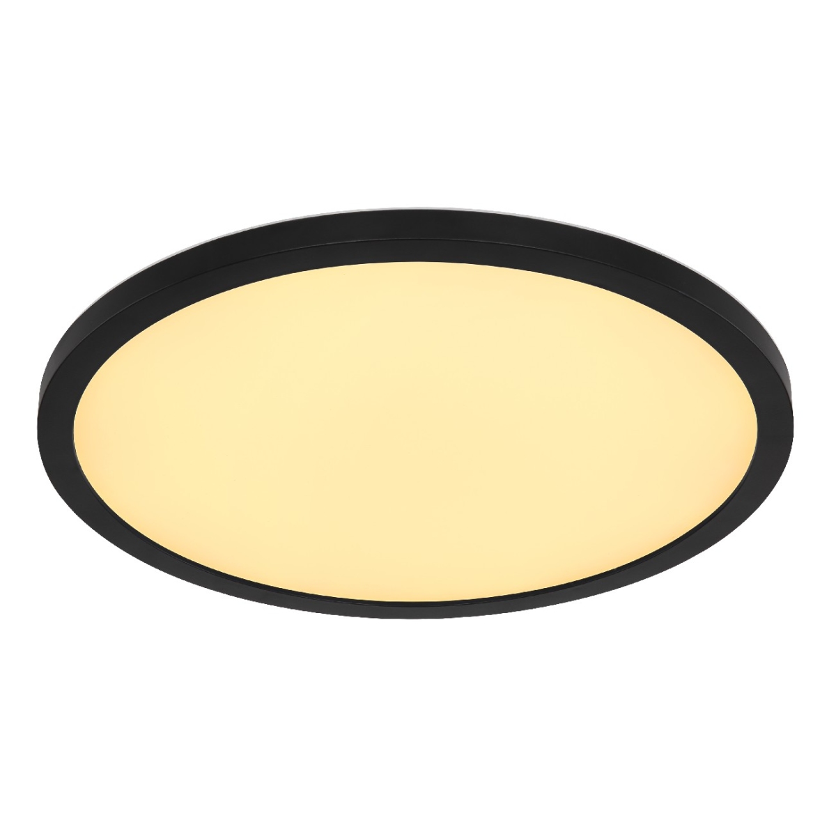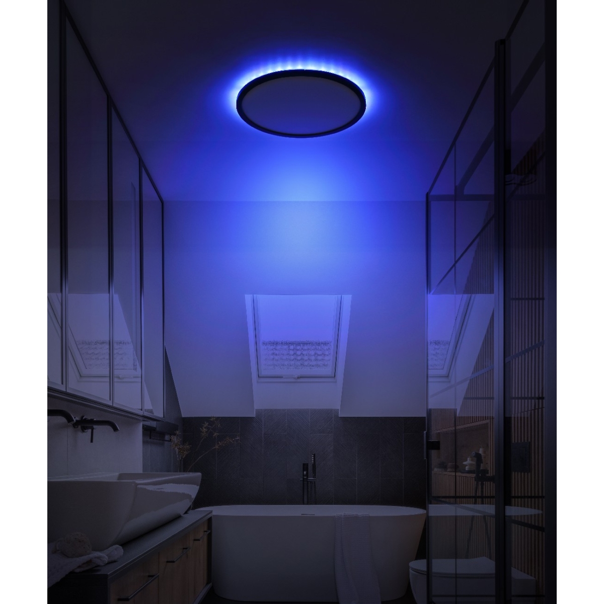 Ova kružna plafonska lampa SAPANA (ø 29 cm) je divna za vaš enterijer. Crni spoljni prsten u kombinaciji sa opalnom plastikom doprinosi savršeno oblikovanom izgledu plafonske lampe. Sa integrisanim LED sijalicama, plafonska lampa Sapana pruža 1600 Lumena jako svetlo. Uz pomoć uključenog daljinskog upravljača, ne samo da možete da prigušite plafonsku lampu, već i da imate boju svetla pojedinačno podešenu i fiksiranu u nekoliko faza između 3000 Kelvina (topla bela) i 6000 Kelvina (hladno bela). Pored toga, ima RGB funkciju pozadine, sa kojom možete šareno osvetliti površinu iznad plafonske lampe, a dodatno i funkciju noćnog svetla za prijatno svetlo. Osim toga, ova lampa ima funkciju pamćenja i tajmer. Zahvaljujući IP44 stepenu zaštite, ova plafonska lampa je takođe zaštićena od prskanja vode.