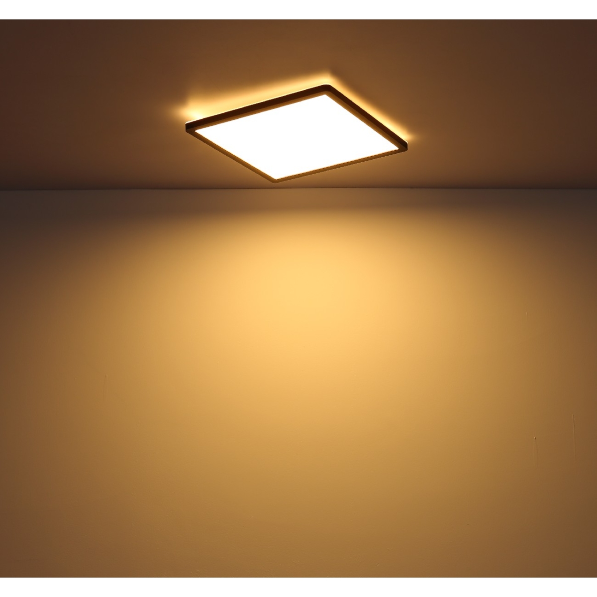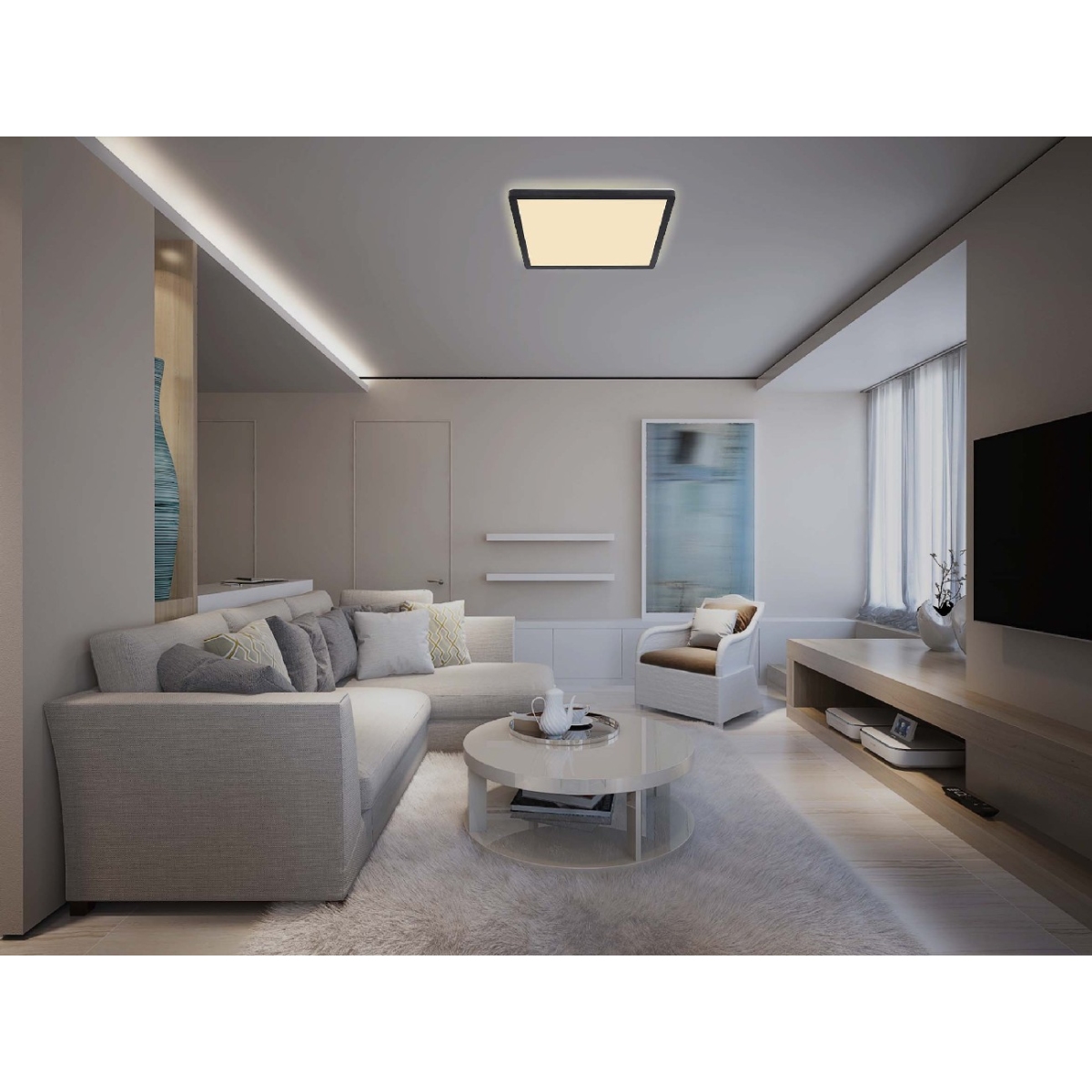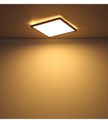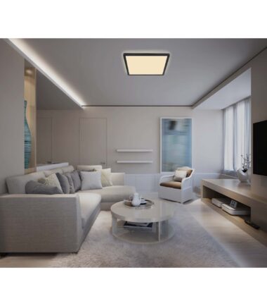 Ova četvrtasta plafonska lampa (42x42cm) serije SAPANA ulepšava vaše sobe drugim izvorom svetlosti. Crni mat ram obavija integrisanu LED sijalicu koja emituje prijatno toplo belo svetlo i takođe ima zadnje svetlo i funkciju memorije.