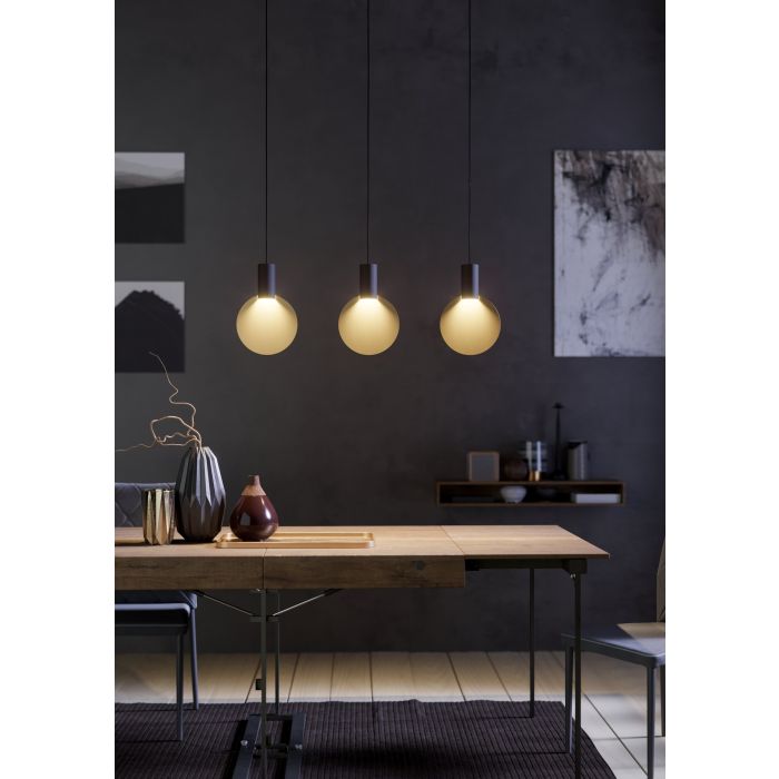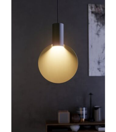 SARONA LED viseća lampa ima tri okrugla čelična diska zlatne boje, svaki sa cilindričnim čeličnim akcentima u crnoj boji. Držači lampi se nalaze unutar cilindara i stvaraju efekat indirektnog osvetljenja sa obe strane diskova zlatne boje, zajedno sa bacanjem svetlosti direktno nadole. Crni čelični plafonski nosač i visokokvalitetni crni tekstilni kablovi upotpunjuju moderan izgled svetla. Proizvod uključuje tri LED sijalice koje proizvode prijatno toplo belo svetlo. Svojom ubedljivom kombinacijom oblika, privezak se neprimetno uklapa u moderne enterijere i predstavlja elegantno rešenje za osvetljenje dnevne sobe ili trpezarije. Svetlo ima držače lampe GU10 i zahteva tri GU10-LED sijalice
