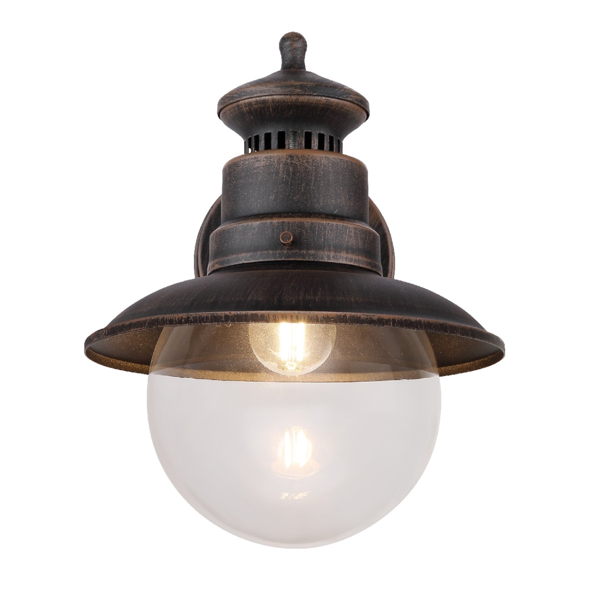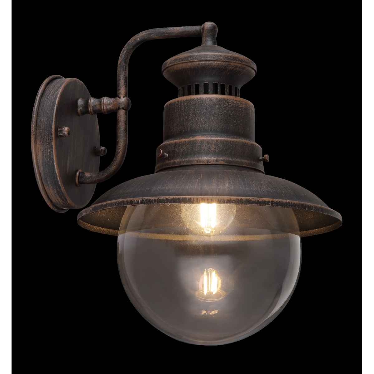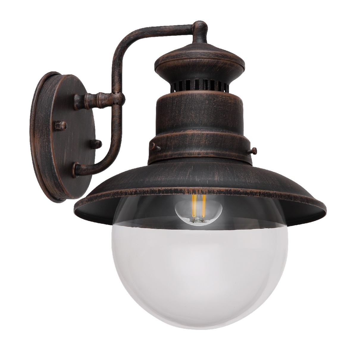 Ova prelepa spoljašnja lampa u tradicionalnom stilu napravljena je od čelika u boji rđe i prozirnih stakla. Klasičan dizajn ove zidne lampe veličine skoro 30 centimetara čini je svestranom. Oblikovana zakrivljena grana nosi providnu staklenu kuglu u kojoj se nalazi E27 grlo, koje vam ostavlja izbor izvora svetlosti (max. 60W) a samim tim i intenzitet svetlosti i boje svetla. Zbog njihove uštede energije i dugovečnosti preporučujemo LED sijalice.