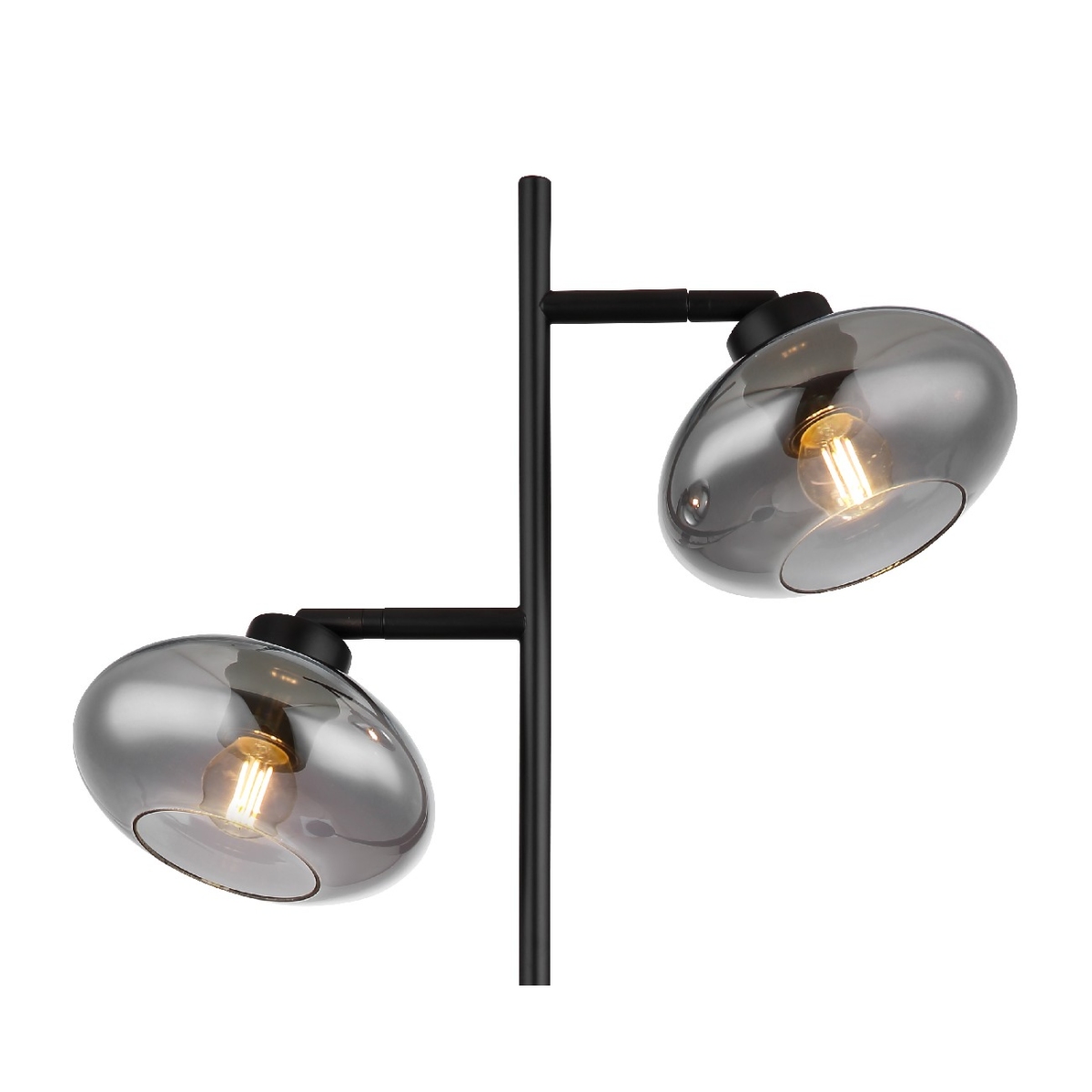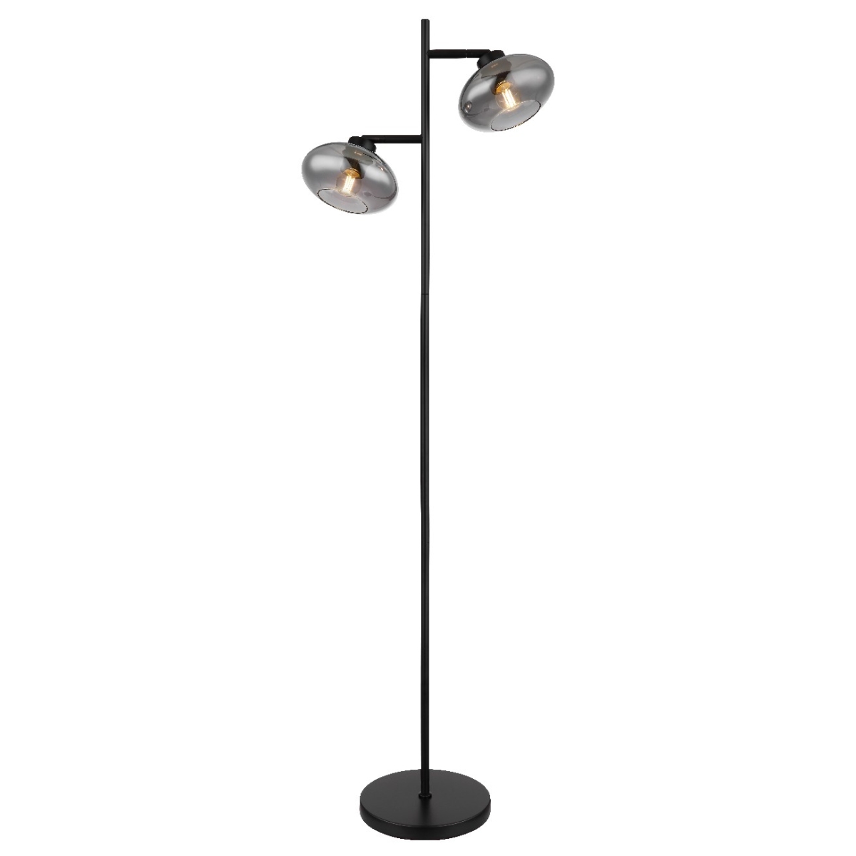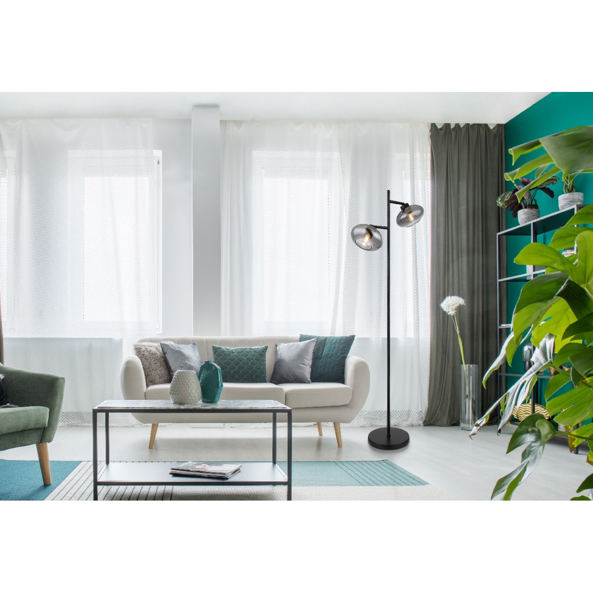 Ovu podna lampa serije SHAUN ubeđuje stilskim dizajnom. Metalna šipka dugačka 1,5 m u mat crnoj boji nastavlja se na okruglu osnovu, na njoj se nalaze dva grla E27, svako sa oblikovanim staklenim abažurom u boji dima. Grla E27 vam omogućavaju da slobodno odaberete laganu boju i boju svetla do maksimalnog izlaza od 40 vati.