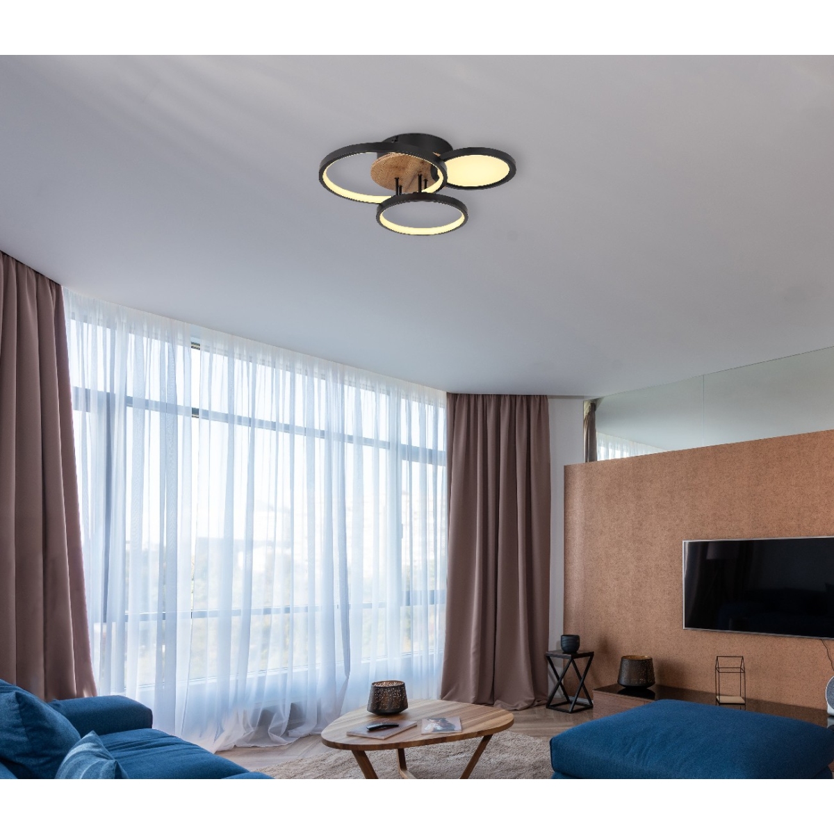 Ova divna plafonska lampa iz serije SID inspiriše sjajnim dizajnom. Od okruglog plafonskog nosača koji je u mat crnoj boji sa prelepom dekoracijom drvenog izgleda isturena su tri okrugla svetlosna elementa u različitim veličinama (40x38cm) svaki sa integrisanim LED panelima koje emituju toplo belu svetlost od 3000 Kelvina i tako obezbeđuju prijatnu atmosferu.
