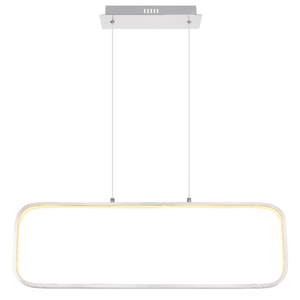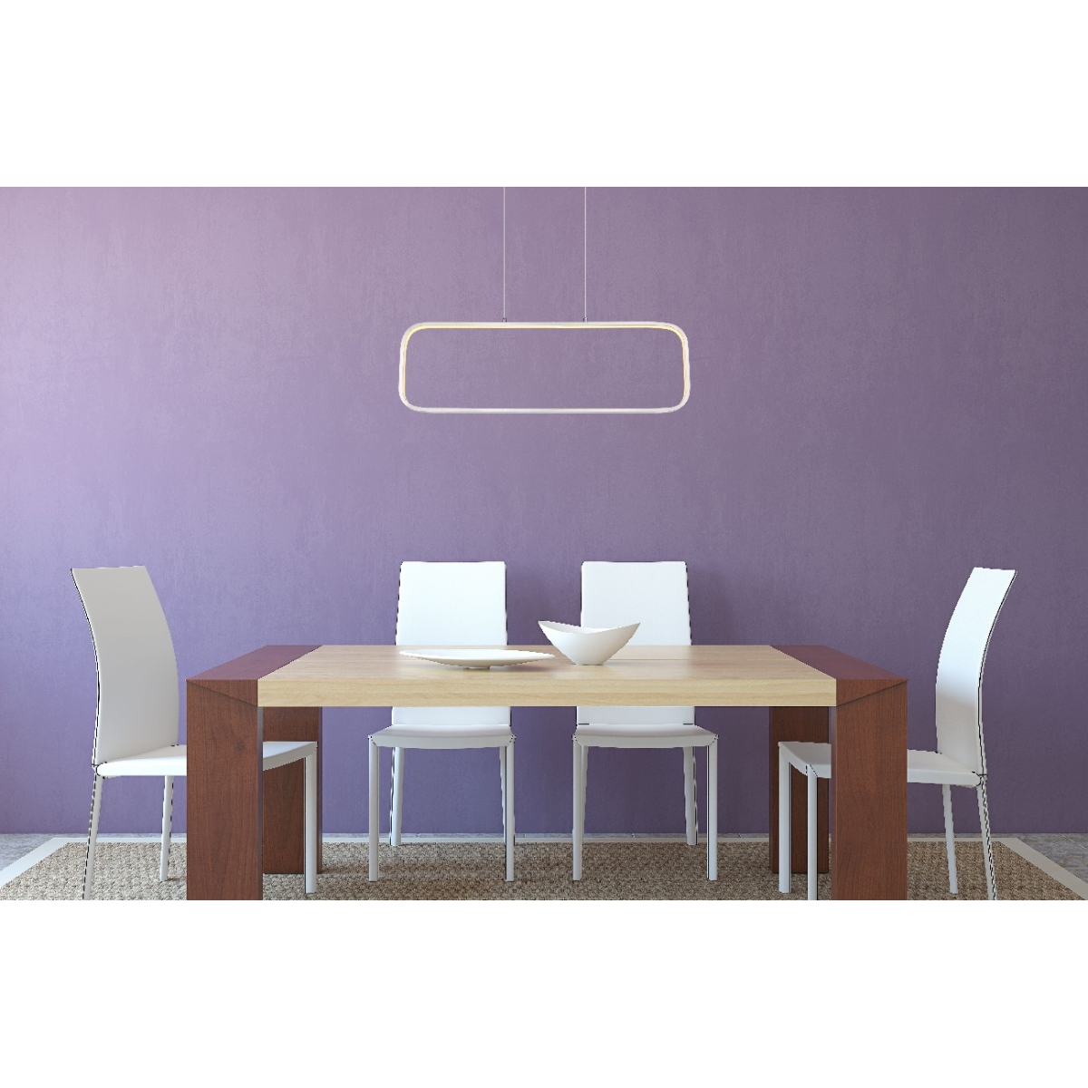 Ova izuzetno moderna visilica (80x10cm) serije SILLA impresionira svojim prelepim dizajnom. Od pravougaone plafonske osnove u srebrnoj boji, dva bela kabla sa maksimalnom visinom od 1,2 metra spuštaju se do oblikovanog pravougaonog belog rama sa integrisanom LED sijalicom koja prijatno sija 3000 Kelvina, topla bela svetlost i tako vašim sobama nudi odličnu atmosferu.