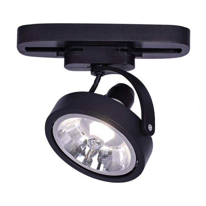 Šinski reflektor kružnog dizajna, u crnoj boji. Zahvaljujući rotaciji reflektora, kojom se svetlost usmerava prema vašim potrebama, na određeni deo ili objekat u enterijeru, kako bi ste dobili osvetljenje i ambijent po želji. Koristi jednu sijalicu tip AR111, sa grlom GU10 i montira se na takozvanu monofaznu šinu.