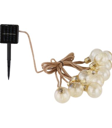 Ovo je solarni lanac koji je jednostavno obavezan detalj za vašu baštu ili terasu. LED sijalice pričvršćene za braon kanap napajaju se isključino solarnom energijom. Ovaj niz svetala ne samo da nudi magičnu igru svetlosti u sumrak, već i na dnevnom svetlu postavlja scenu za vaš spoljašnji prostor. Sa radnim vremenom od oko 8 sati i stepenom zaštite IP44, ovaj proizvod je dobro opremljen i ima dužinu od 5.7 m uključujući i kabl.