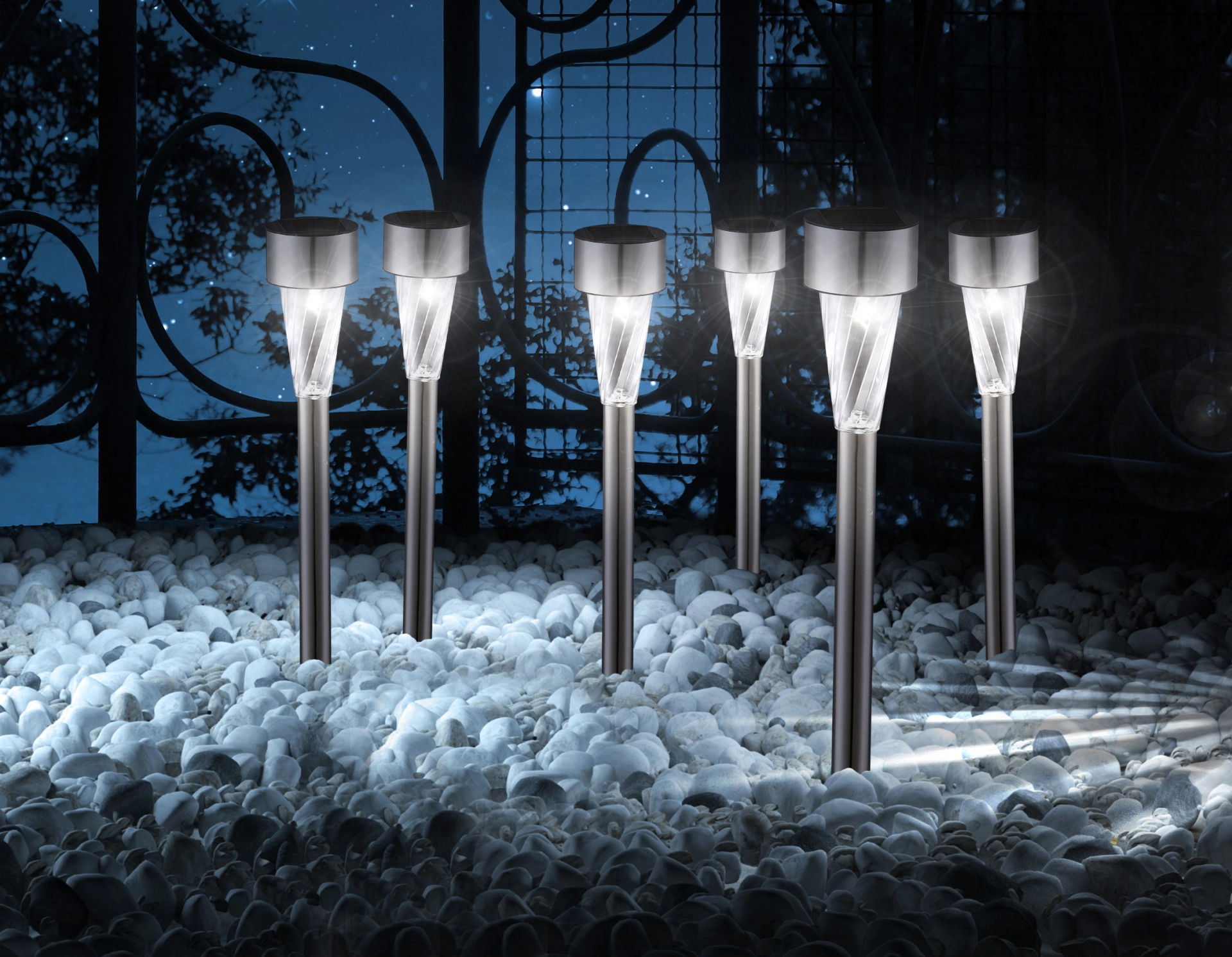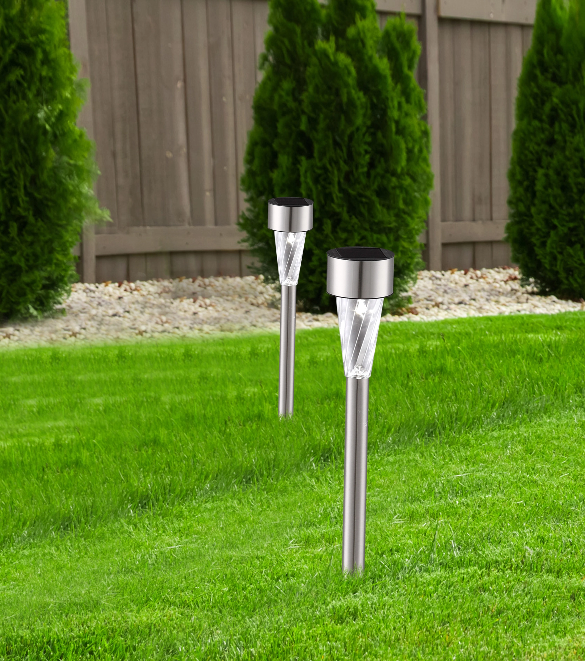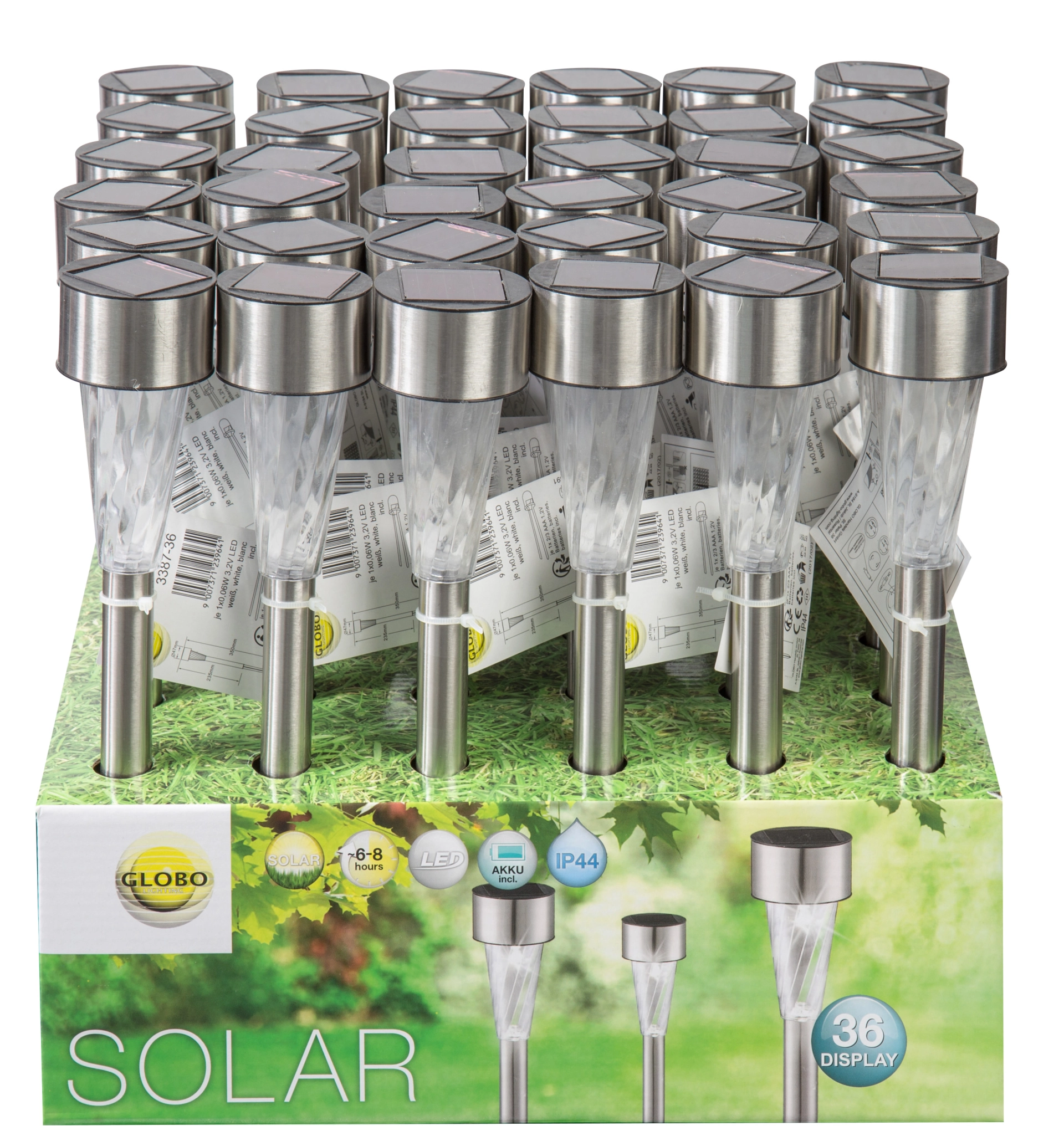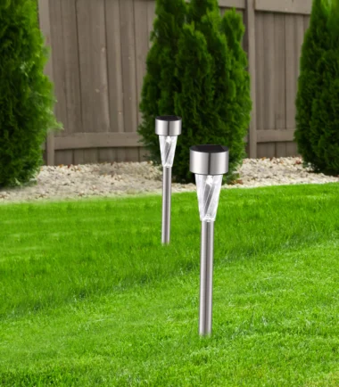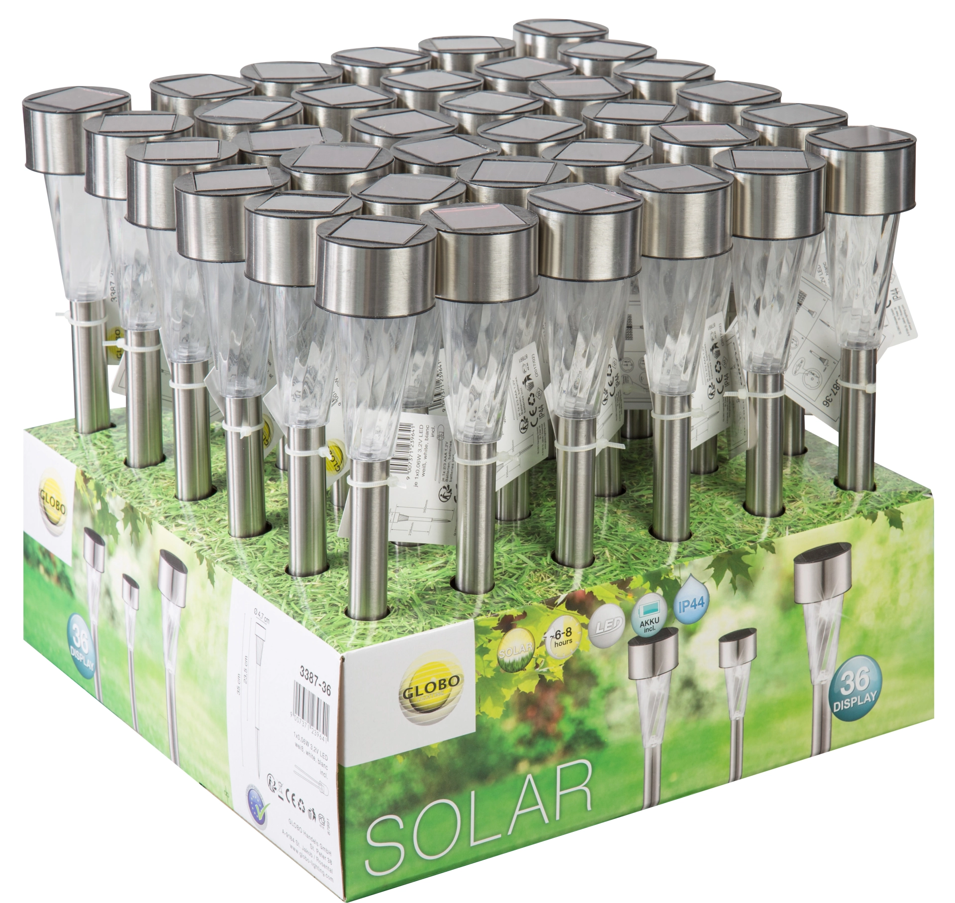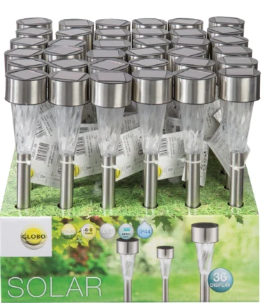 Ova solarna lampa od nerđajućeg čelika visine 35 cm uverava svojim jednostavnim, ali elegantnim dizajnom. Ova solarna lampa (Ø 4,7 cm) sa providnim plastičnim staklom donosi prelepe svetlosne efekte. Zahvaljujući uzemljenom vrhu, dekorativna lampa sa uključenom baterijom (Ni MH AAA 600mAh) može se pričvrstiti na baštu ili kao putokaz. Zahvaljujući stepenu zaštite IP44, ova spoljna svetiljka je savršena za vašu baštu i spoljašnji prostor. Ova solarna lampa je dostupna u pakovanju od 36 komada i osvetljava vašu baštu do 6 sati.