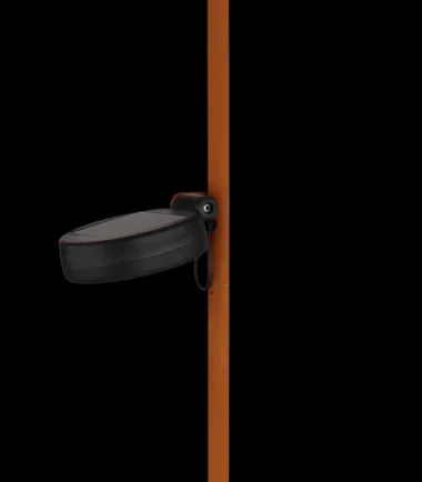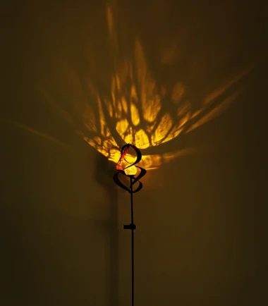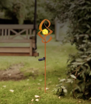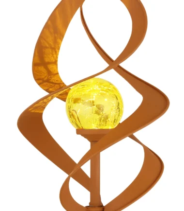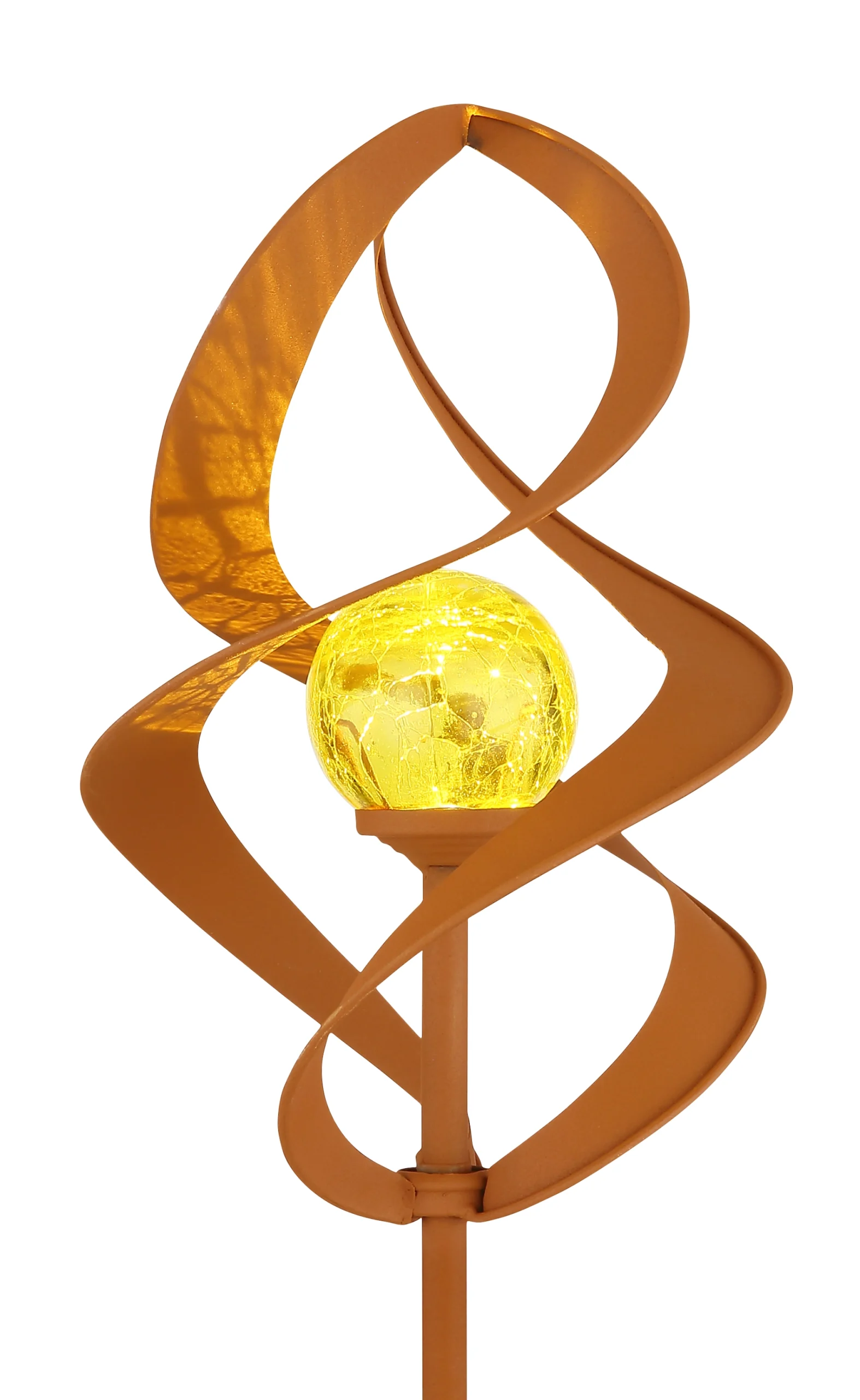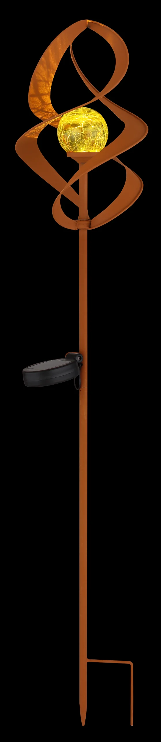 Ova dekorativna solarna lampa inspiriše svojim sjajnim dizajnom. Metalna šipka od 90 cm u bojama rđe viri sa vrha zemlje i završava se staklenom kuglom koja emituje toplo belu svetlost od 3000 Kelvina i time obezbeđuje prijatnu atmosferu. Skulptura kruži oko staklene kugle i rotira se na vetru. Pored toga, svetiljka ima stepen zaštite od prskanja vode IP44.