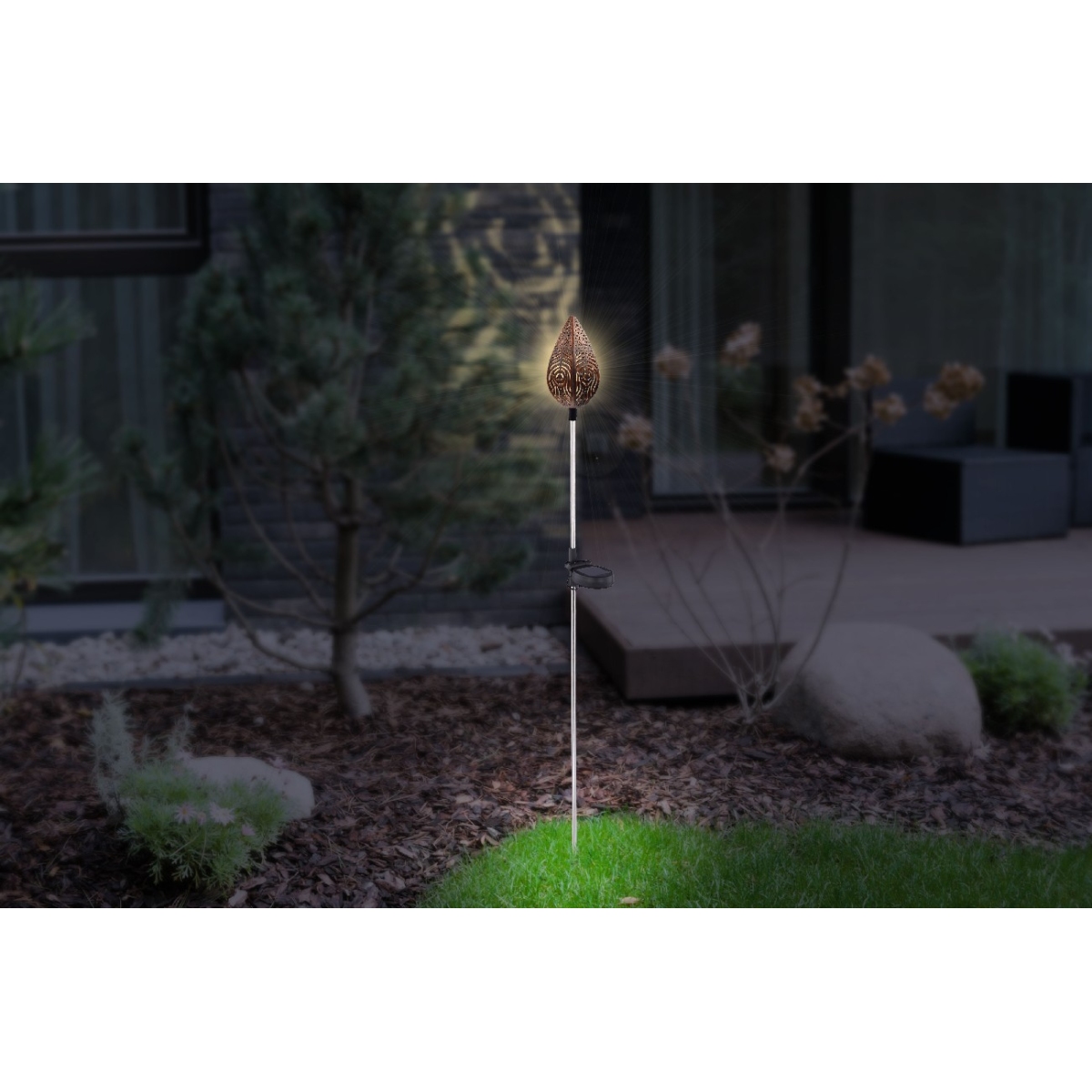 Ovo sjajno solarno svetlo inspiriše prelepim dizajnom. Šipka od nerđajućeg čelika prodire sa vrha zemlje i završava se na visini od 85 cm oblikovanim bakarnim abažurom sa odličnim ukrasnim detaljima. Pomoću integrisanog LED-a obezbeđuje 3000 Kelvina toplo belo svetlo i tako osigurava prijatnu atmosferu. Model ima prekidač za uključivanje ili isključivanje svetla. Zbog IP44 stepena zaštite od prskanja vode, savršeno je pogodan za upotrebu na otvorenom.